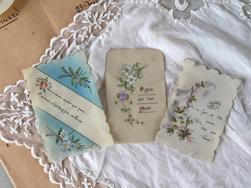Lot de trois petites cartes anciennes peintes à la main sur celluloïd, non écrites.