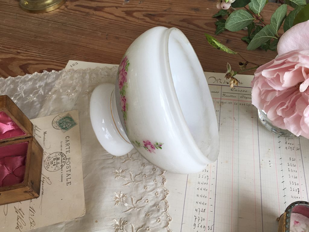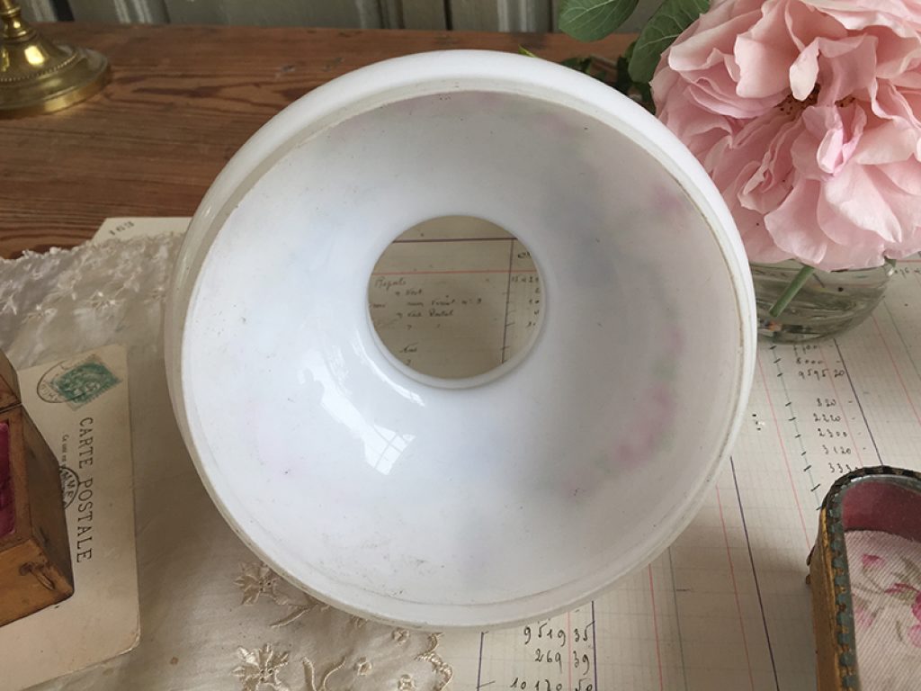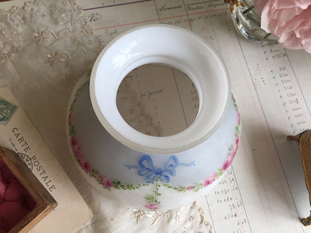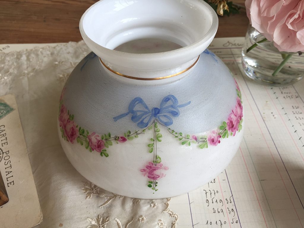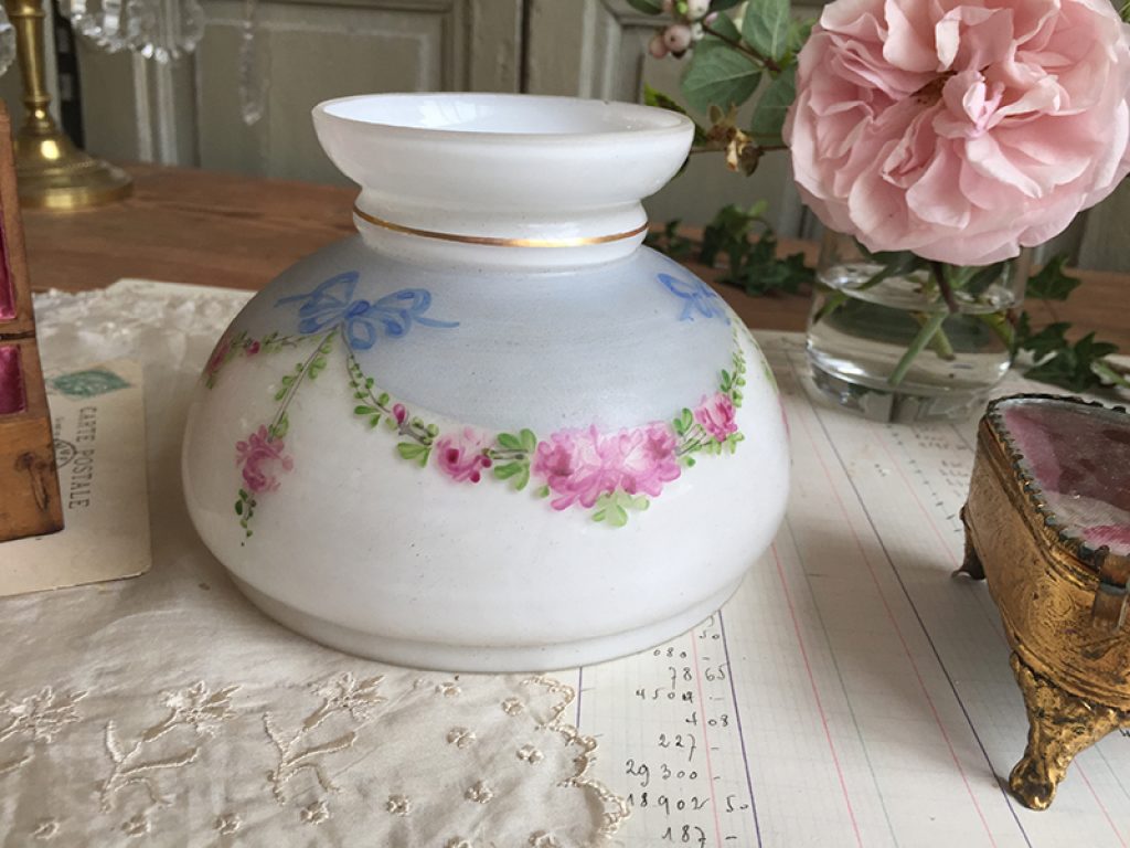 Petit abat jour ancien en verre peint à la main d’un joli décor de guirlandes de roses, à laisser en déco de charme !