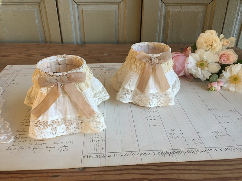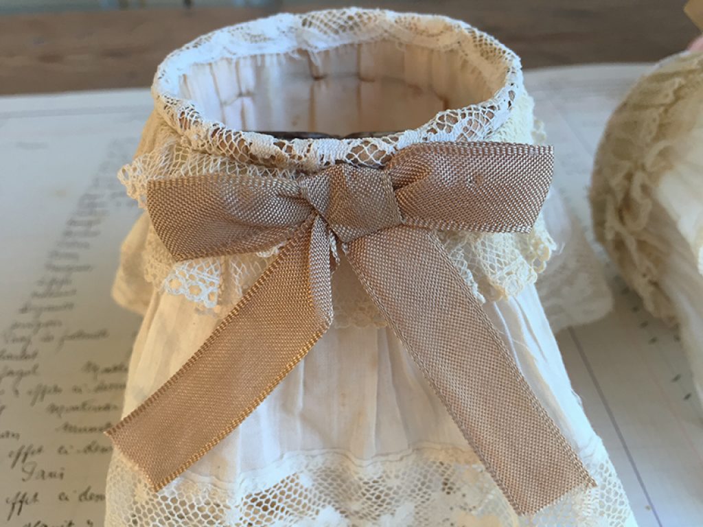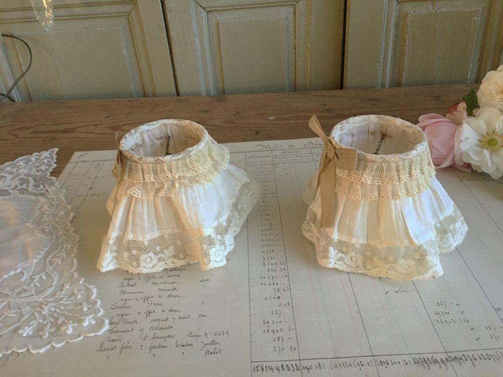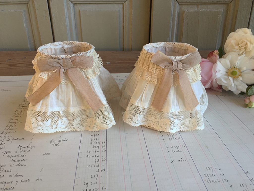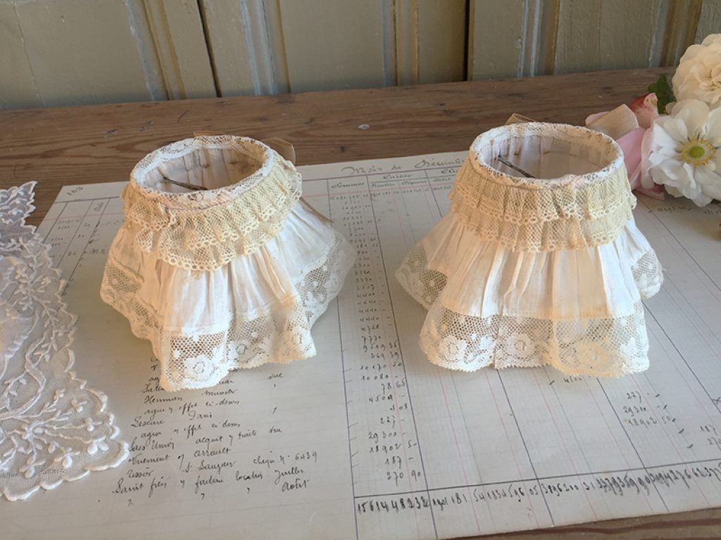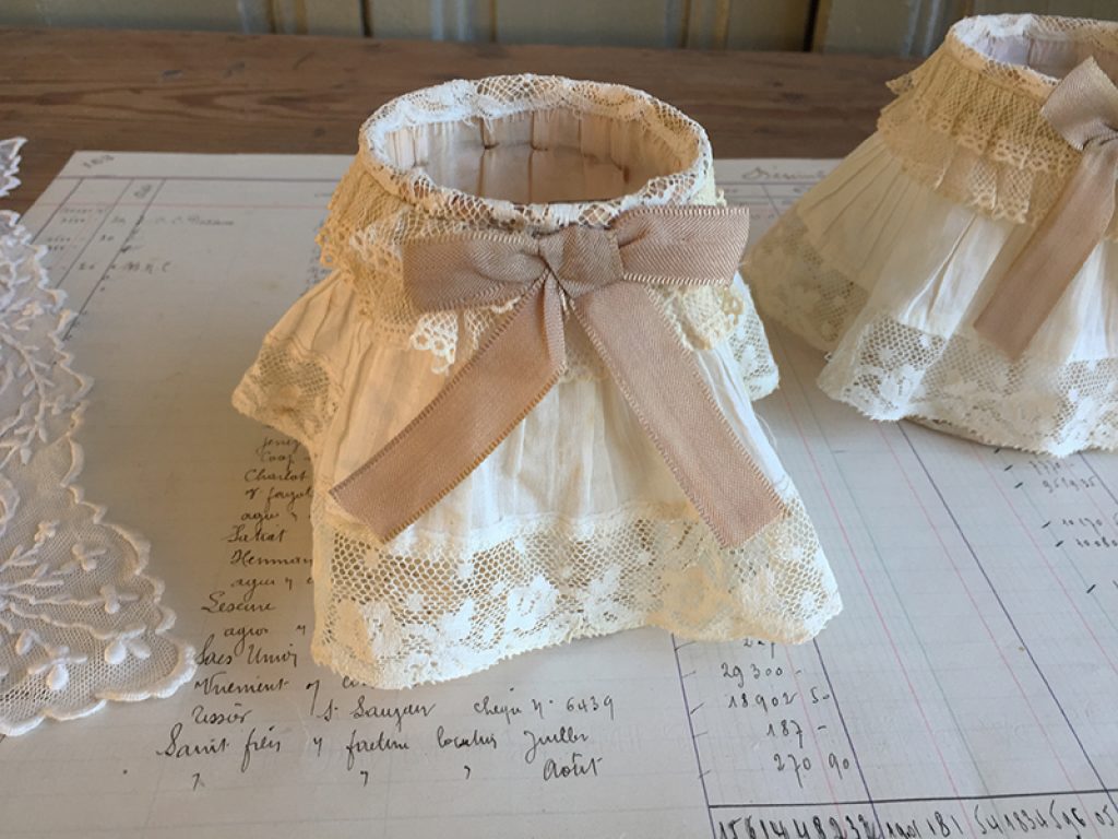 Deux petits abat-jours anciens à clipser sur une ampoule, revisités avec dentelles et rubans d’époque. Vendus à l’unité.