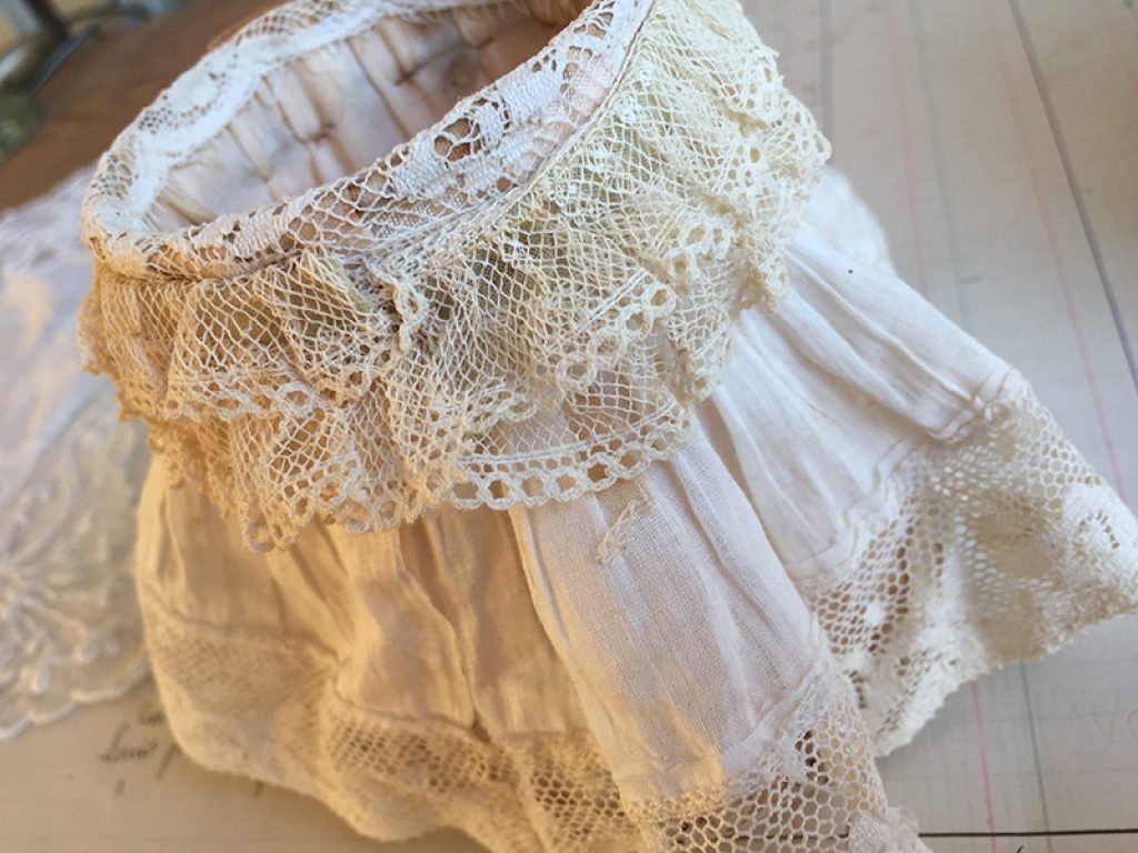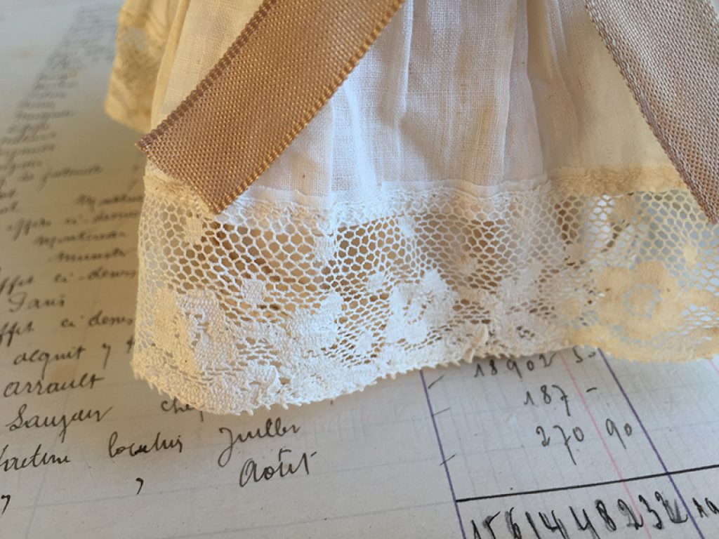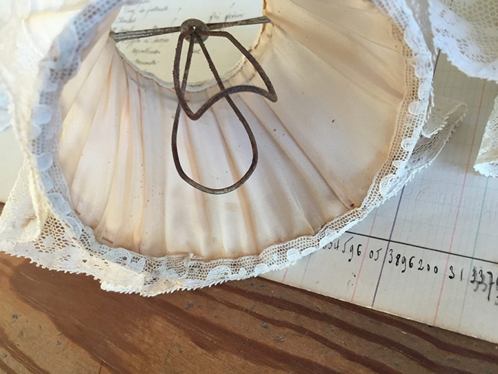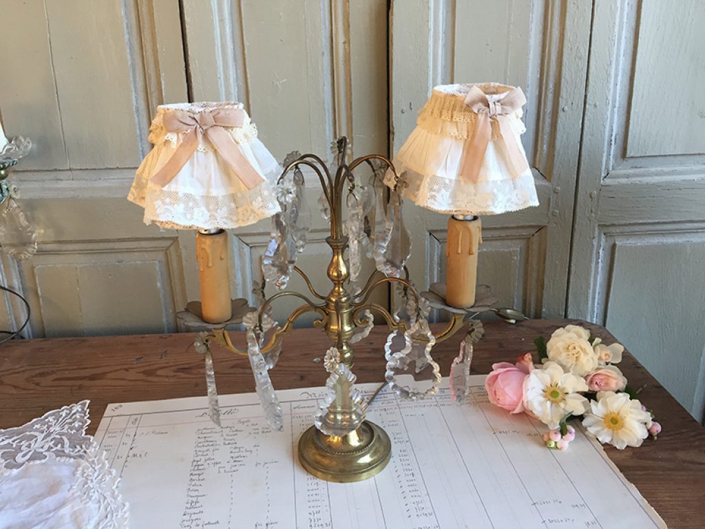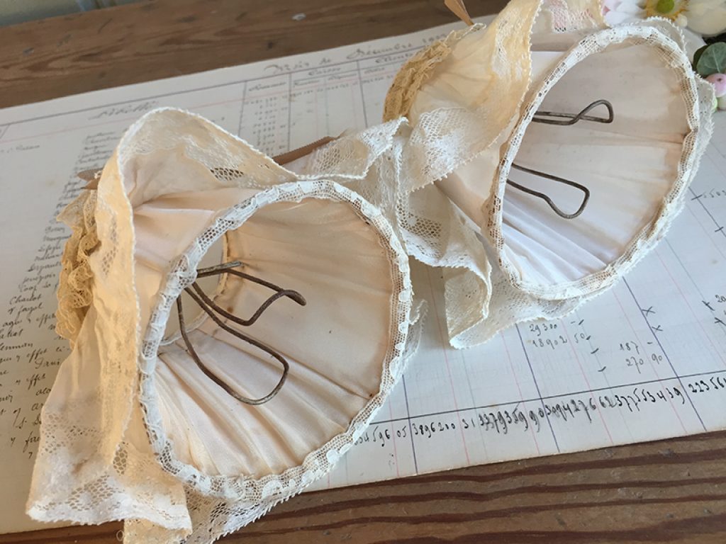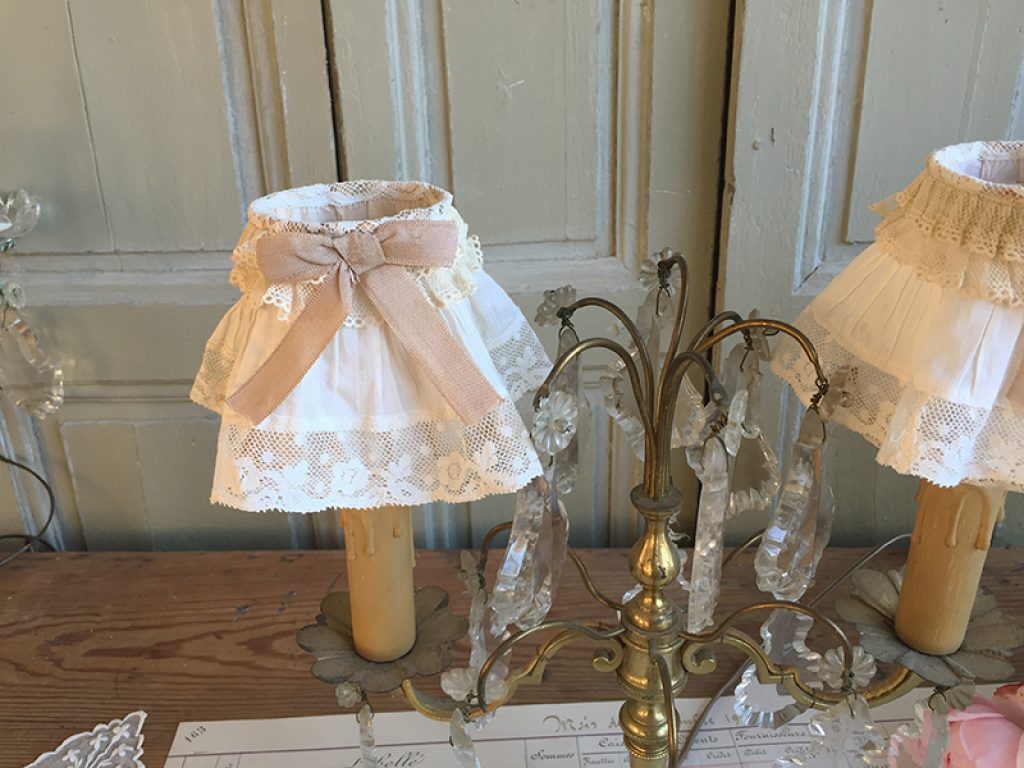 Deux petits abat-jours anciens à clipser sur une ampoule, revisités avec dentelles et rubans d’époque. Vendus à l’unité.