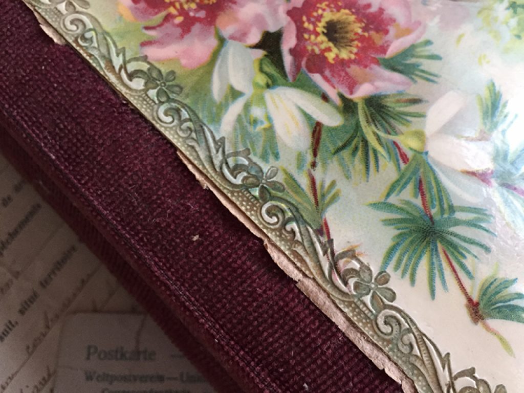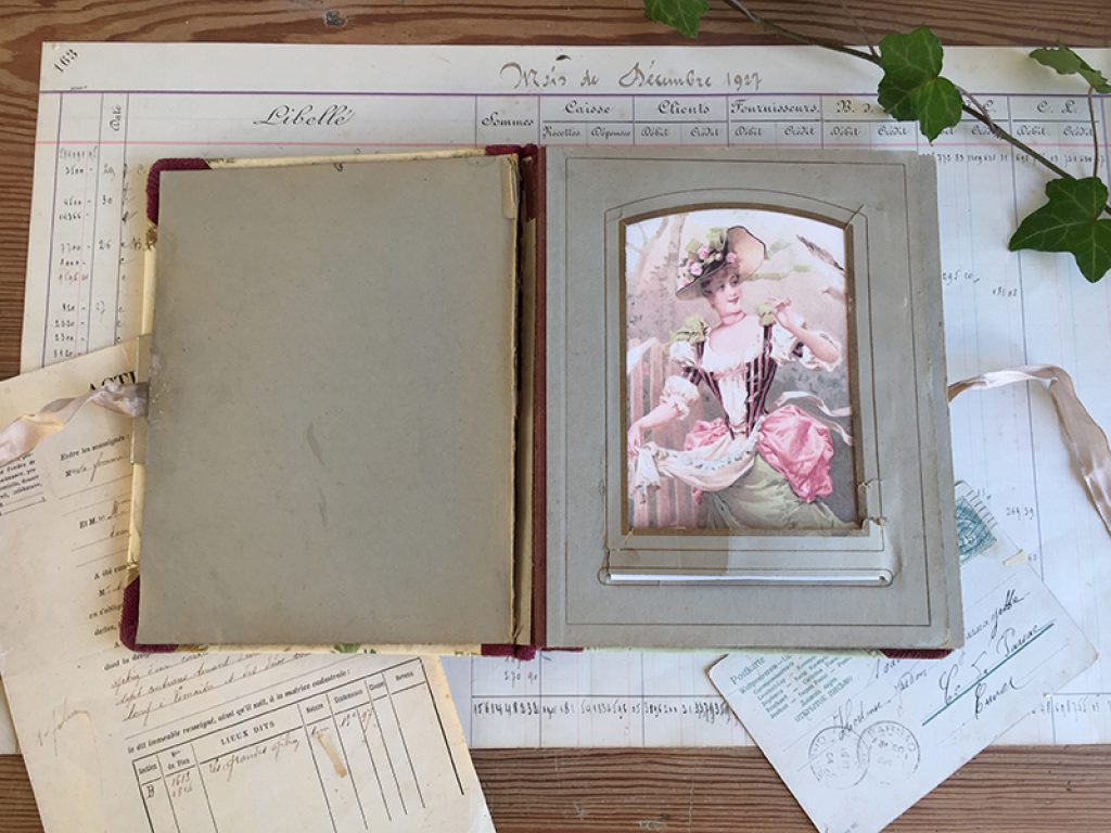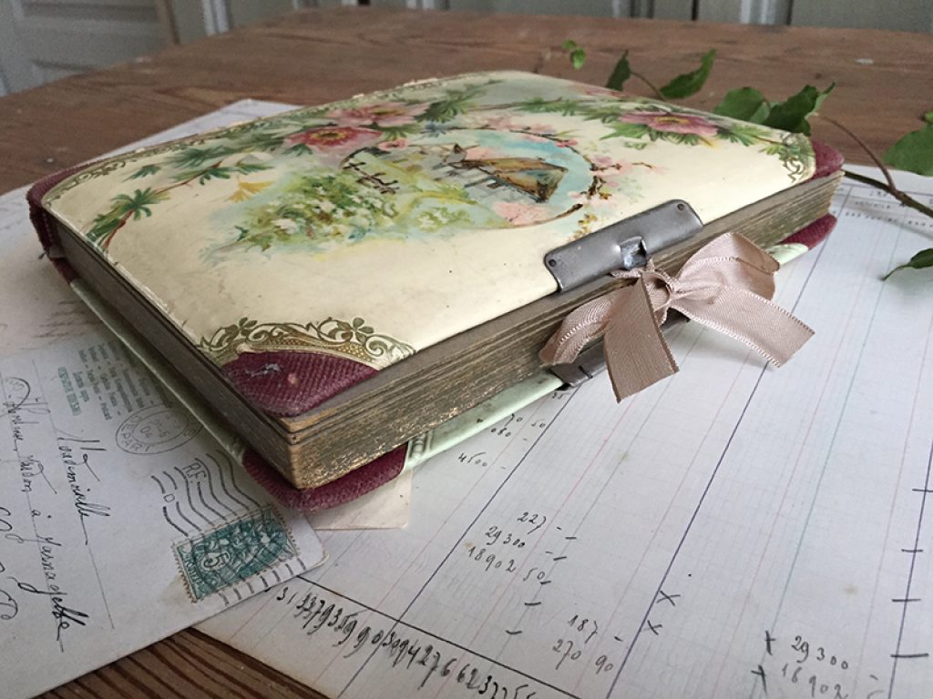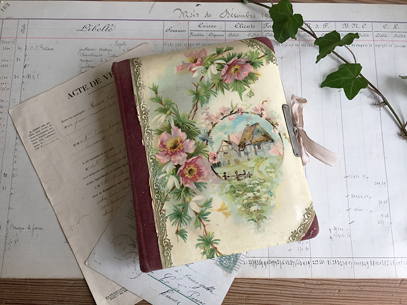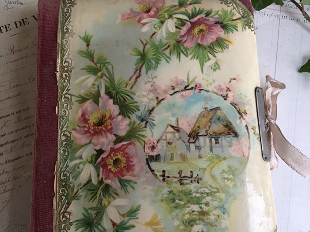 Ancien album photo avec jolie couverture décor roses et paysage, garni d’une reproduction d’image et de deux photos d’époque. Il n’a plus sa fermeture d’origine, remplacée par un ruban. Déchirures ou parties manquantes sur le papier à l’intérieur, 10 pages.