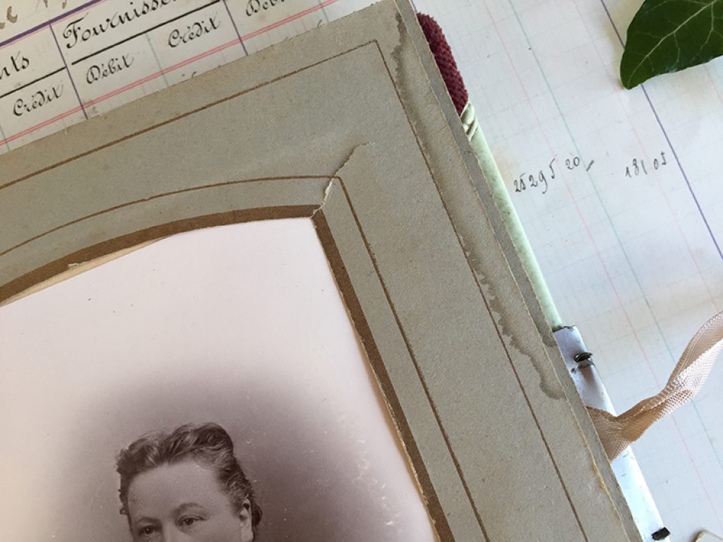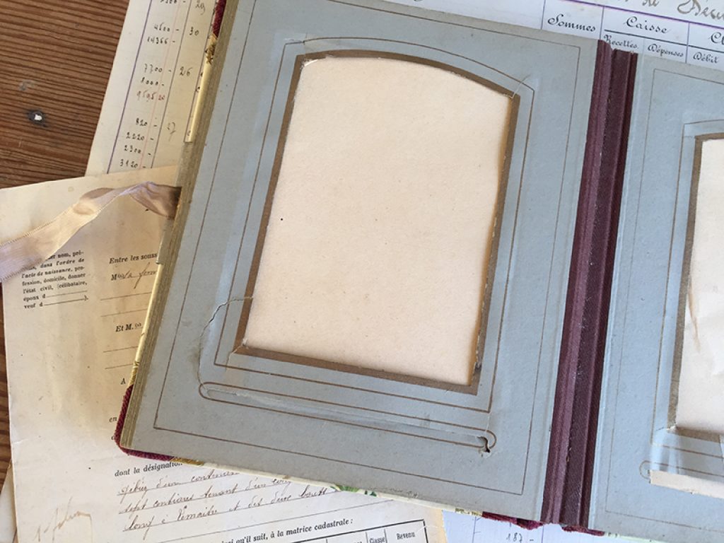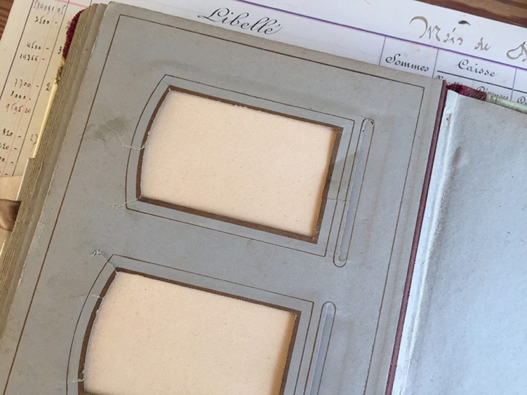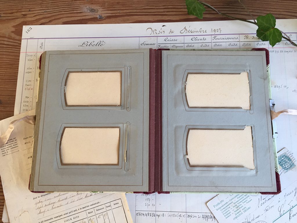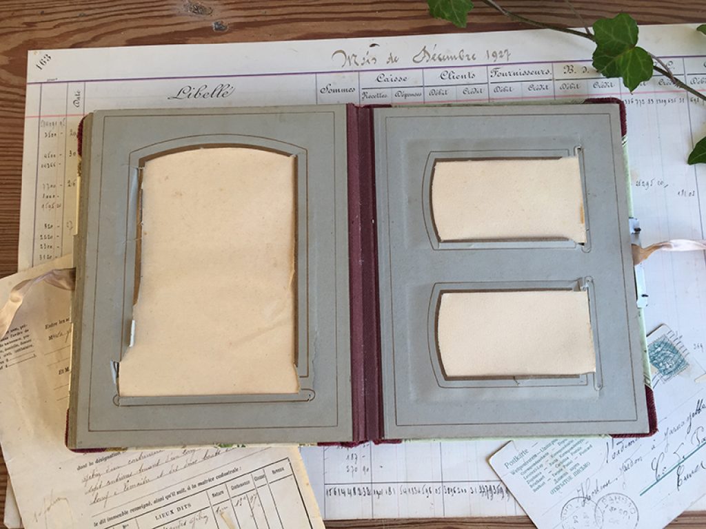 Ancien album photo avec jolie couverture décor roses et paysage, garni d’une reproduction d’image et de deux photos d’époque. Il n’a plus sa fermeture d’origine, remplacée par un ruban. Déchirures ou parties manquantes sur le papier à l’intérieur, 10 pages.