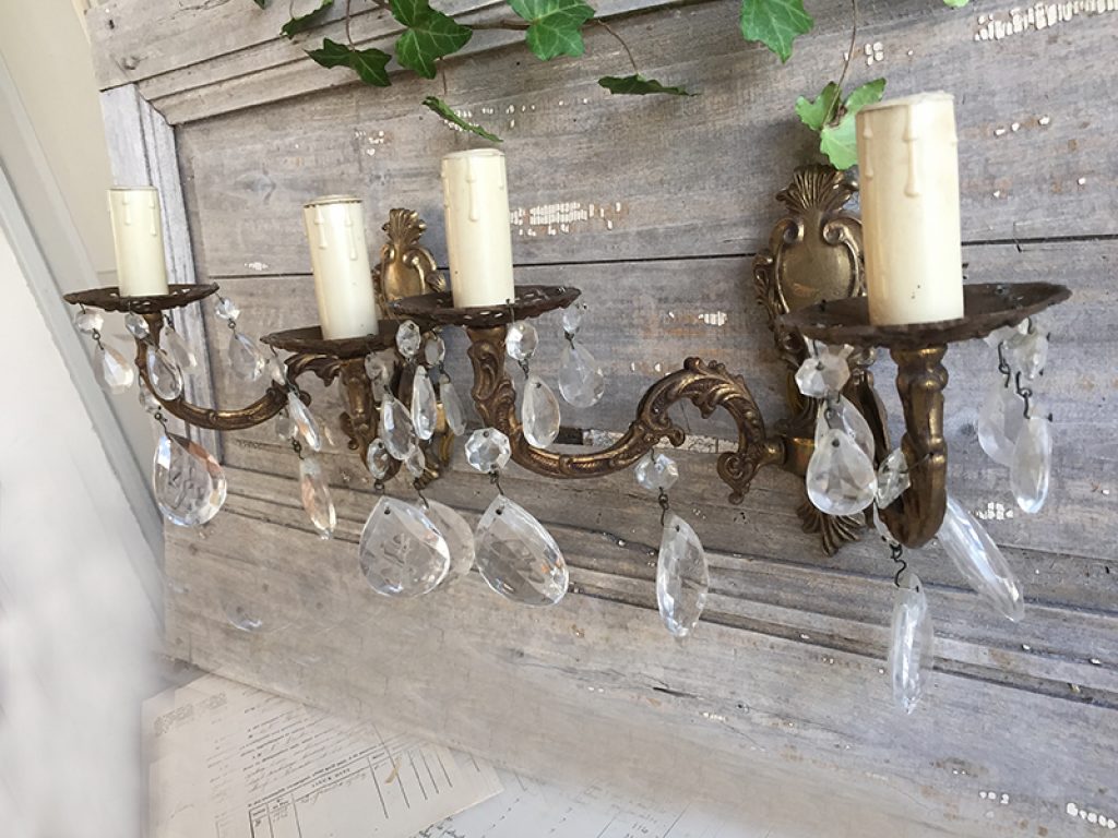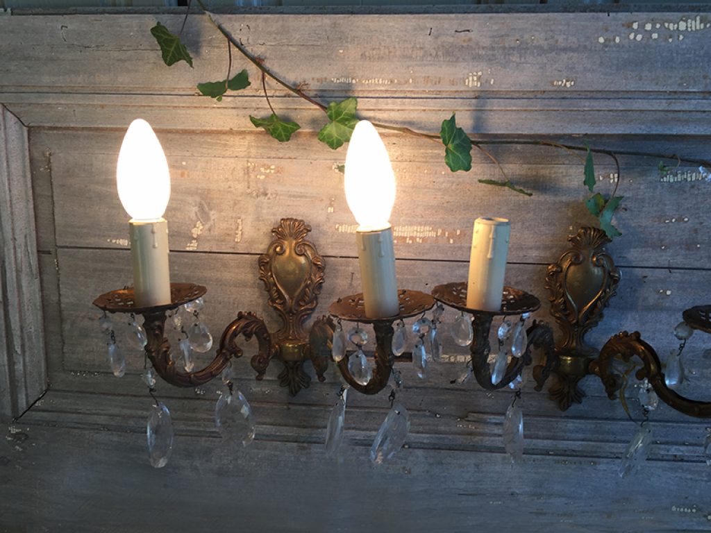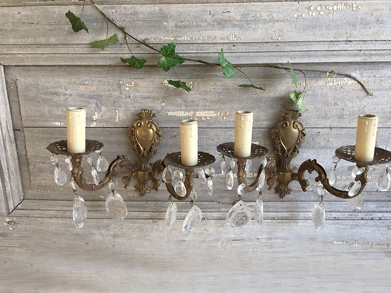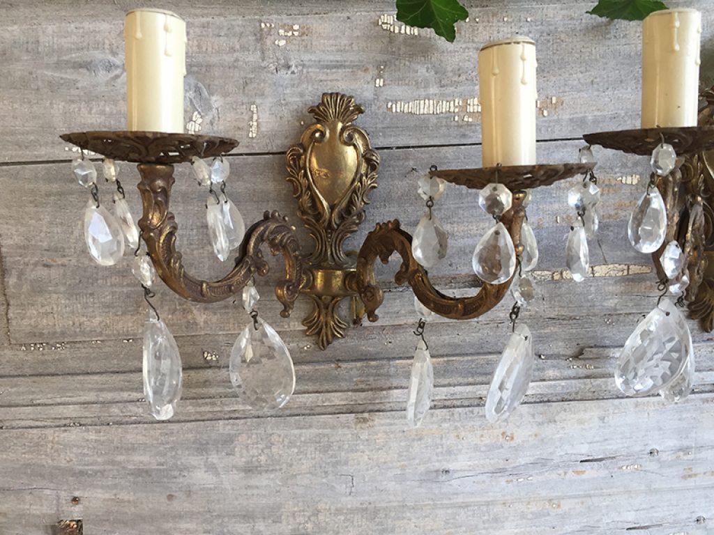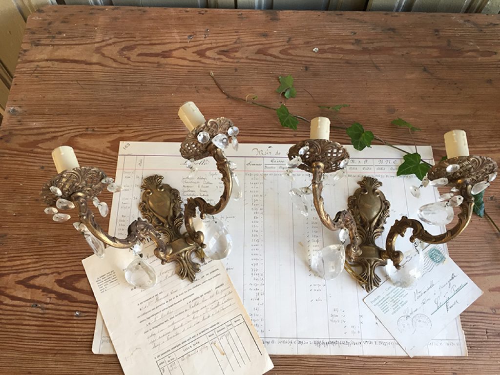 Deux anciennes appliques en métal doré, vendues séparément. Garnies chacune de toutes leurs pampilles. Electricité d’origine.