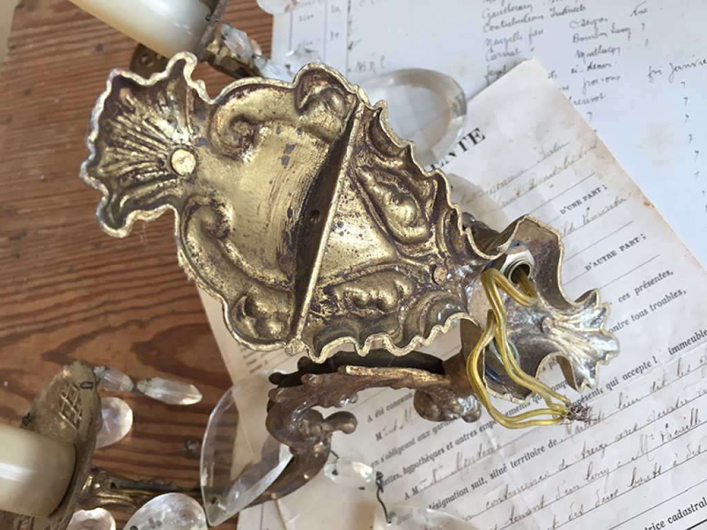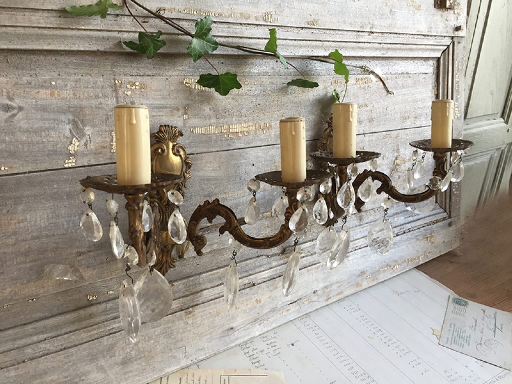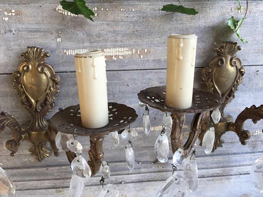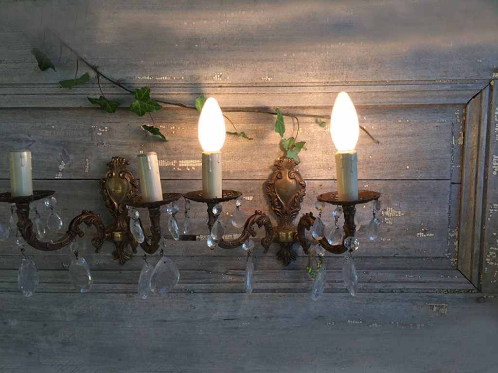 Deux anciennes appliques en métal doré, vendues séparément. Garnies chacune de toutes leurs pampilles. Electricité d’origine.