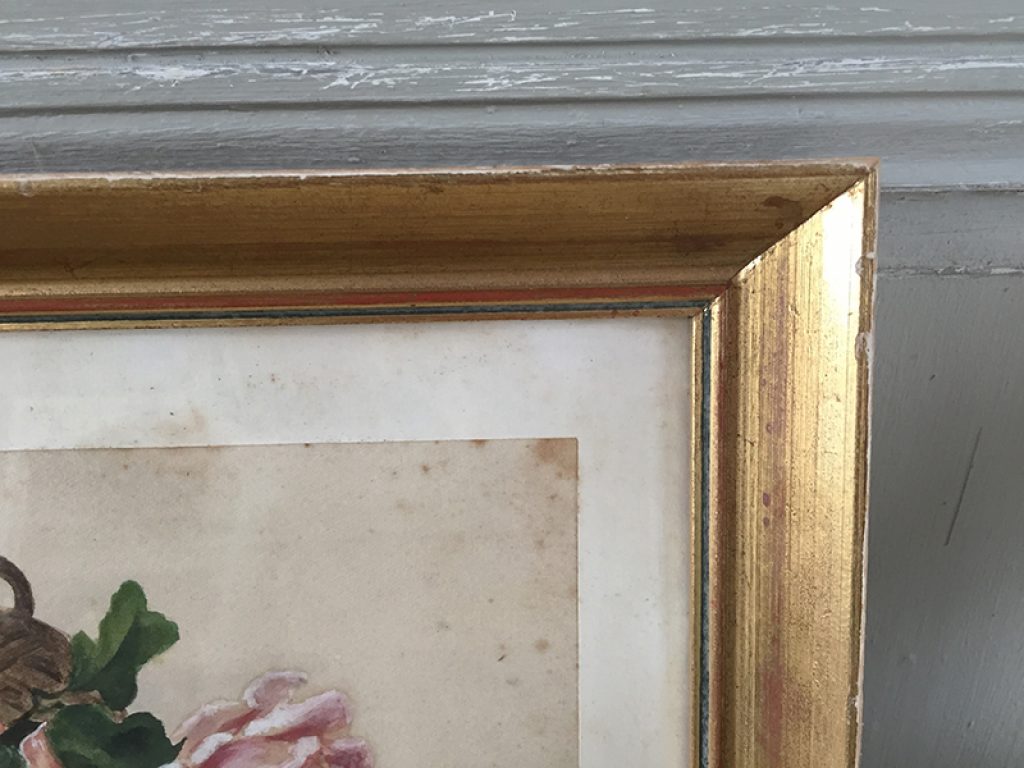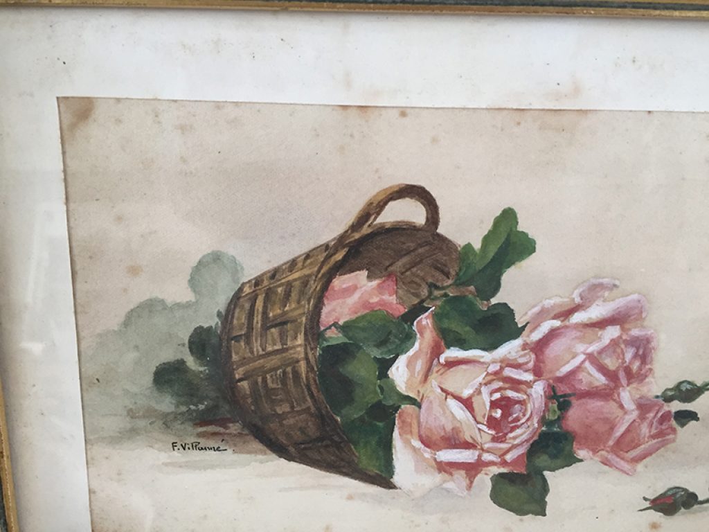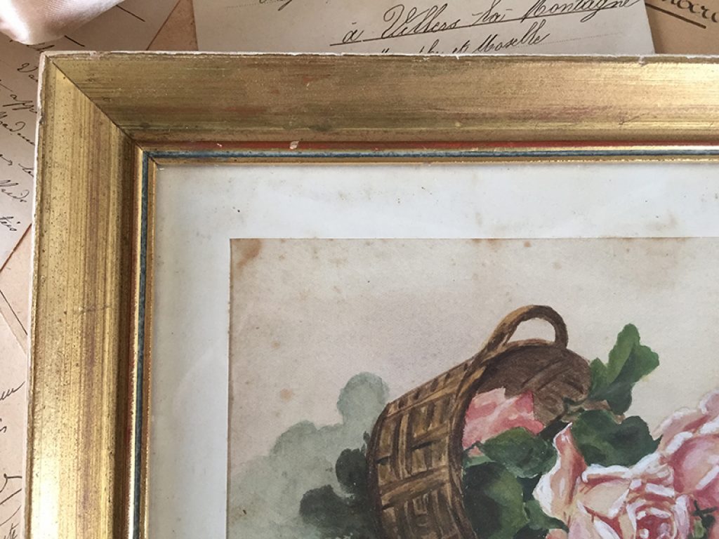 Ancienne aquarelle sous verre dans son cadre d’origine, en bois doré. Joli décor de panier de roses, comportant quelques taches dues au temps passé. Traces d’usage sur le cadre, plus de dorure sur les cotés.