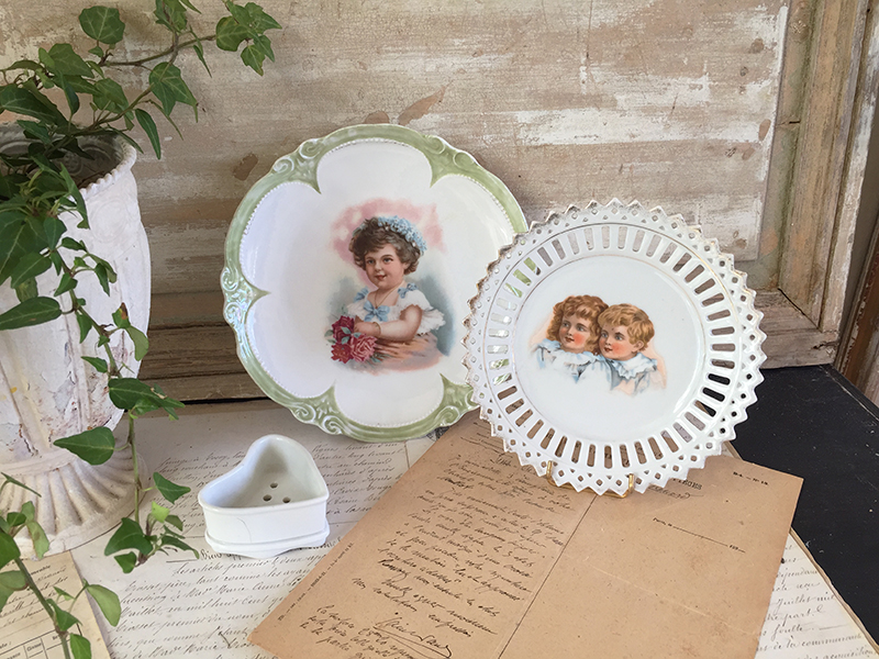 Deux anciennes assiettes en porcelaine, vendues séparément, aux charmants décors enfantins. Adorables et peu courantes !
