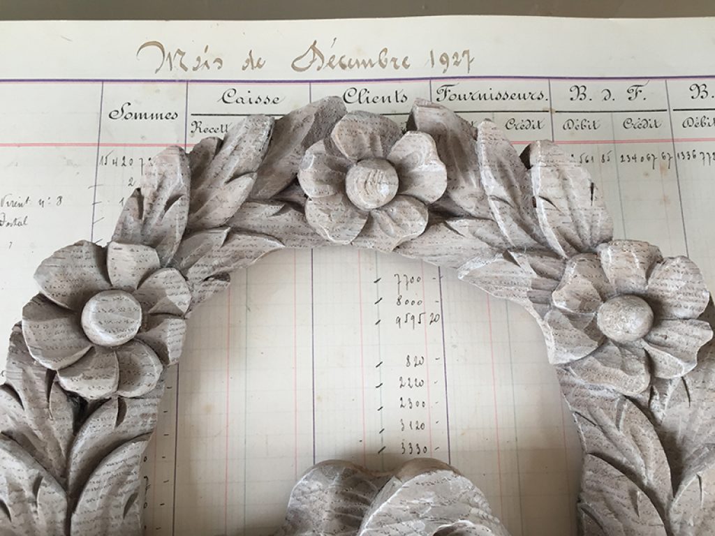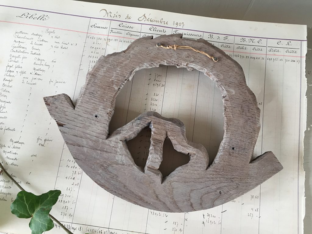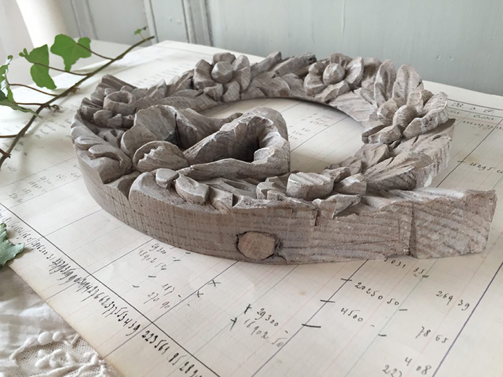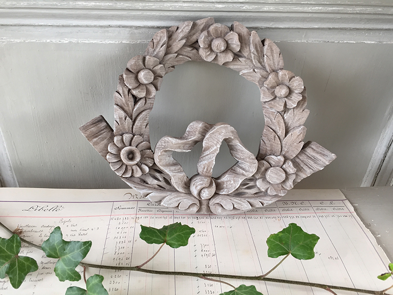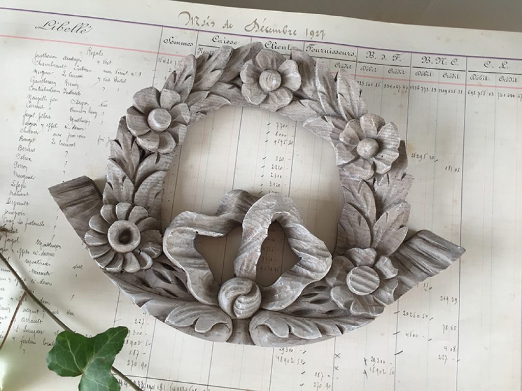 Petite boiserie ancienne en bois naturel blanchi, à accrocher comme un tableau ou à fixer sur un meuble. Joli décor de fleurs et ruban.