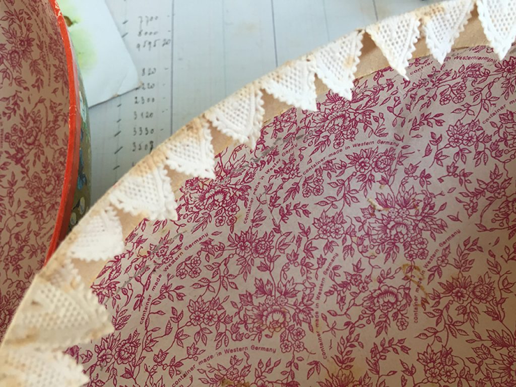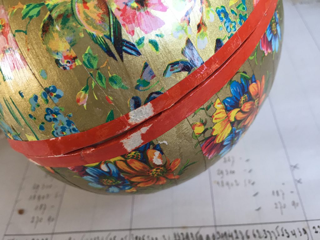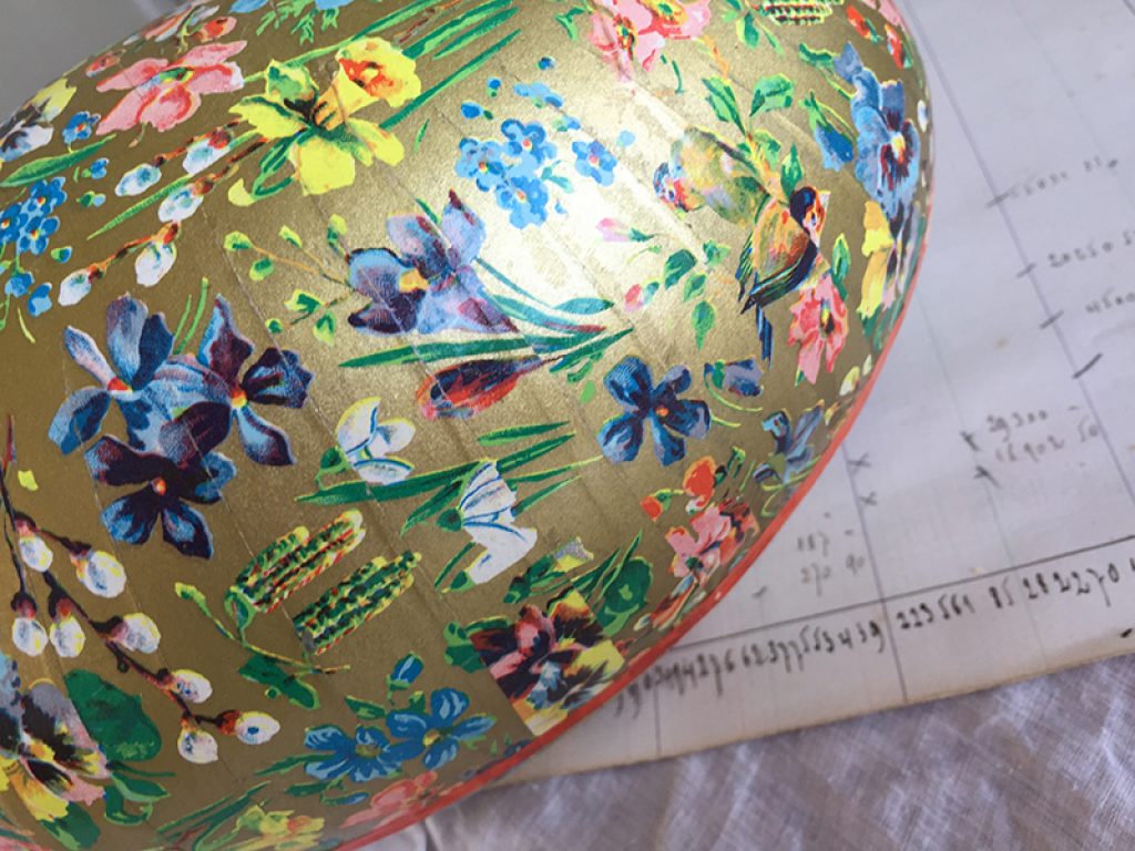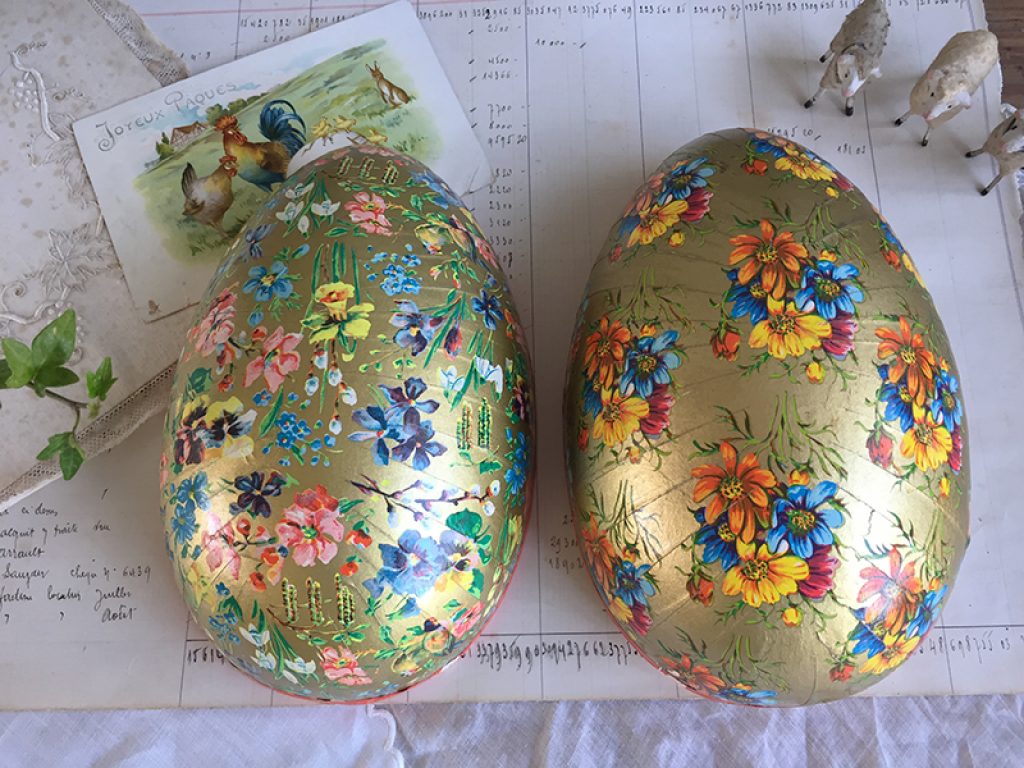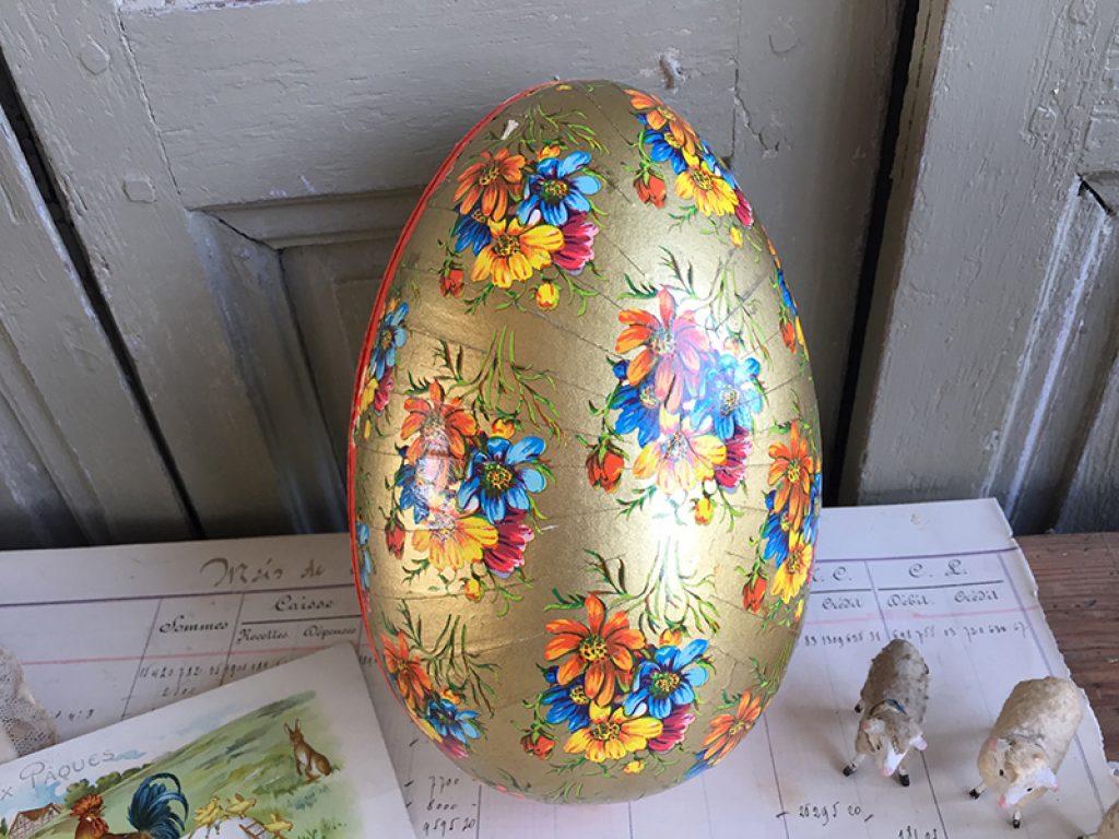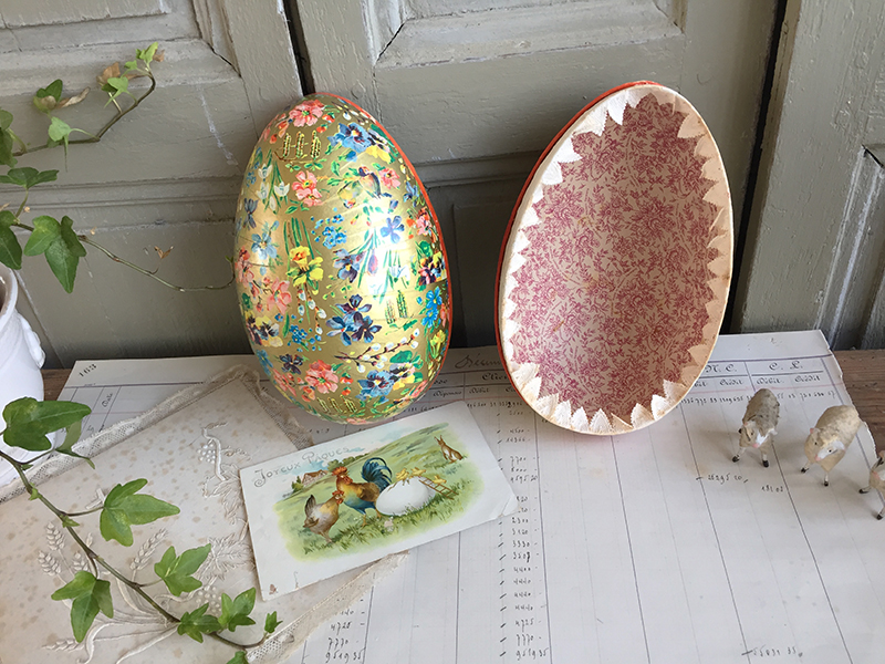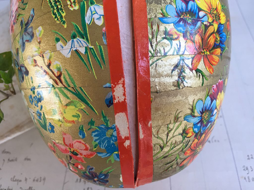 Boite en carton en forme d’œuf, avec dentelle en papier à l’intérieur. Deux faces avec décors différents. A garnir de friandises ! Petits manques sur le bord