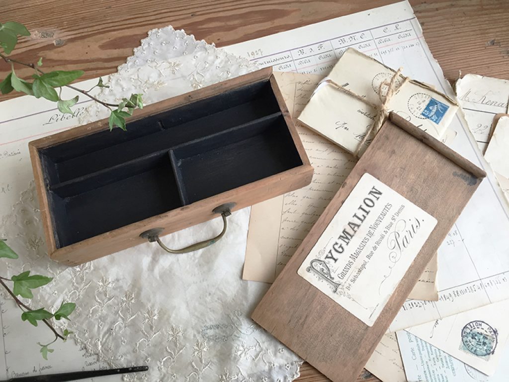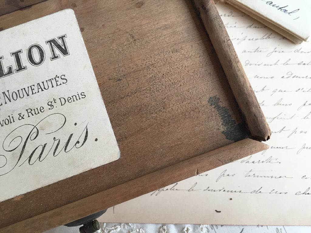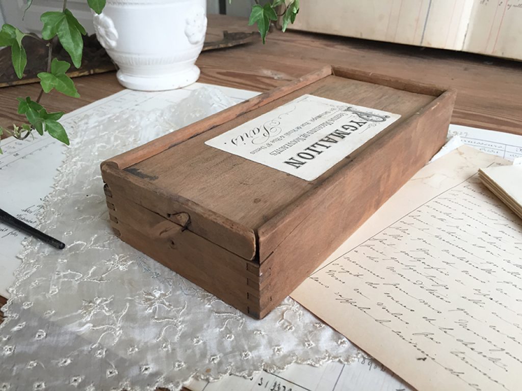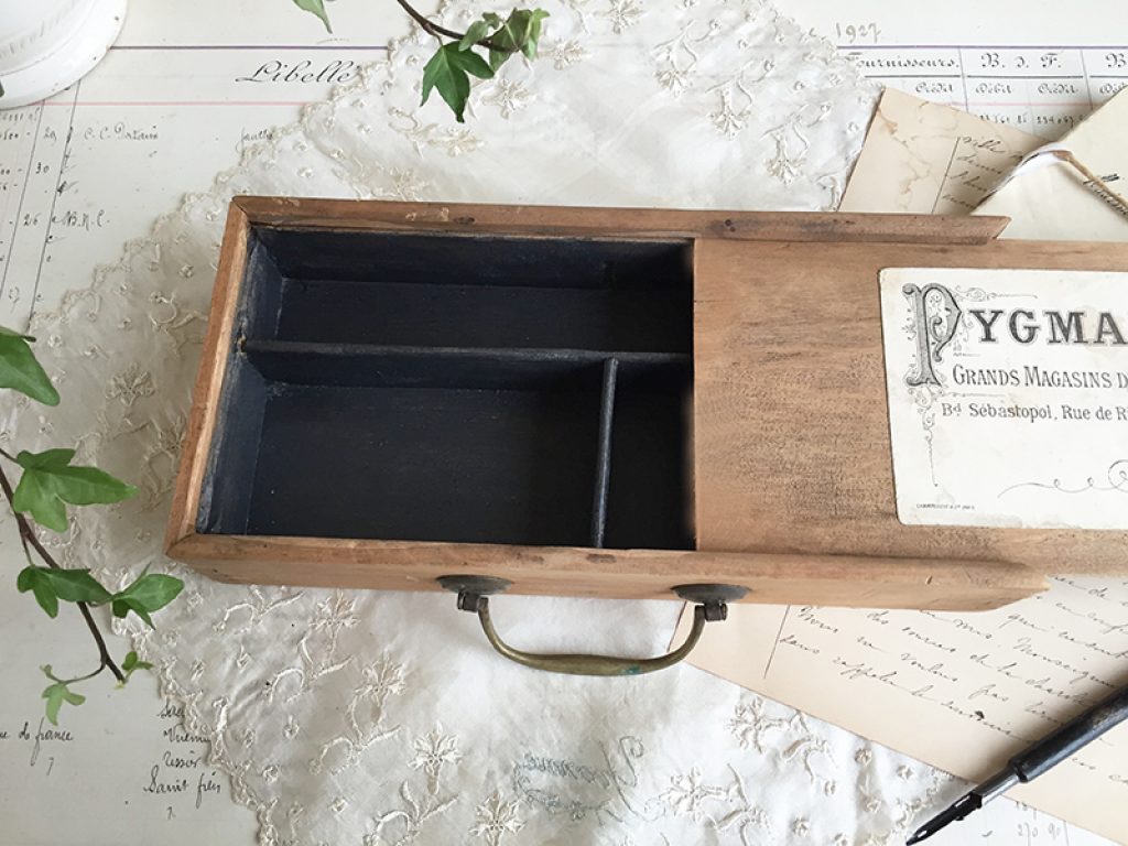 Ancienne boite compartimentée en bois avec jolie poignée en laiton et couvercle coulissant, agrémenté d’une publicité d’époque. Une restauration sur un coté. 23 x 11 x 4.5 cm