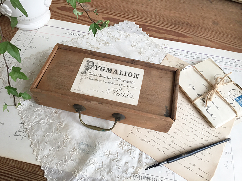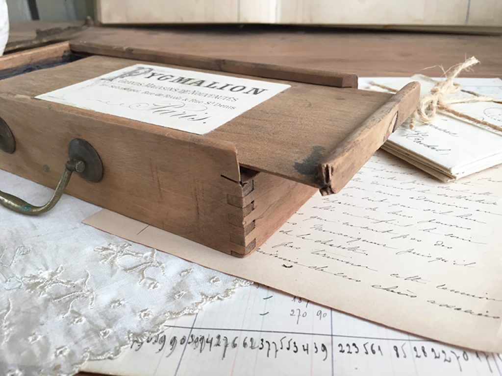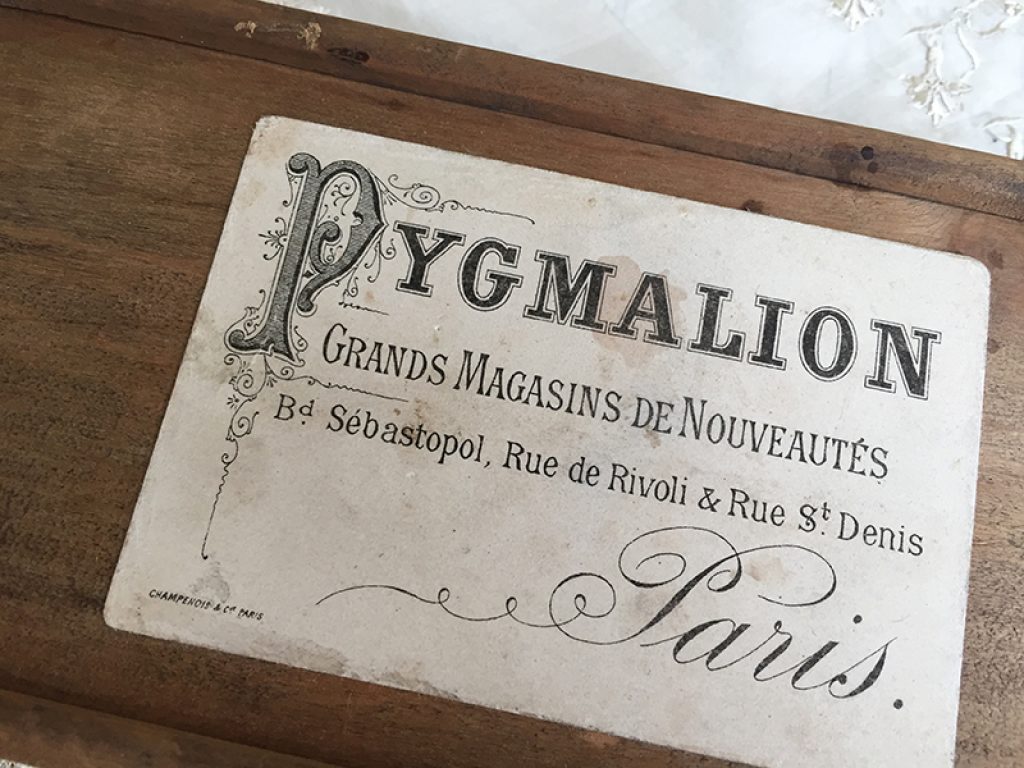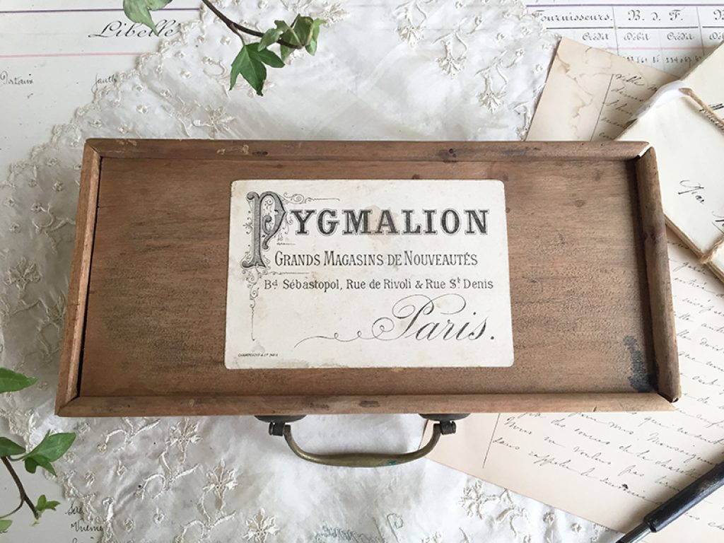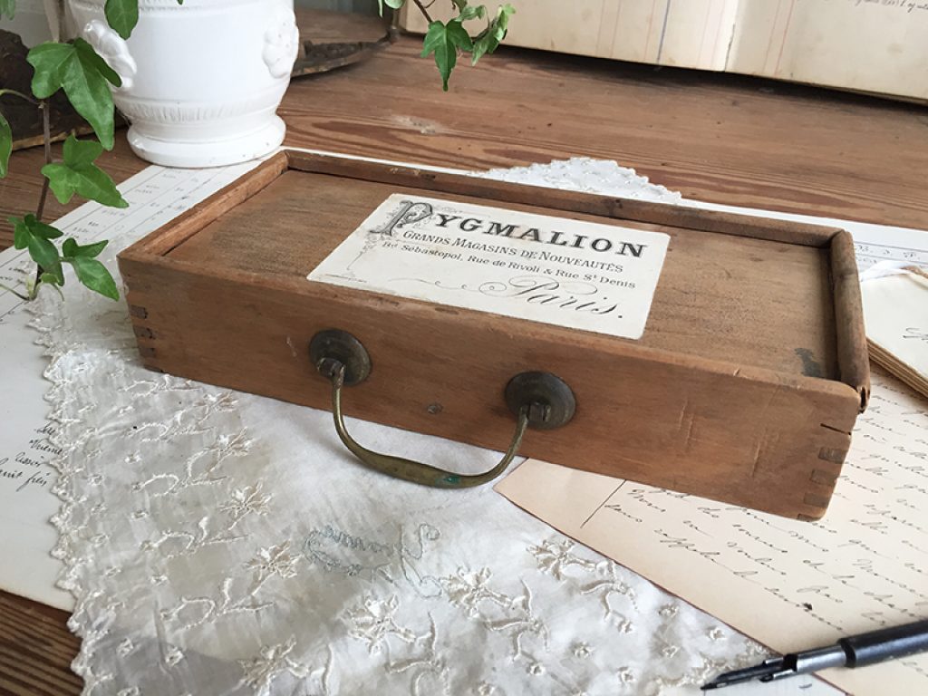 Ancienne boite compartimentée en bois avec jolie poignée en laiton et couvercle coulissant, agrémenté d’une publicité d’époque. Une restauration sur un coté. 23 x 11 x 4.5 cm