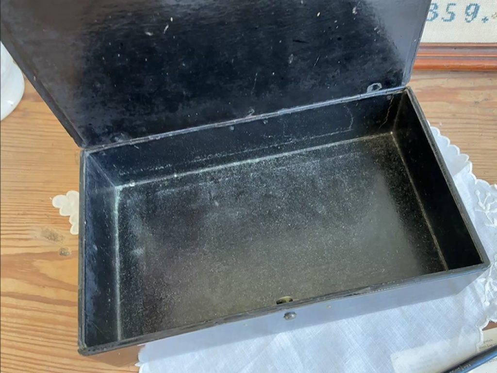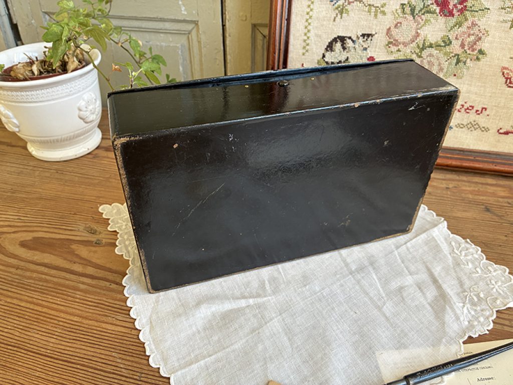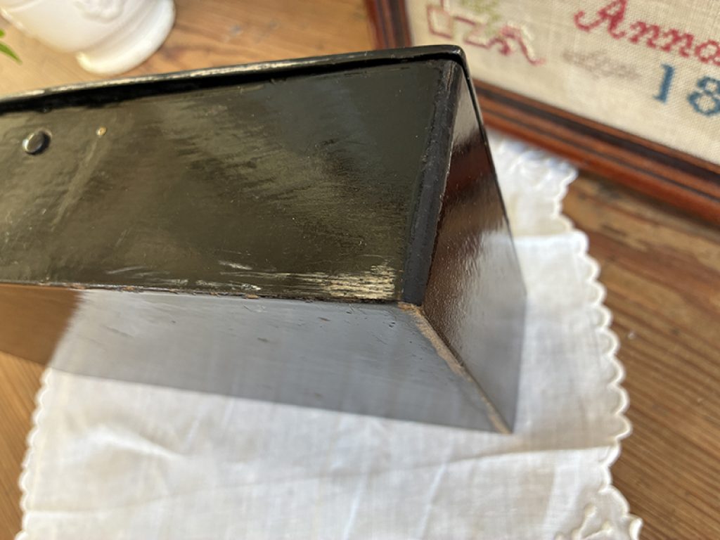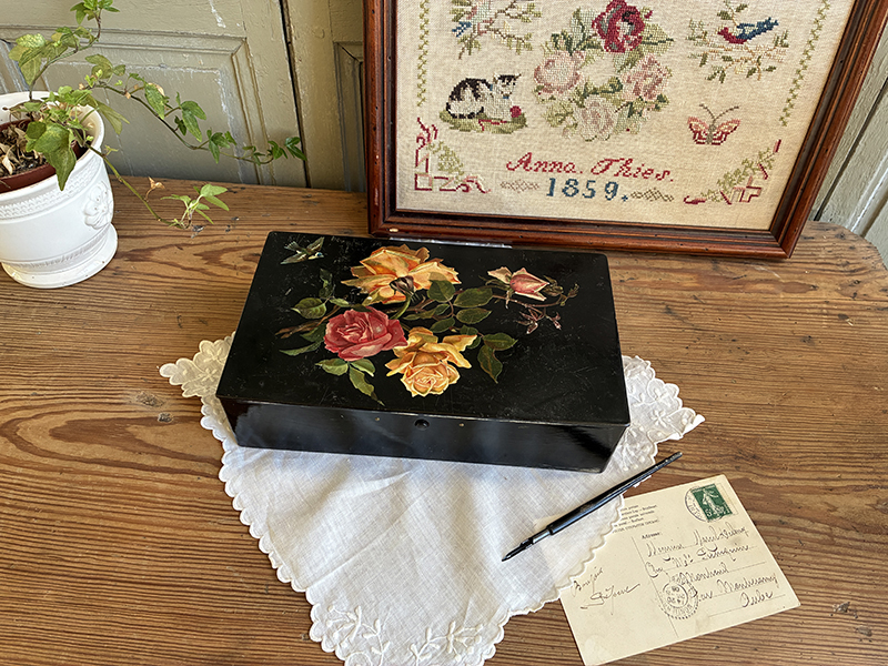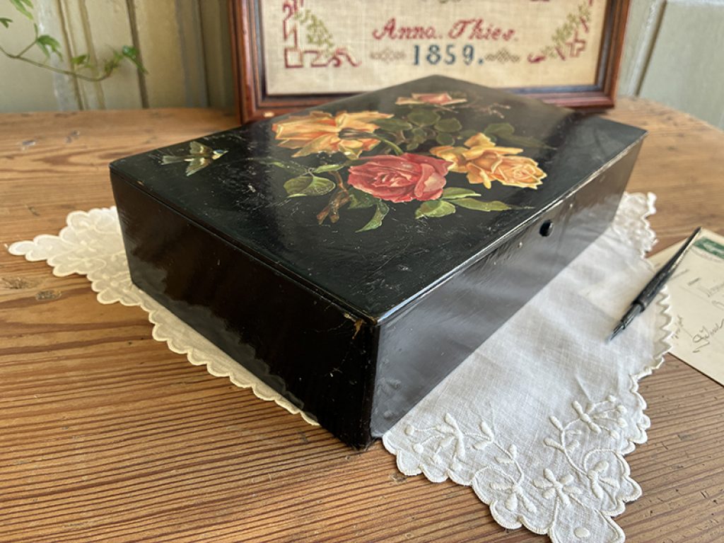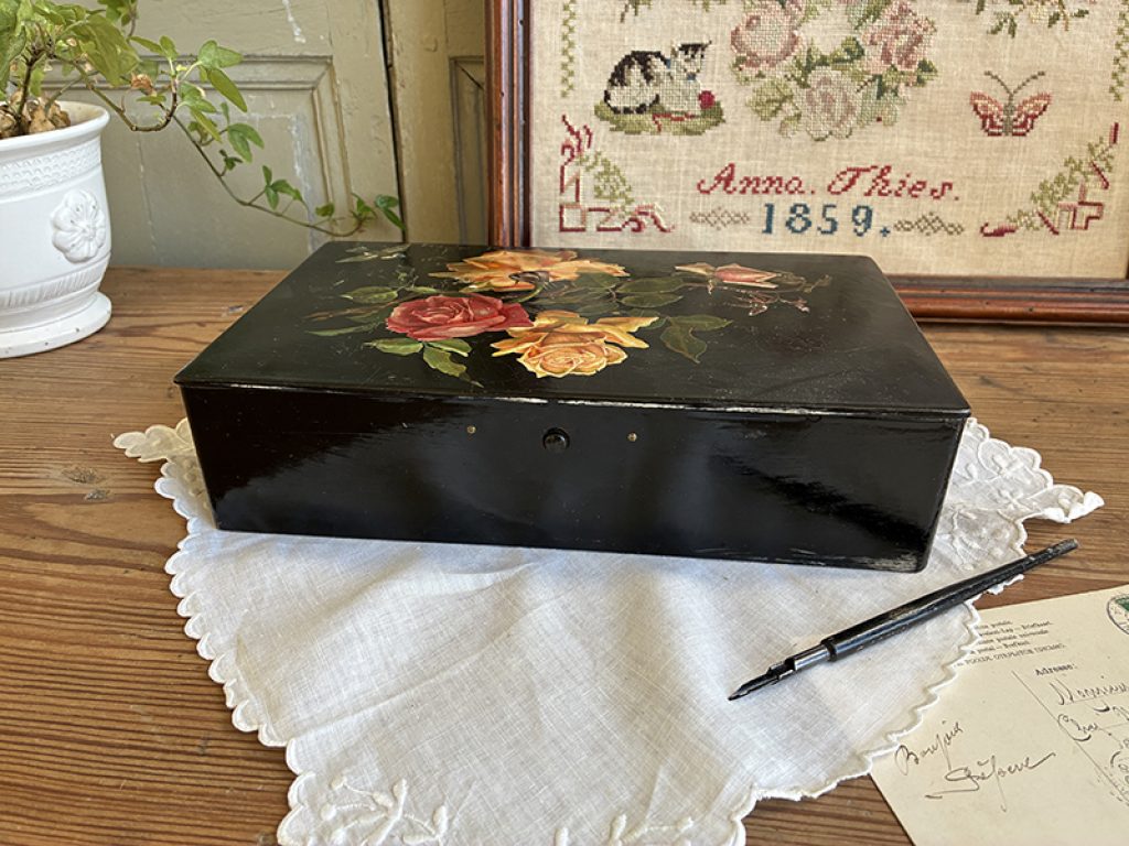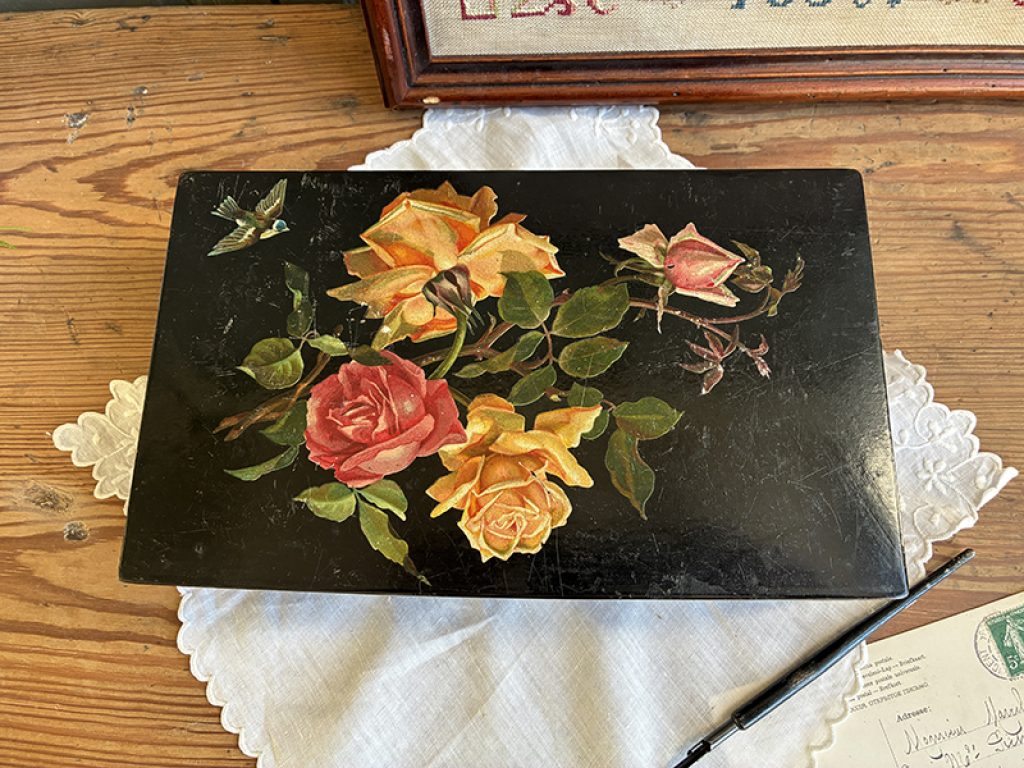 Elégante boite ancienne en carton bouilli, avec joli décor de roses et oiseau. Légères traces d’usage, fermeture fonctionnelle.