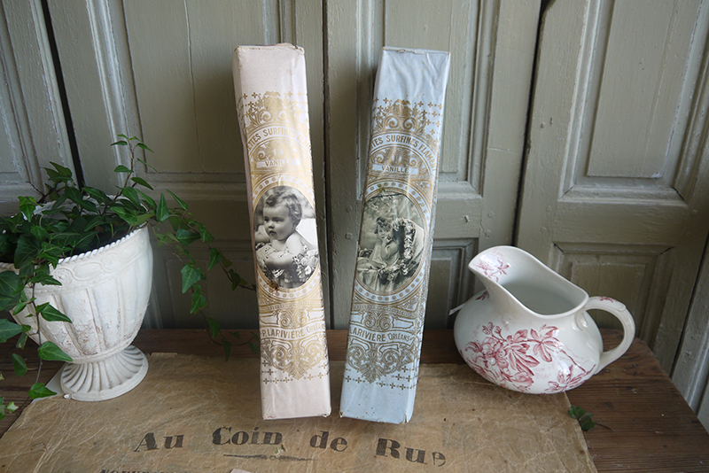 Deux anciennes boites en carton fin recouvertes de leur joli papier publicitaire , vides et reconstituées. Très jolis décors d’enfants ( peut être rajouté )