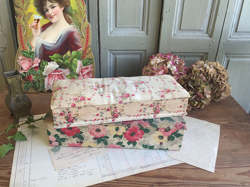 • En haut, joli tissu fleuri comportant des traces d’usure par endroit. Rembourrage intérieur du couvercle plissé. 34 x 14 x 6 cm. 20 euros VENDUE