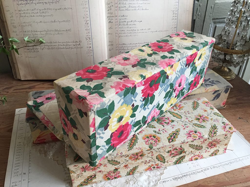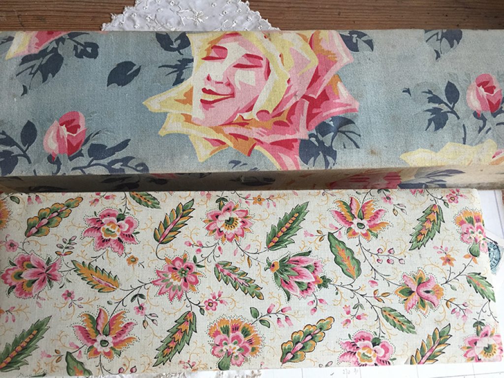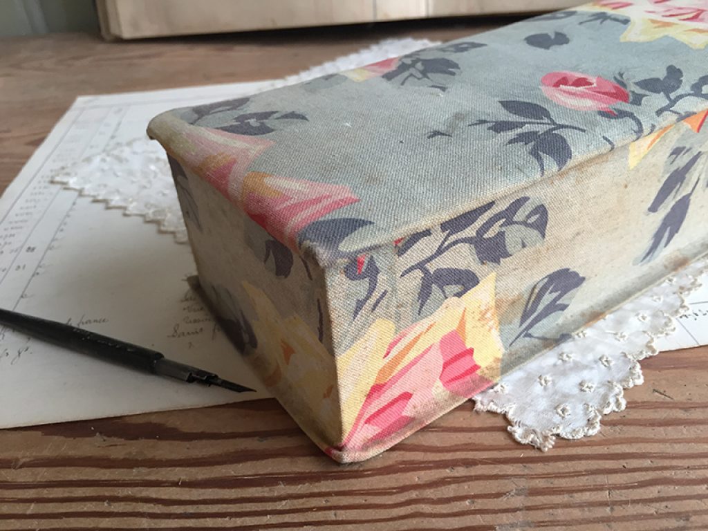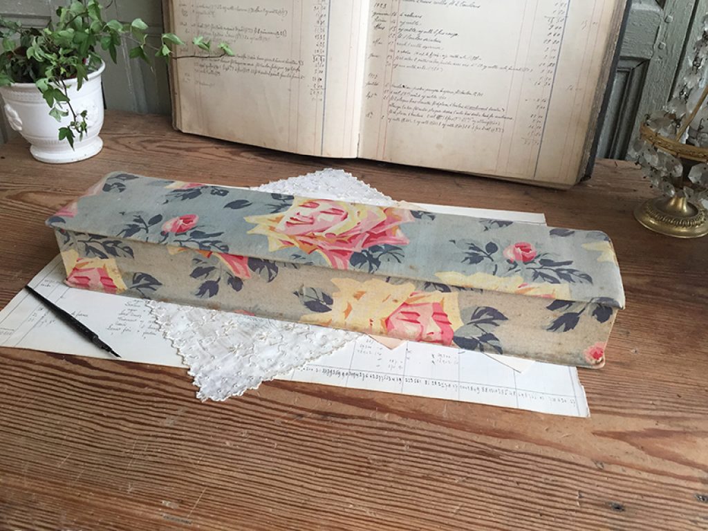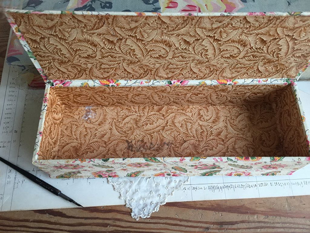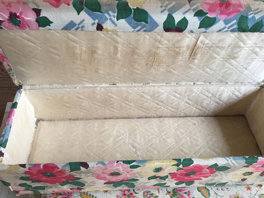 - La moyenne , recouverte artisanalement d’un tissu fleuri. Traces d’usure sous le couvercle. 36 x 13 x 9 cm. 15 euros RESERVEE