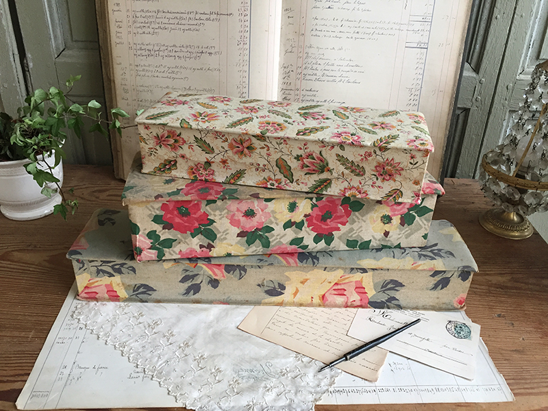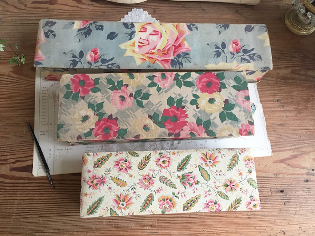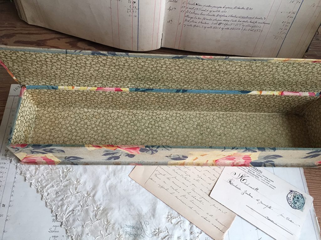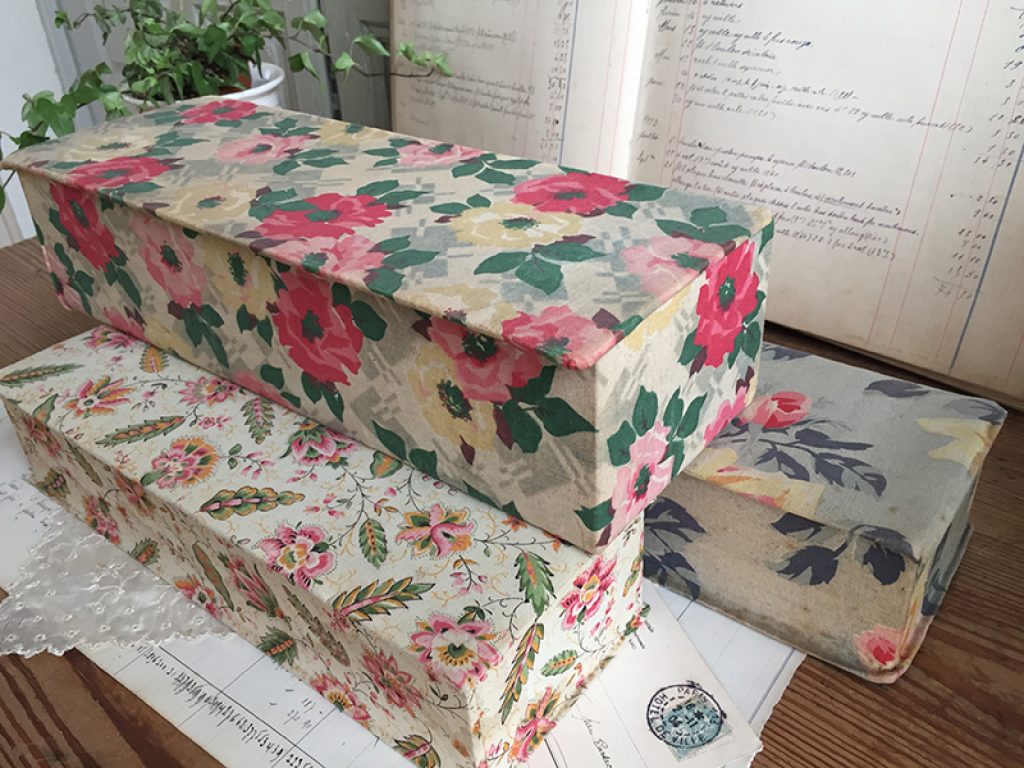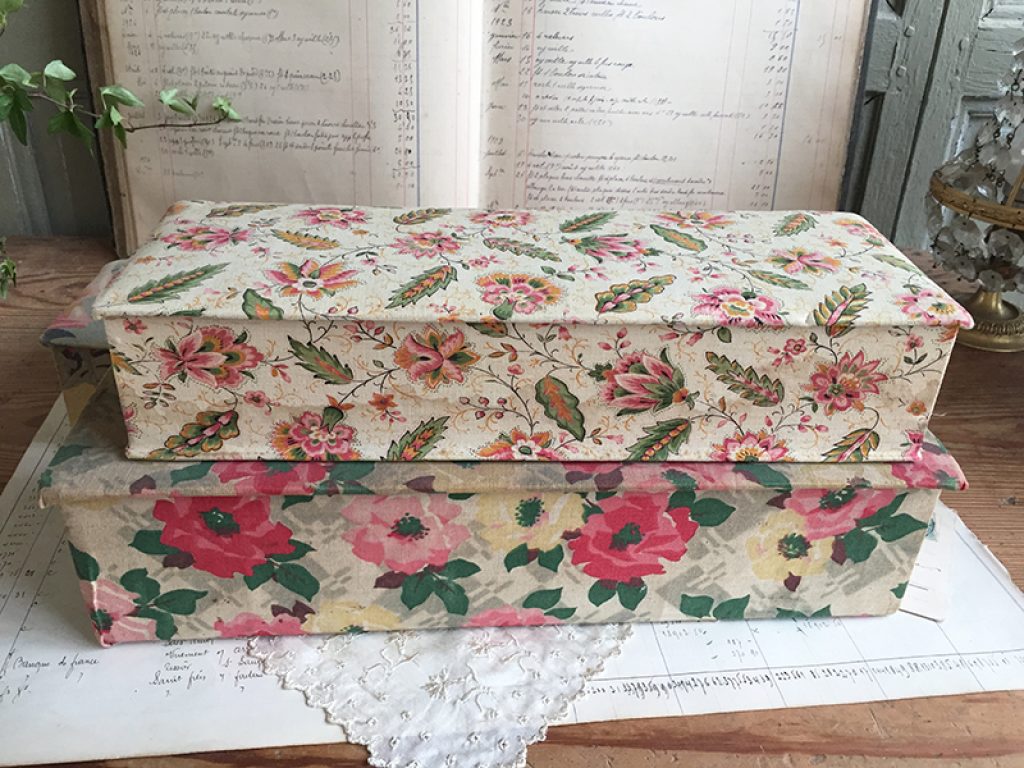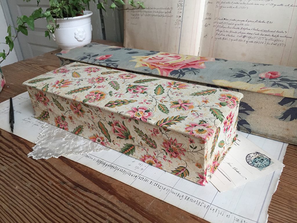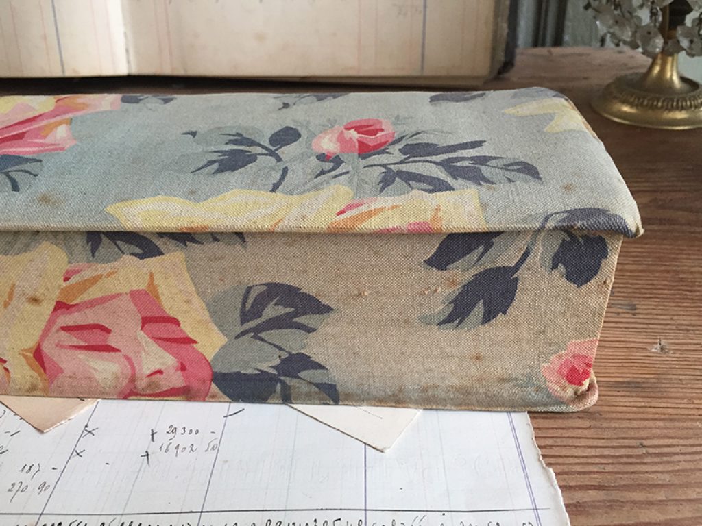 - La moyenne , recouverte artisanalement d’un tissu fleuri. Traces d’usure sous le couvercle. 36 x 13 x 9 cm. 15 euros RESERVEE
