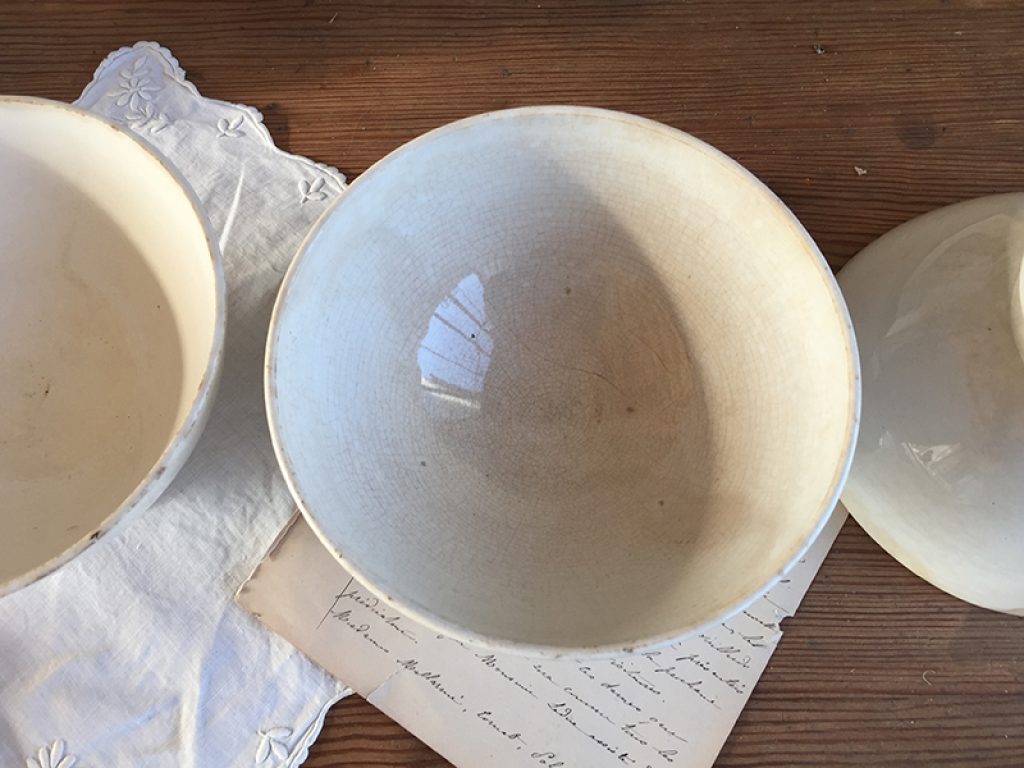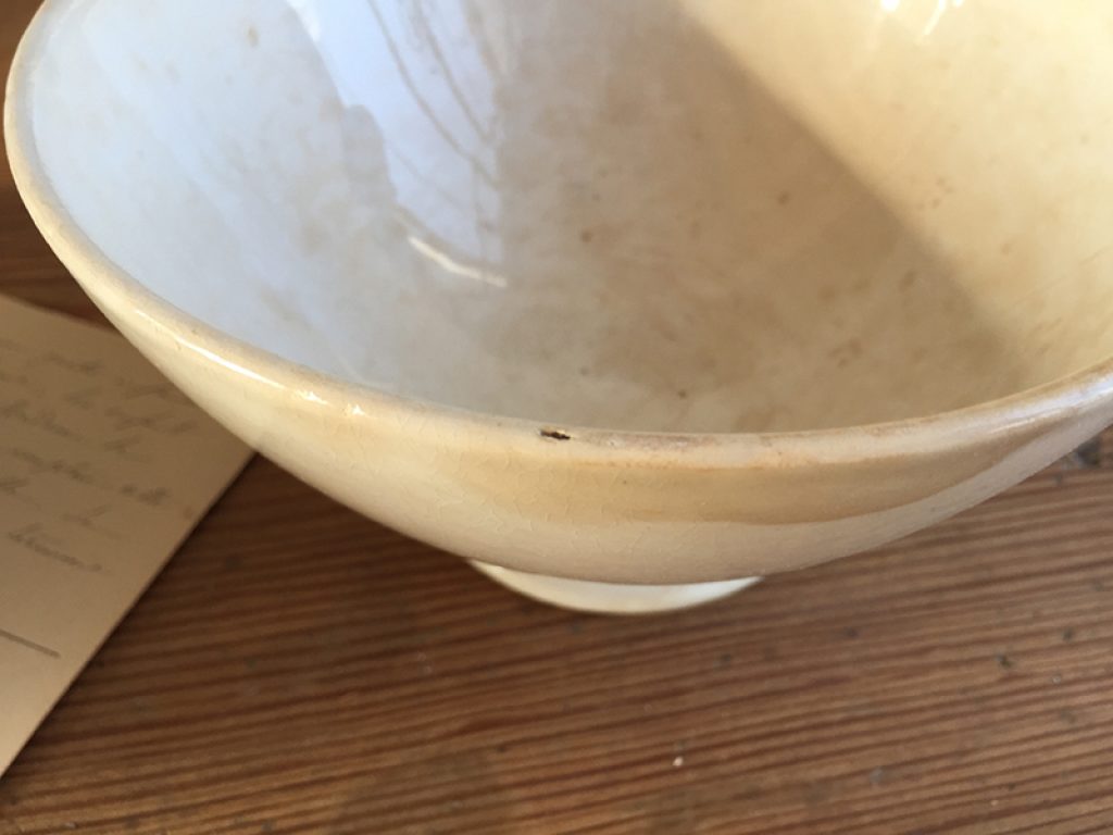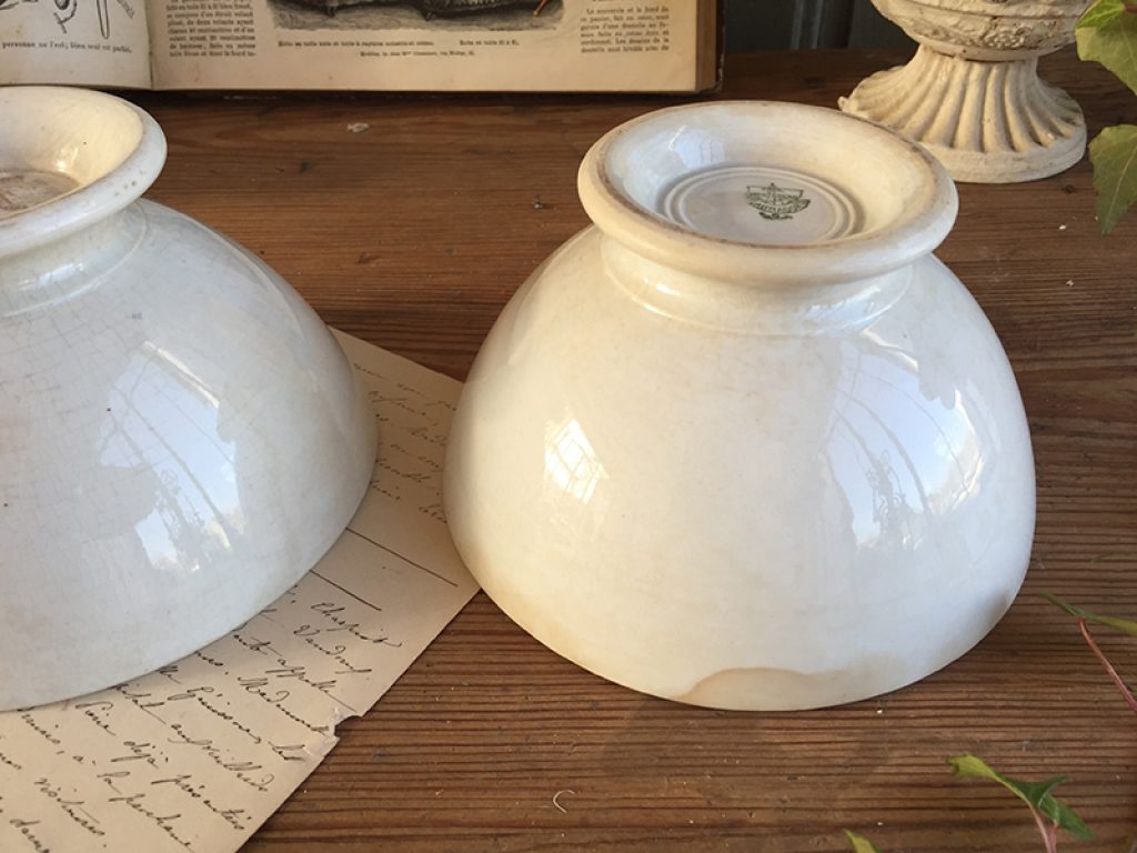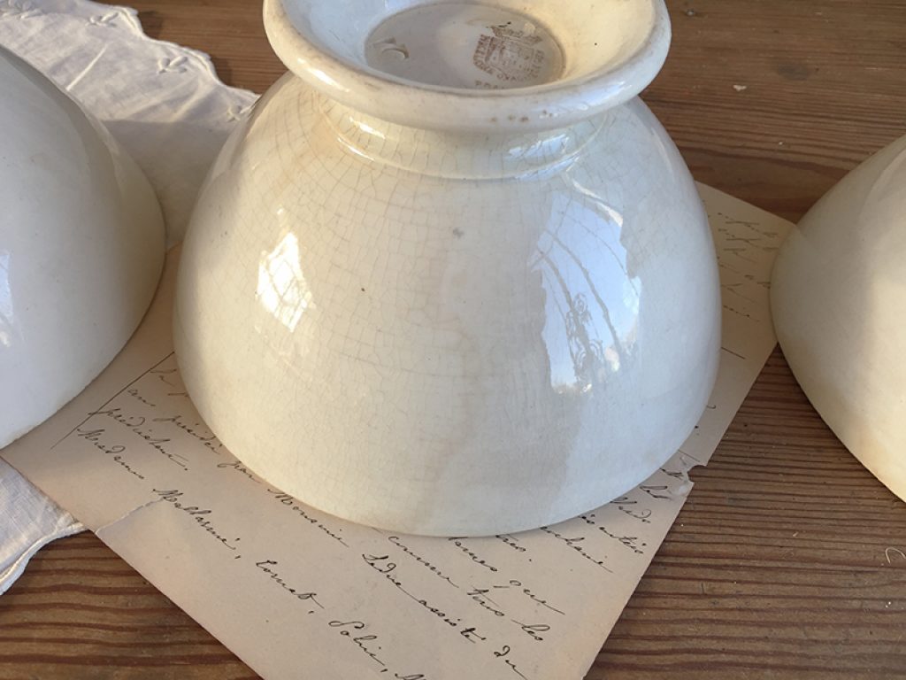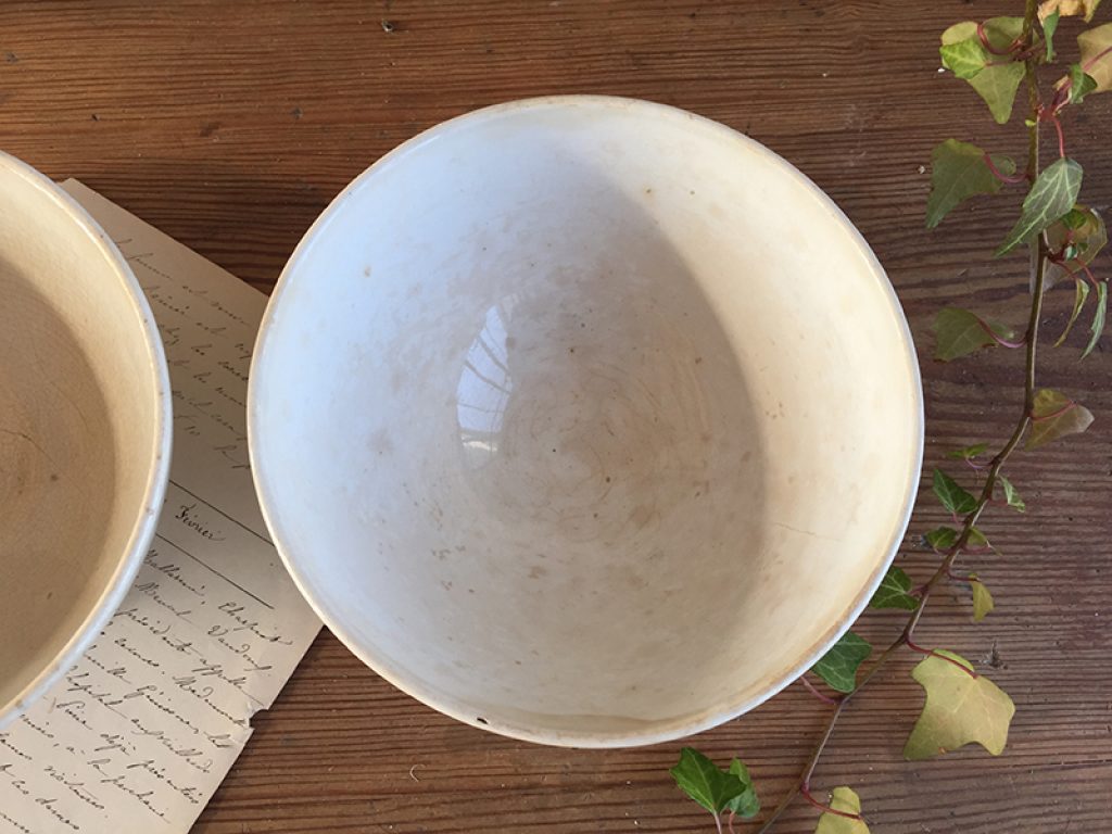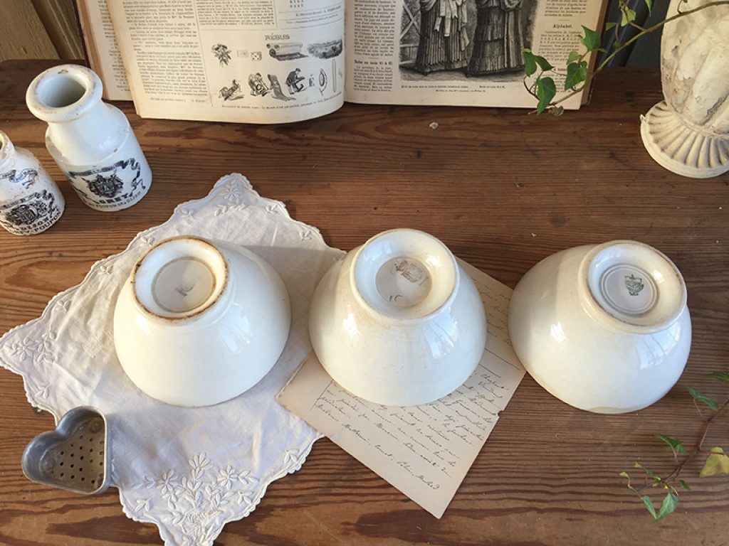 Trois anciens bols en faïence comportant quelques traces d’usage et jolie patine laissée par le temps. Fissures très superficielles à l’intérieur. Vendus séparément.