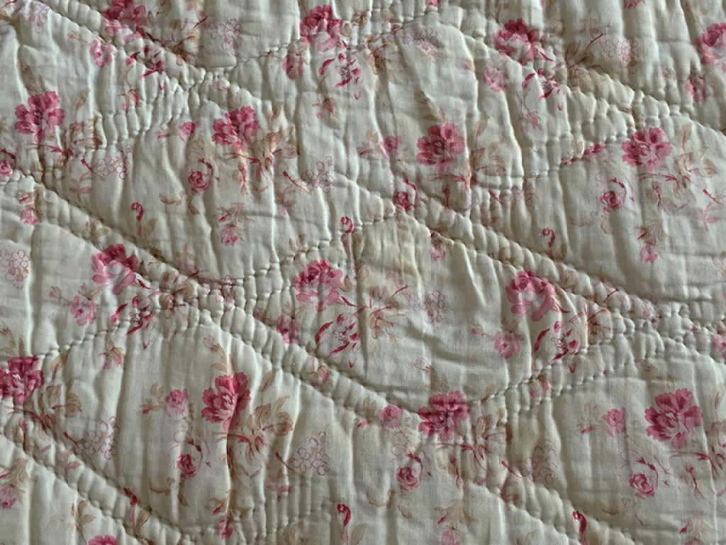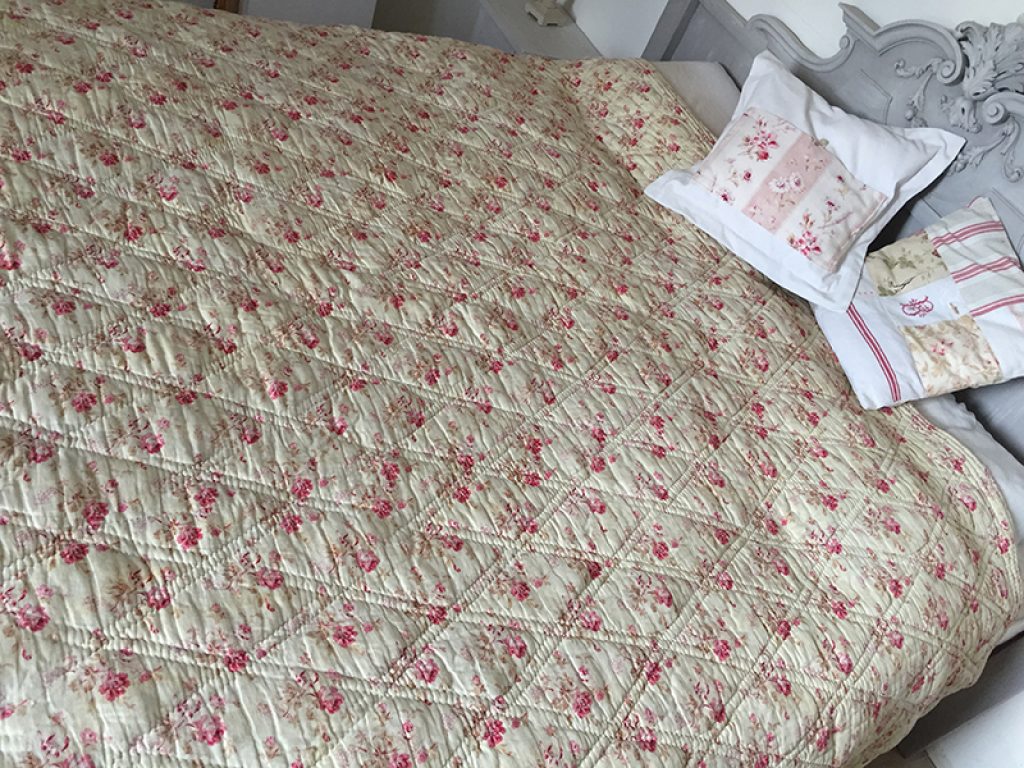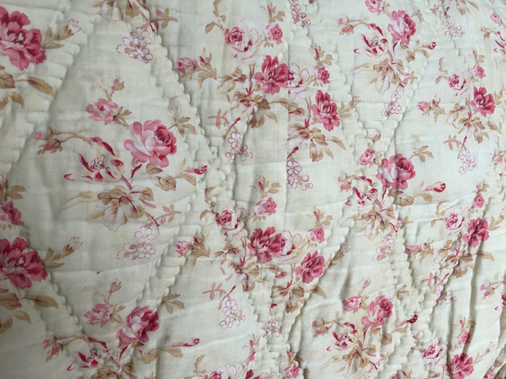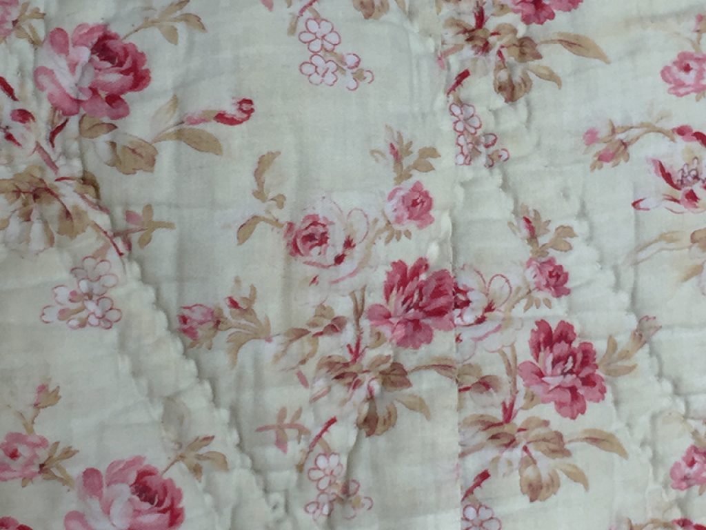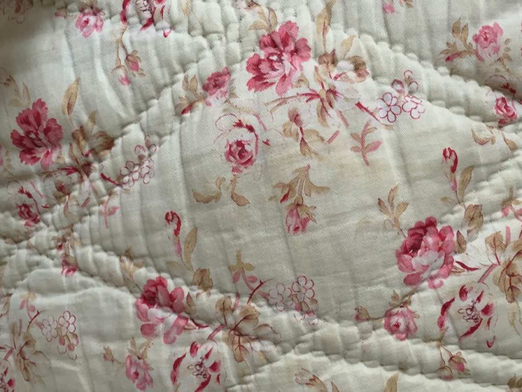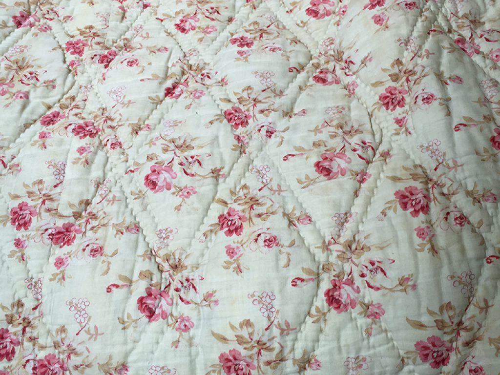 Ancienne couverture piquée provençale avec joli tissu au décor de fleurs roses sur fond vanille / crème, garni de laine bouillie.