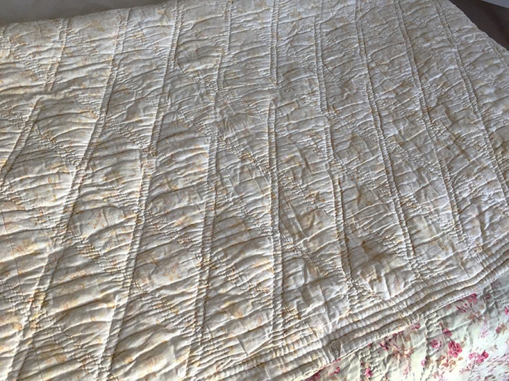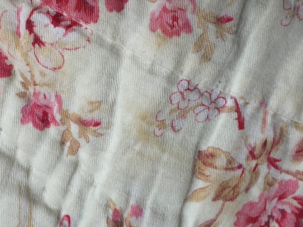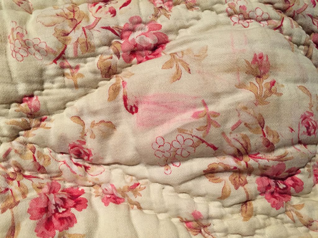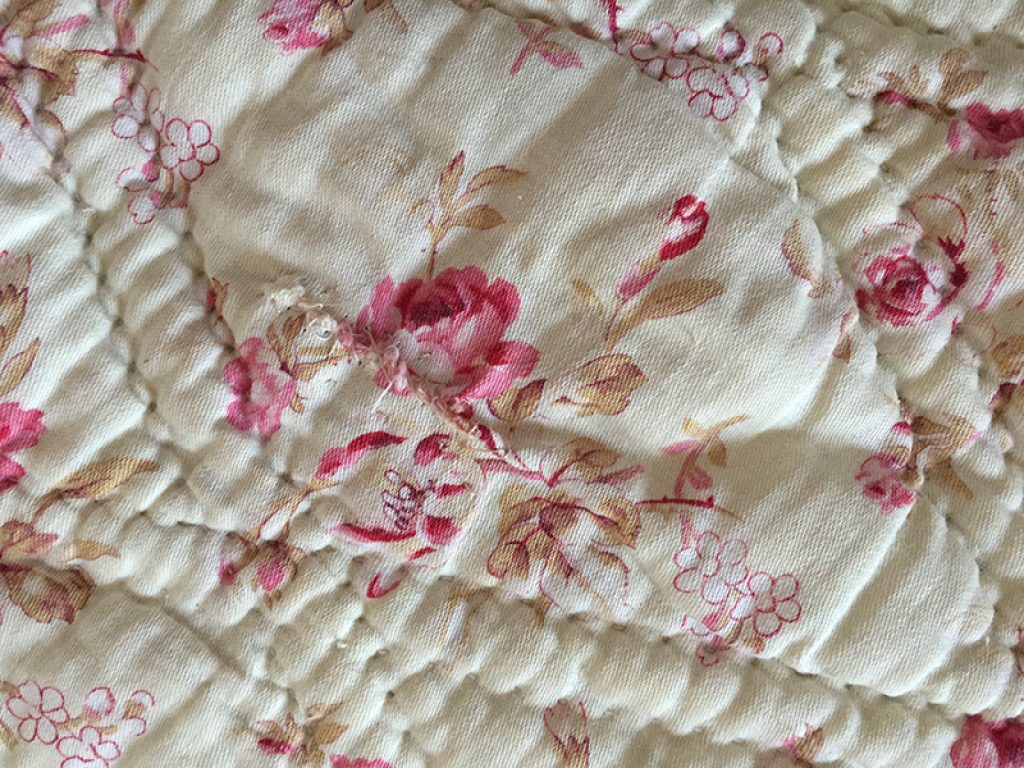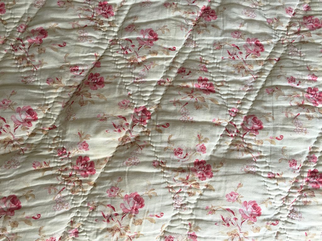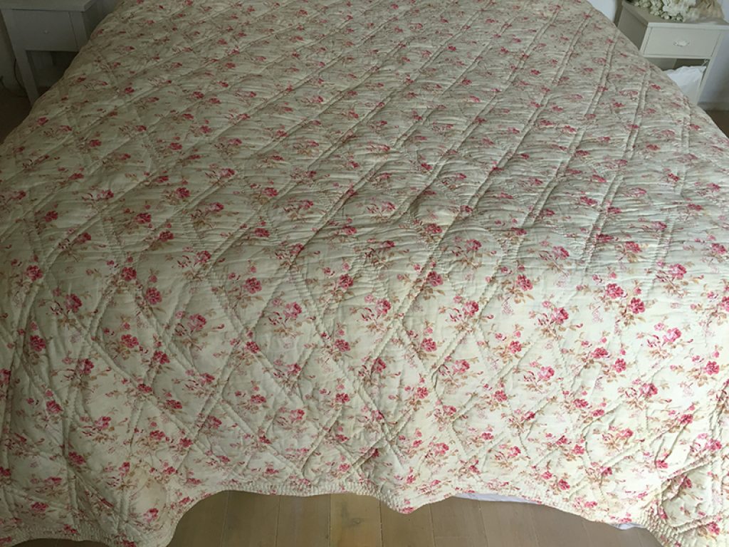 Ancienne couverture piquée provençale avec joli tissu au décor de fleurs roses sur fond vanille / crème, garni de laine bouillie.