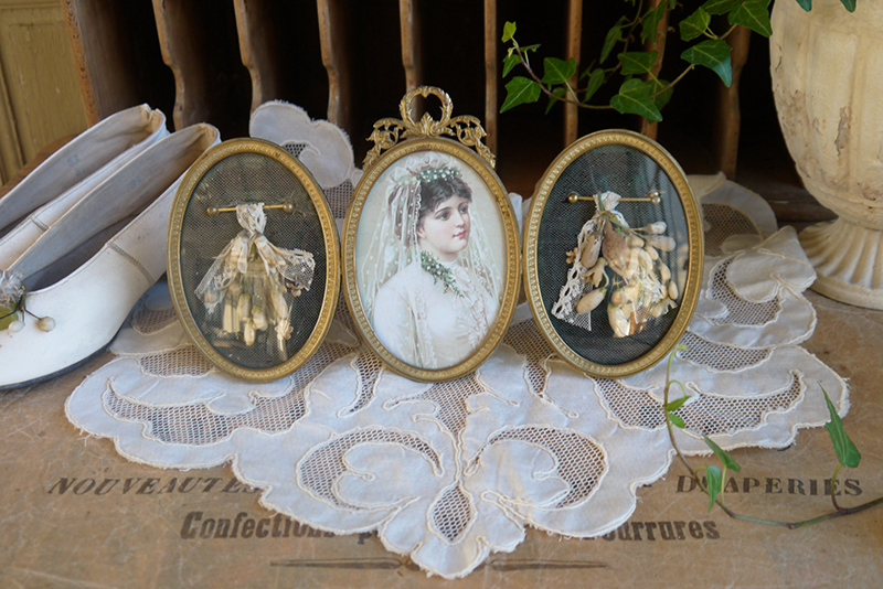 Ancien cadre à 3 vues, prévu au départ pour accrocher des médailles ( verres légèrement bombés ) et une photo au centre ( verre plat ) revisité avec une reproduction d’image décor mariée et des éléments en boutons de cire issus d’une couronne.