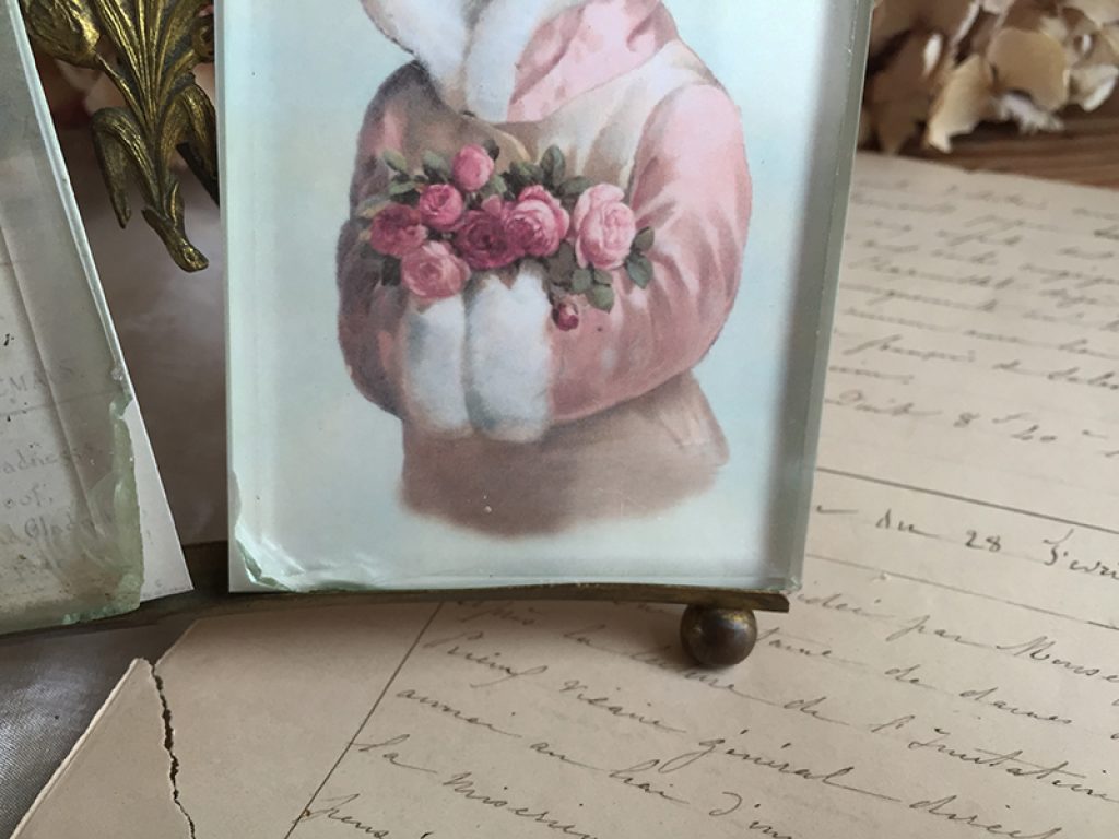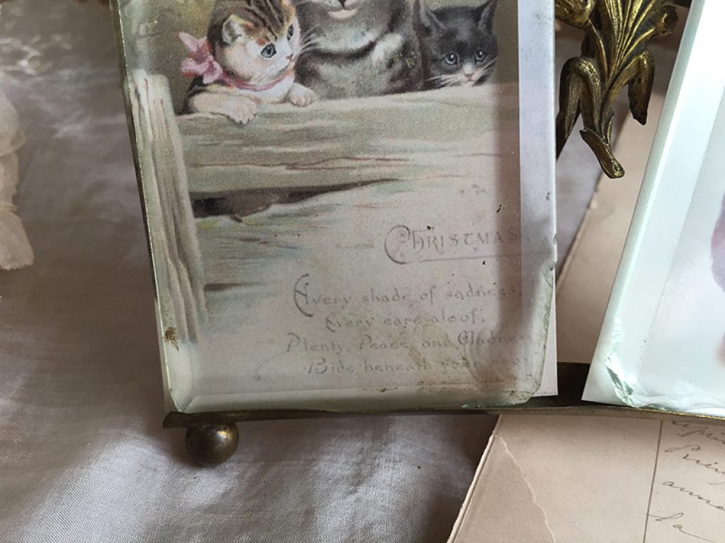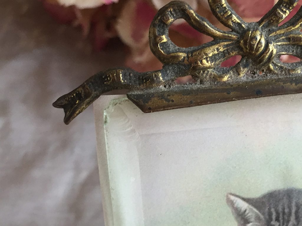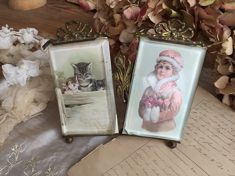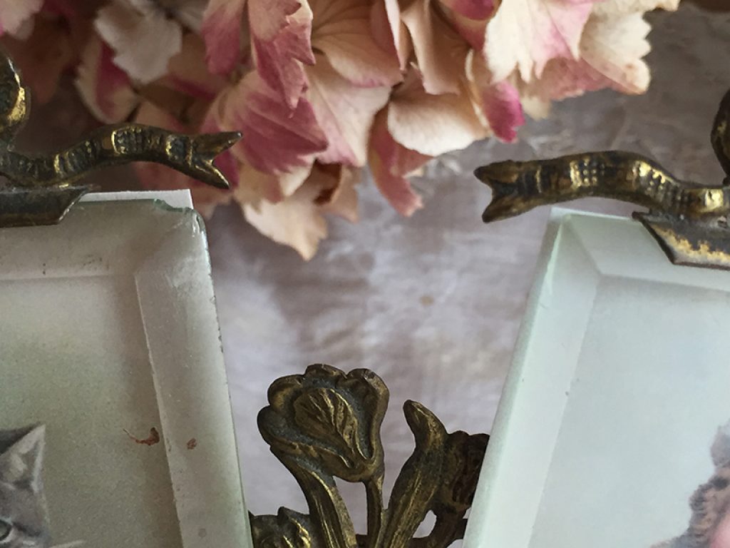 Joli cadre ancien malheureusement en état moyen mais de forme peu courante, garni de deux reproductions d’image sur papier, facilement remplaçables par des photos si besoin. Manques sur les verres, dans les angles.