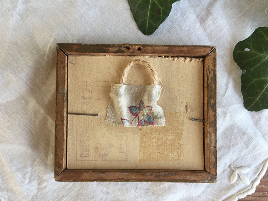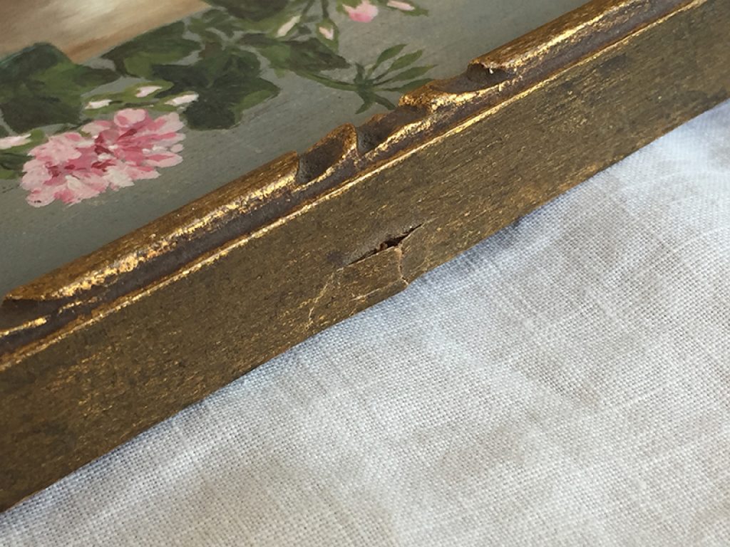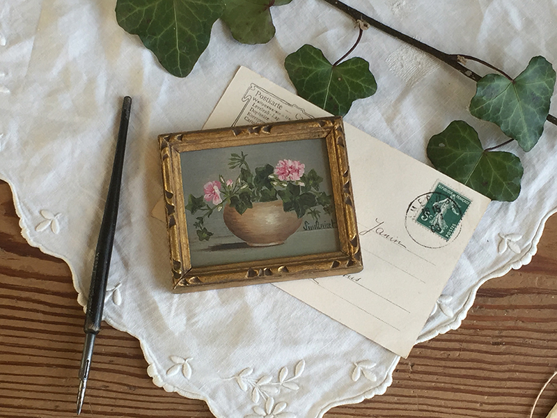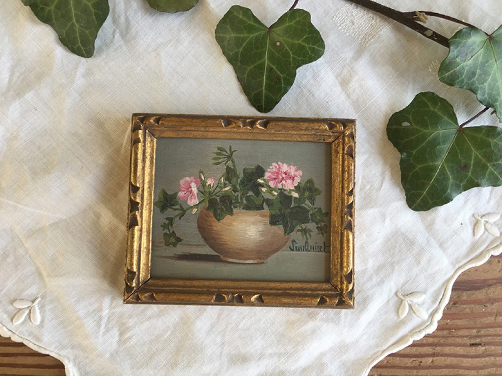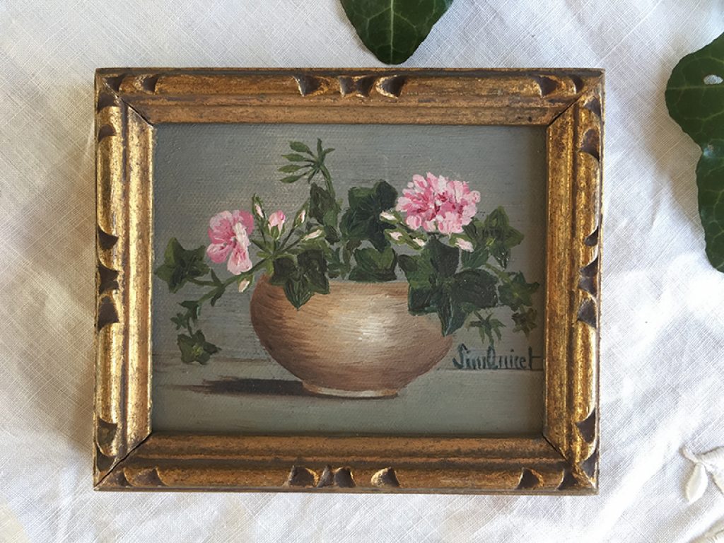 Petite peinture ancienne sur carton dans son cadre en bois doré. Joli décor de fleurs roses, géraniums et lierre, signé.