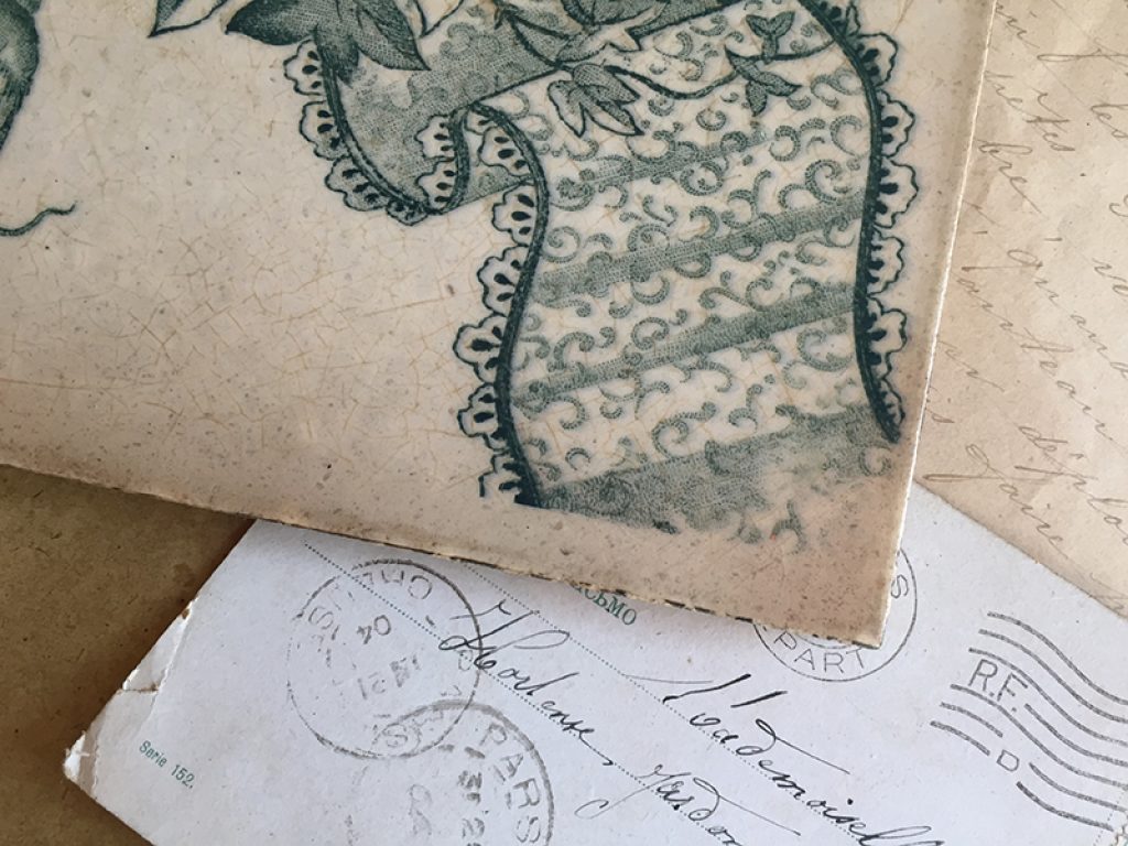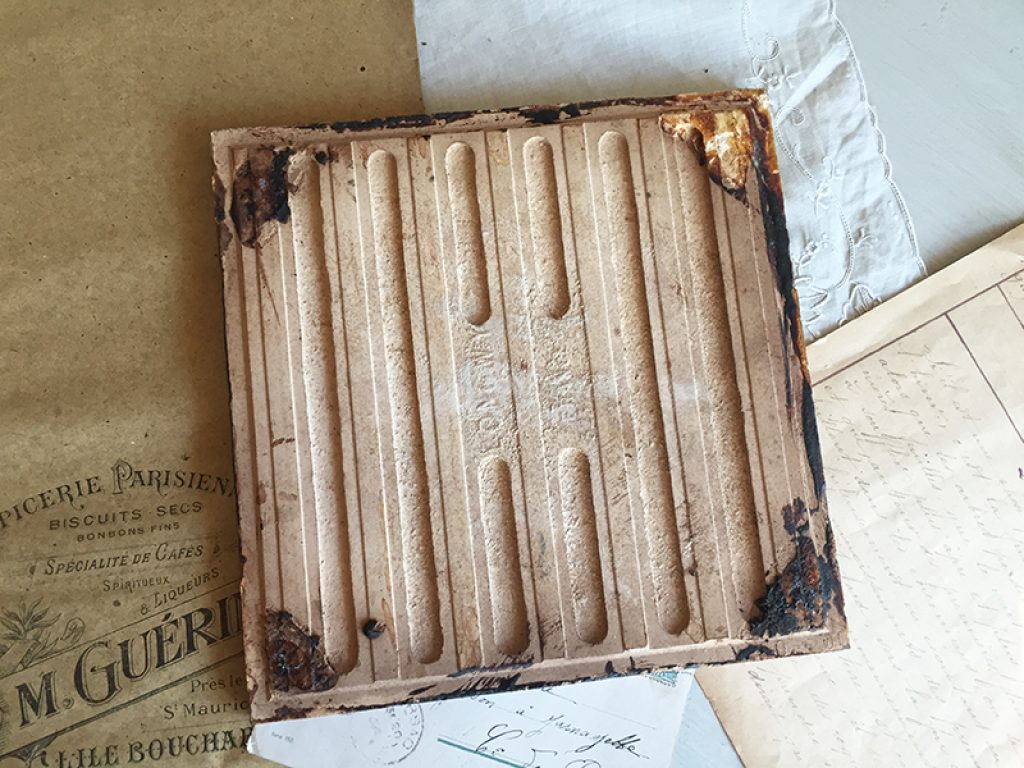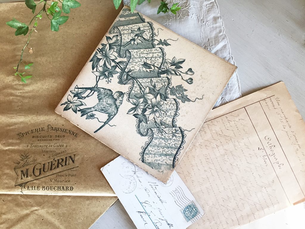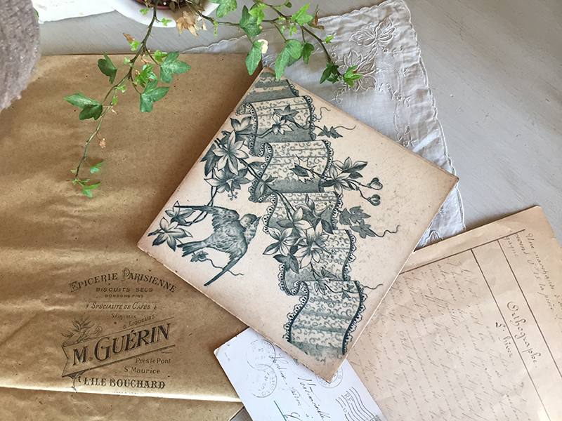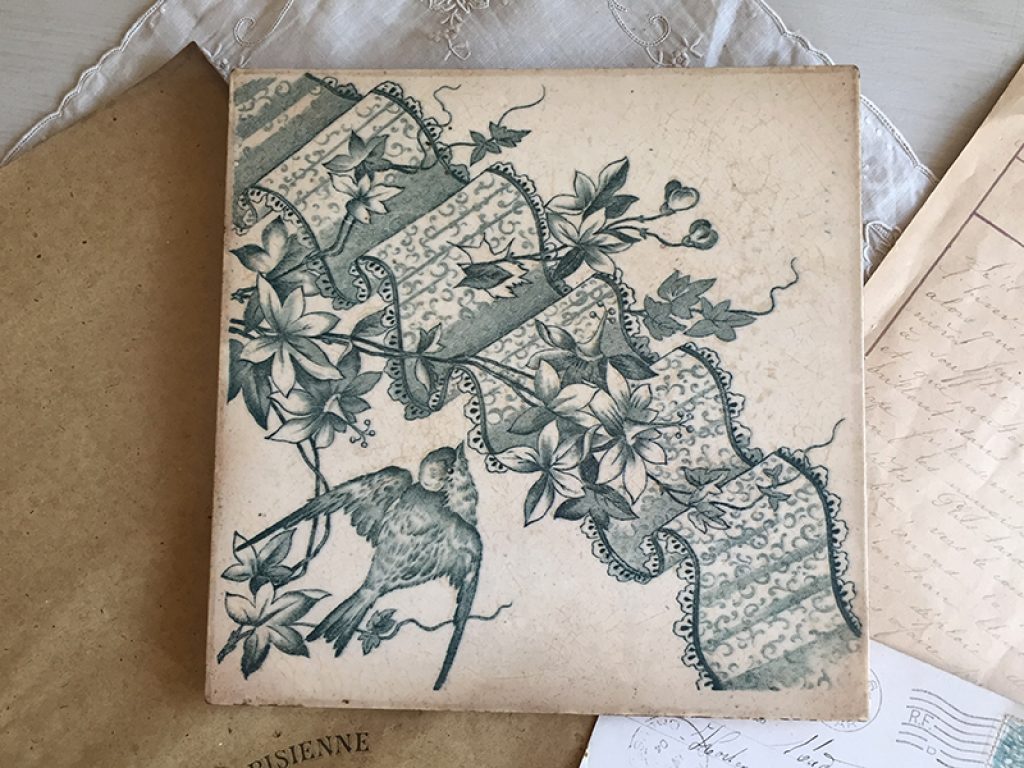 Ancien carreau en faïence de Longwy pour dessous de plat, au joli décor d’oiseau et de ruban. Patiné par le temps, bon état général.