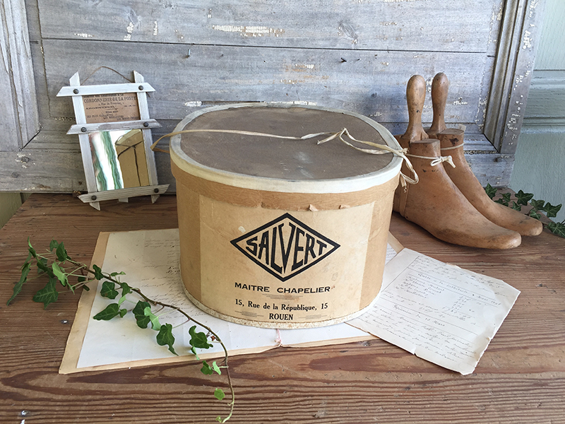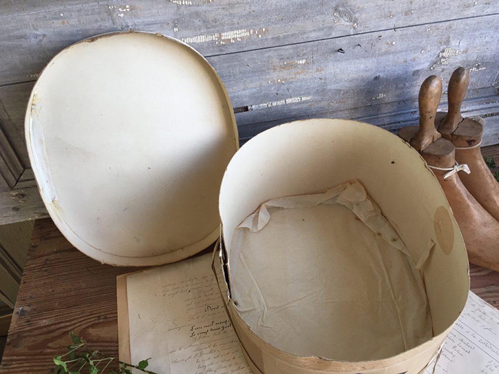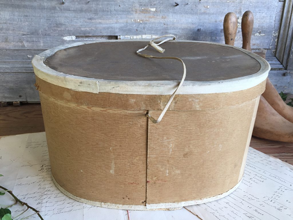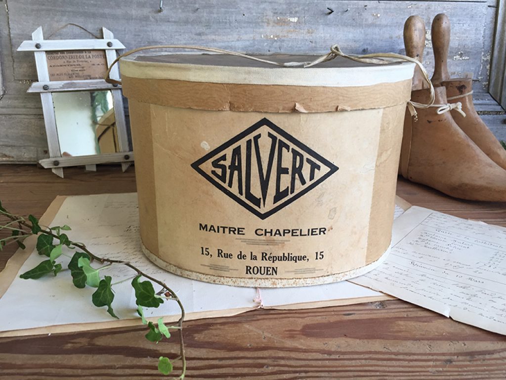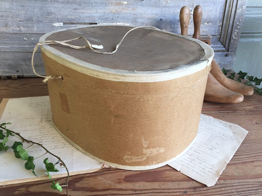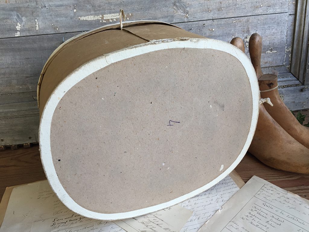 Ancienne boite à chapeau publicitaire en carton, vide, comportant des traces d’usage et taches, en particulier sur le couvercle, mais toujours aussi charmante.