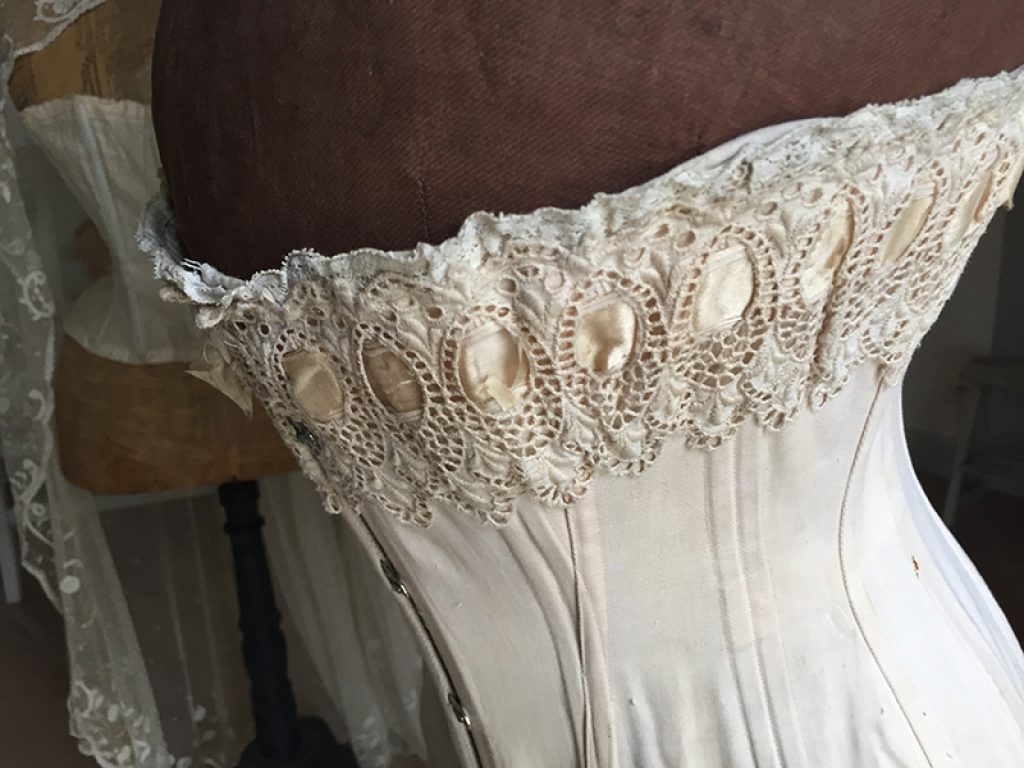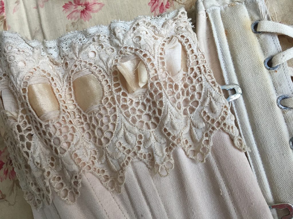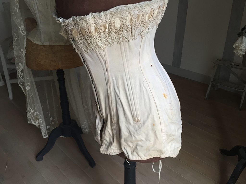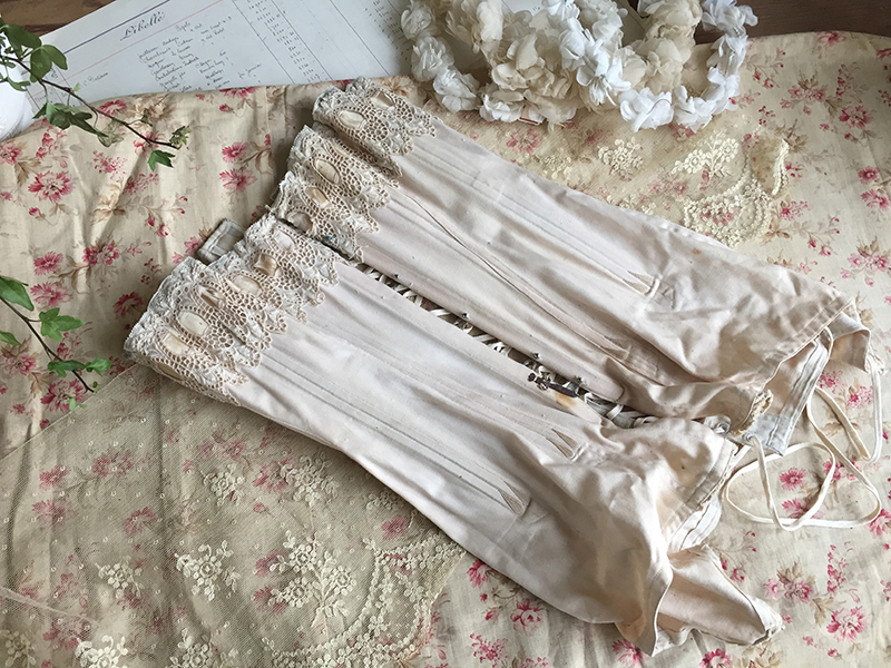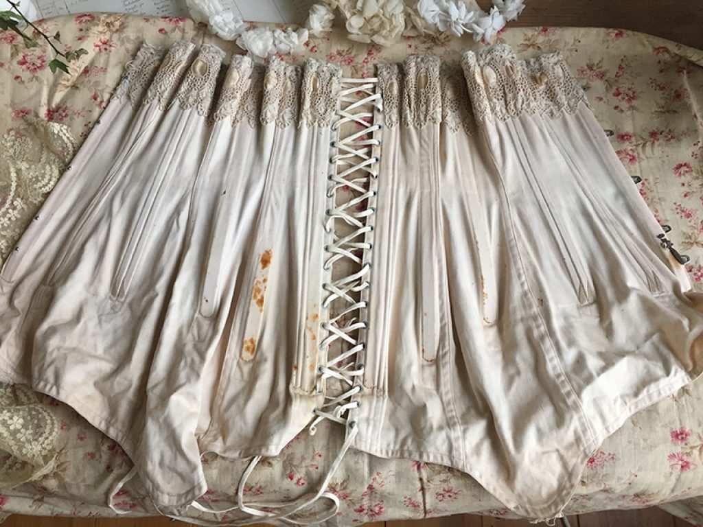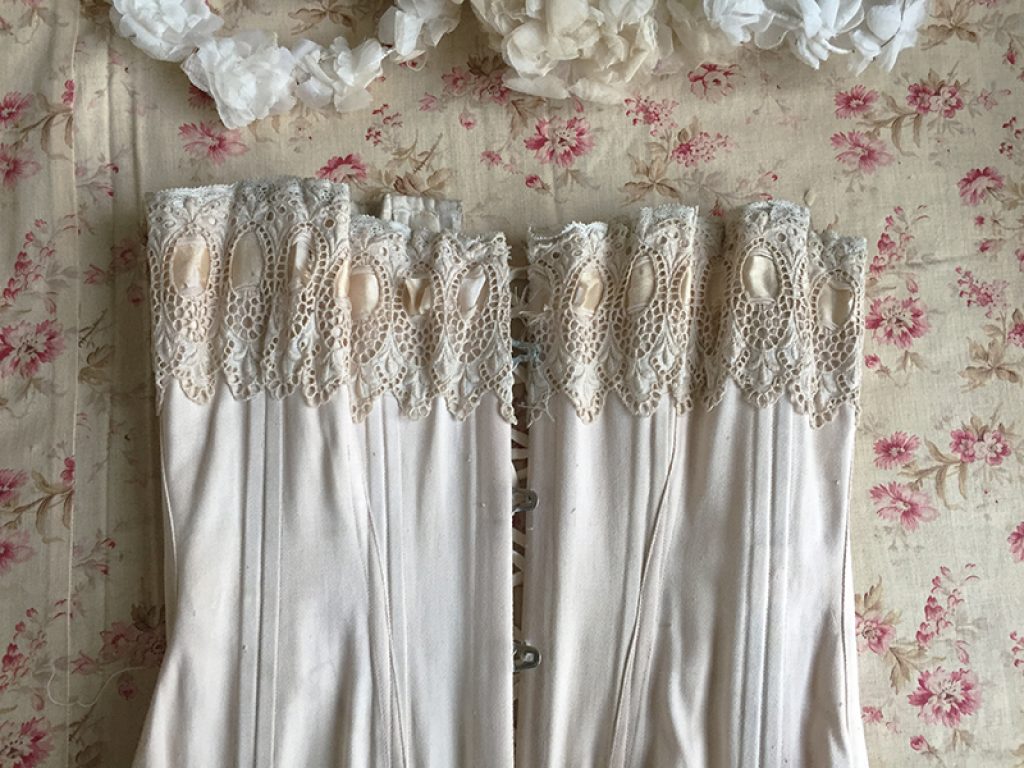 Ravissant corset ancien avec sa jolie bande de dentelle, comportant quelques taches de rouille. Il sera parfait en déco de charme sur un mannequin. Ruban usé sur la dentelle.