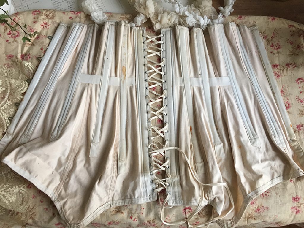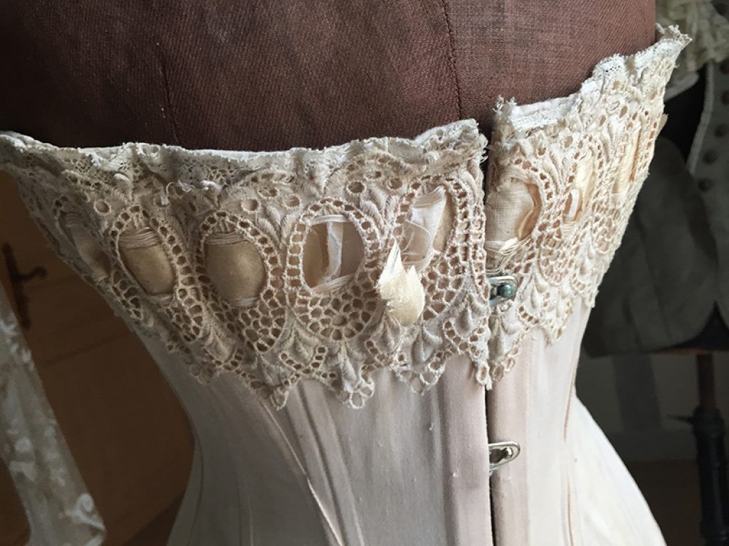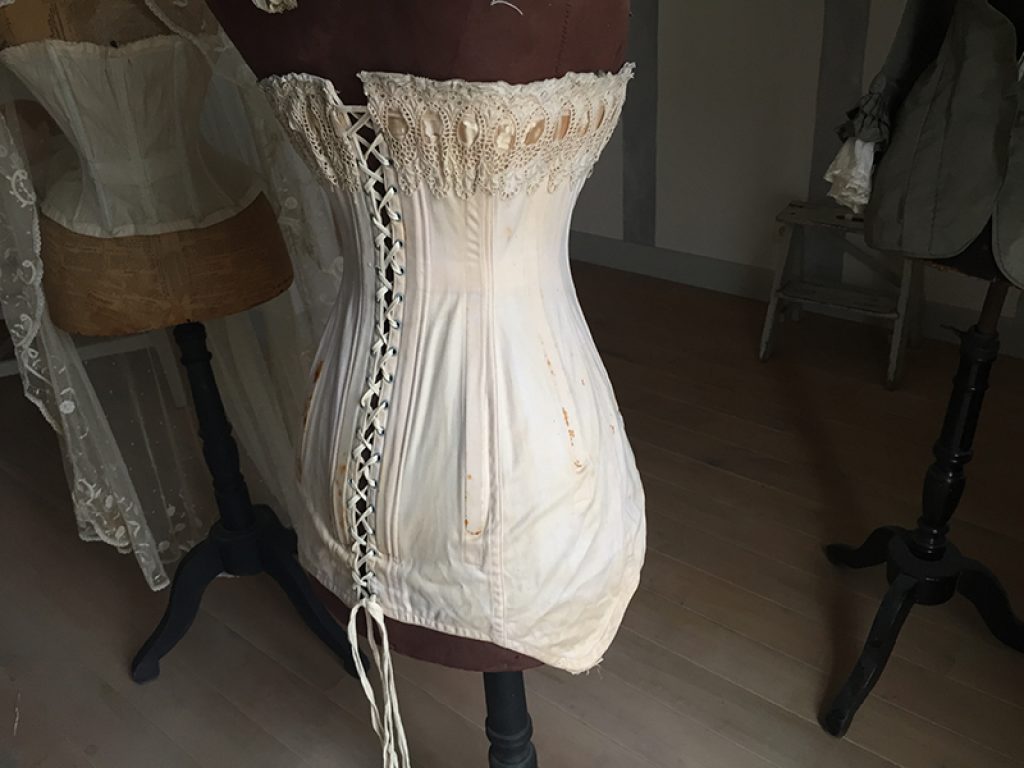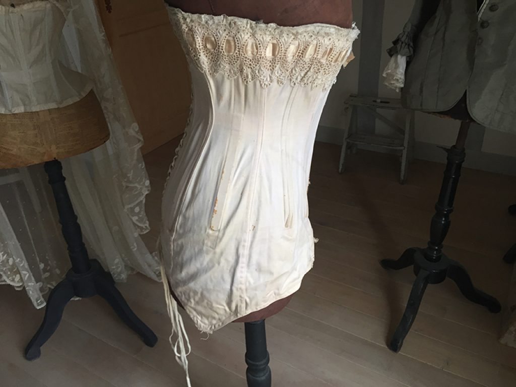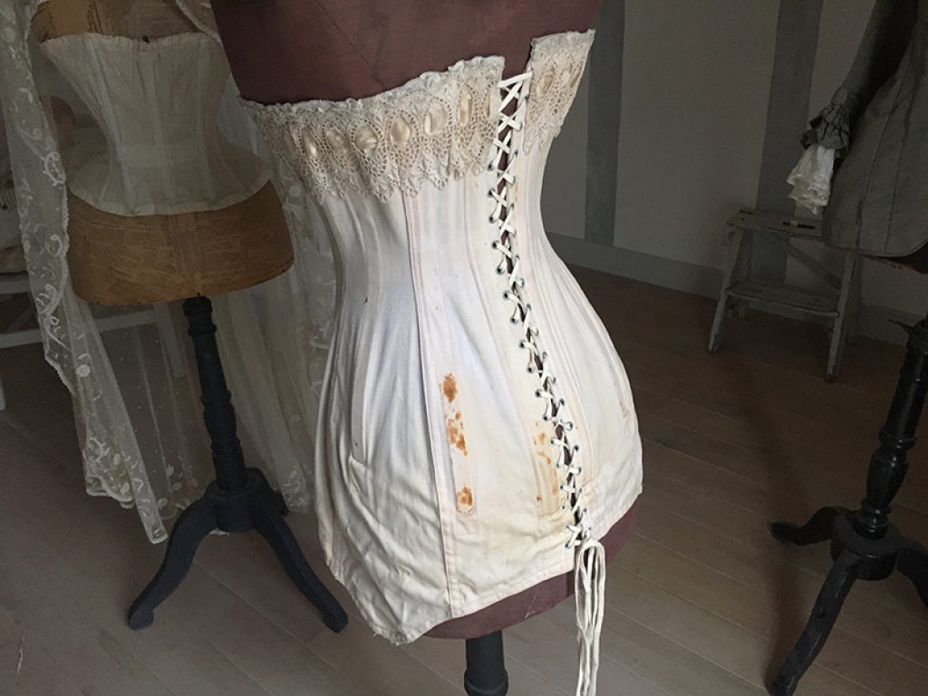 Ravissant corset ancien avec sa jolie bande de dentelle, comportant quelques taches de rouille. Il sera parfait en déco de charme sur un mannequin. Ruban usé sur la dentelle.