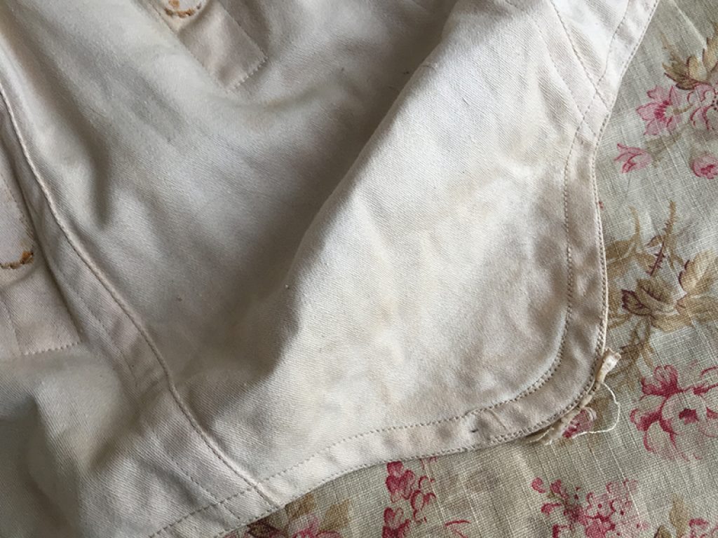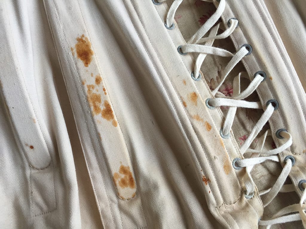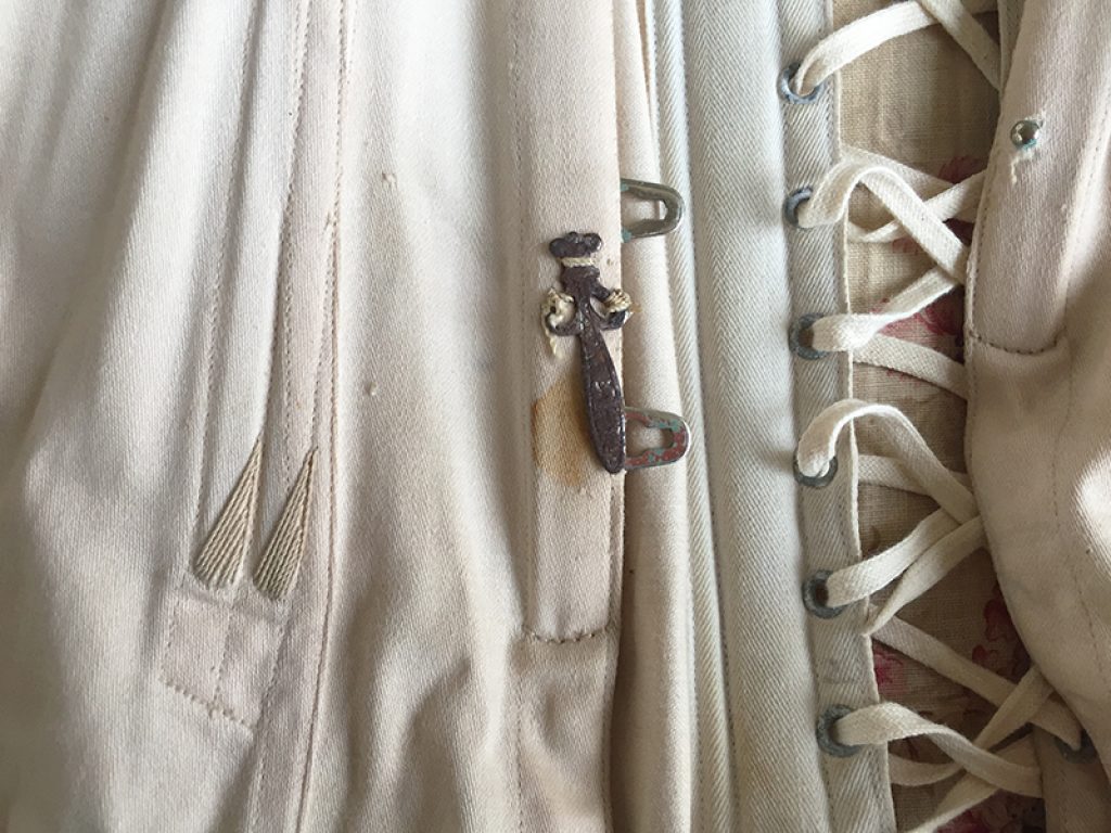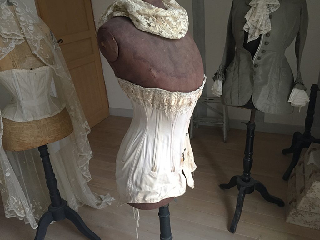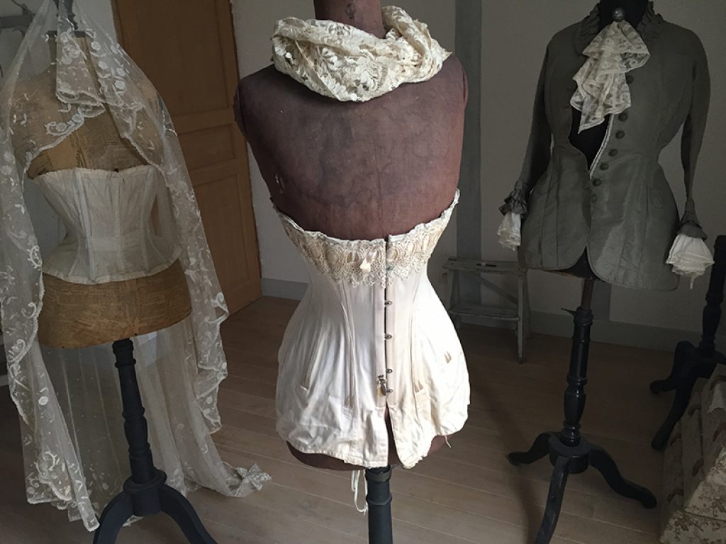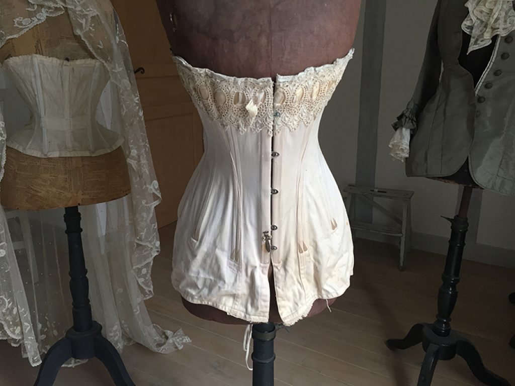 Ravissant corset ancien avec sa jolie bande de dentelle, comportant quelques taches de rouille. Il sera parfait en déco de charme sur un mannequin. Ruban usé sur la dentelle.