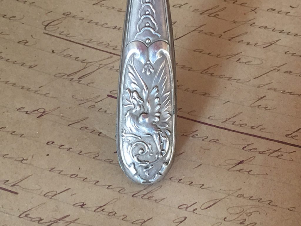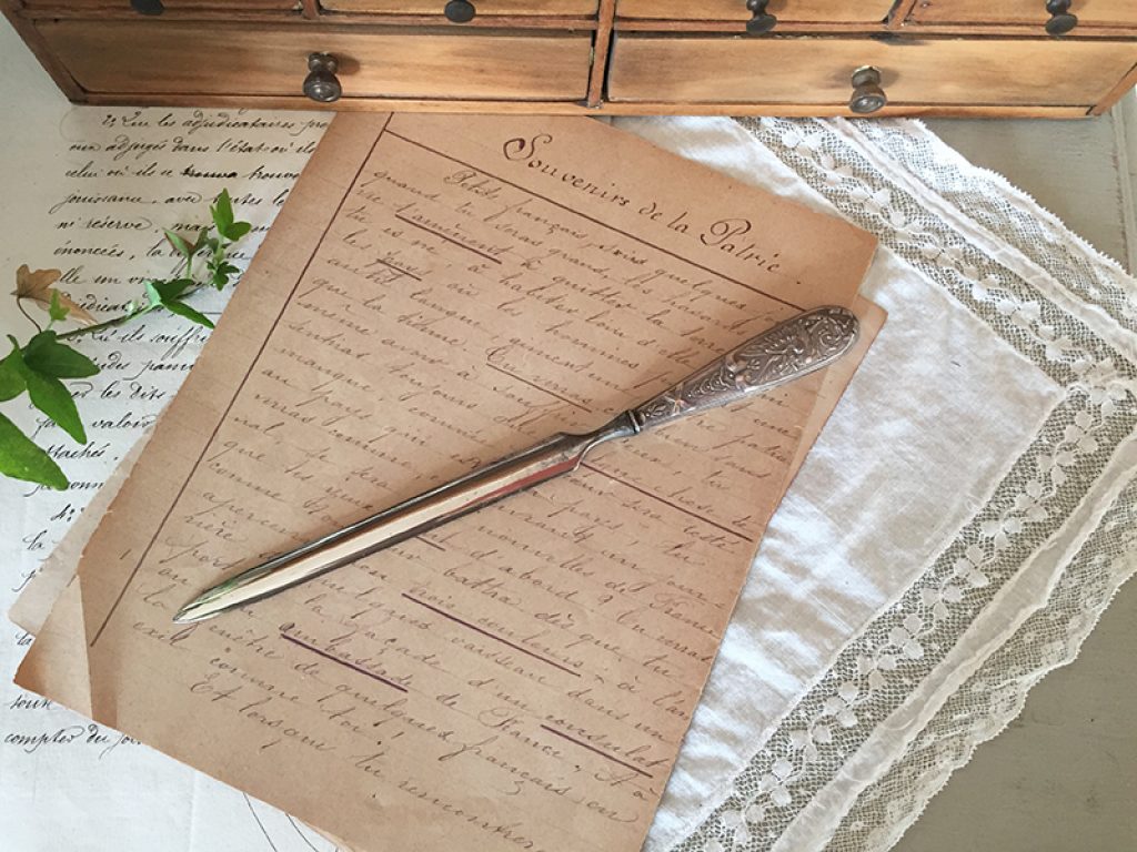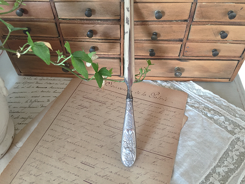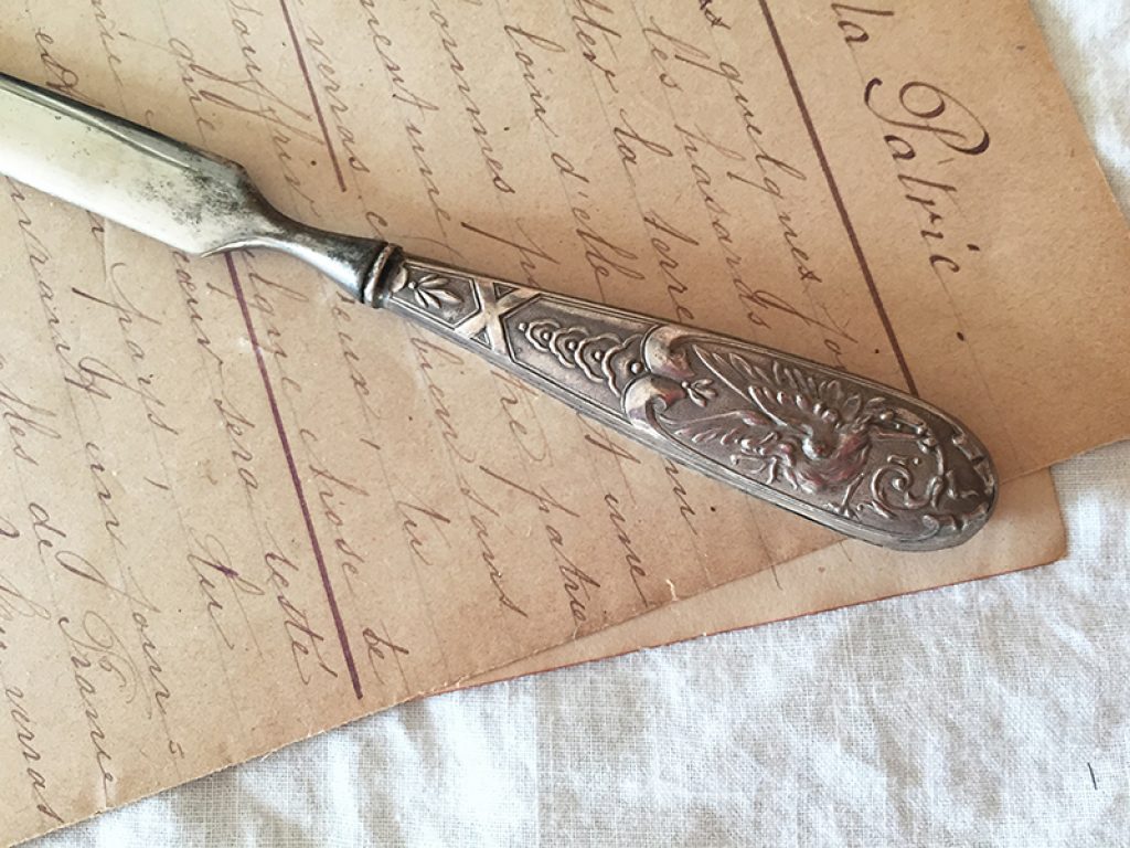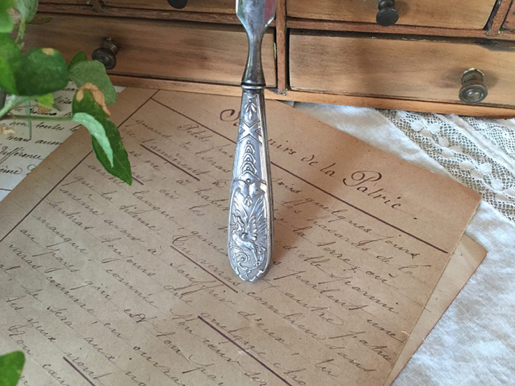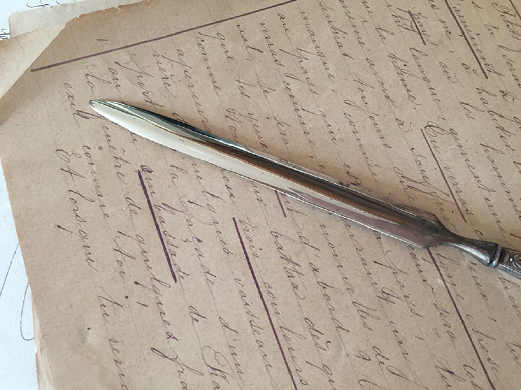 Ancien coupe papier en métal argenté, parfait pour un bureau élégant.