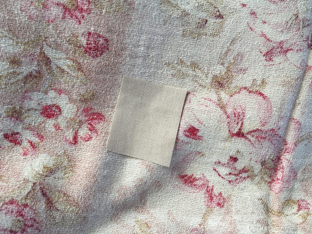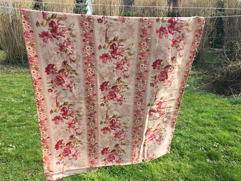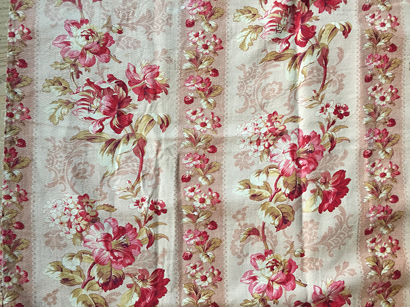 Coupon de tissu ancien moyennement épais, au joli décor de fleurs roses.