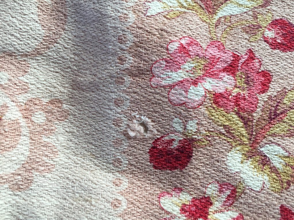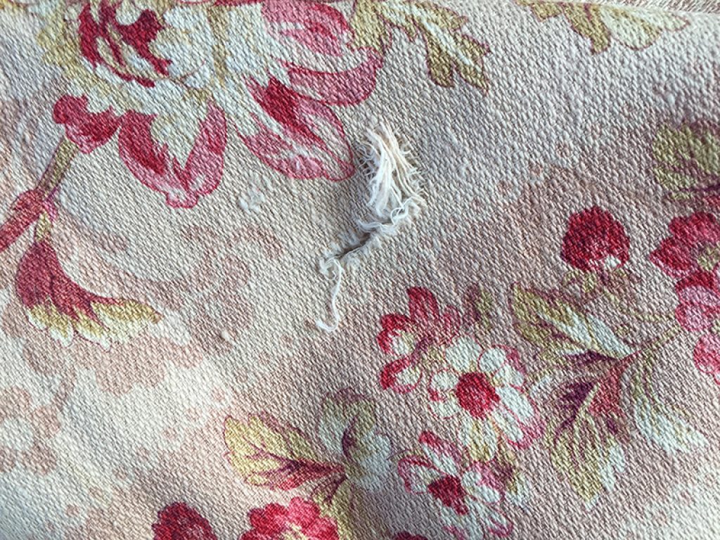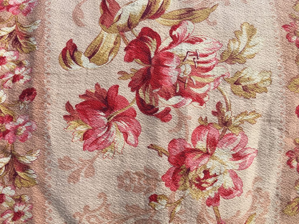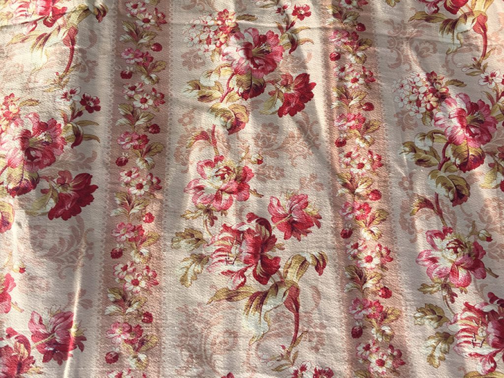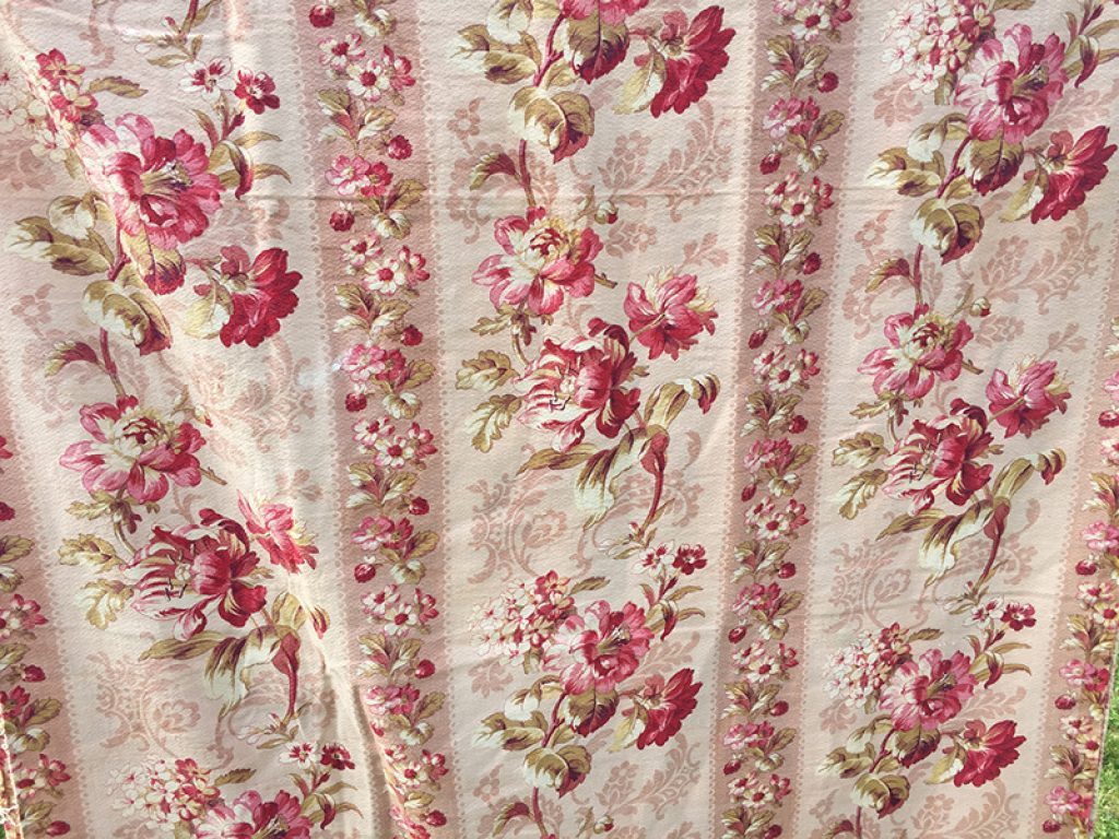 Trois coupons de tissu ancien, identiques, moyennement épais, au joli décor de fleurs roses.