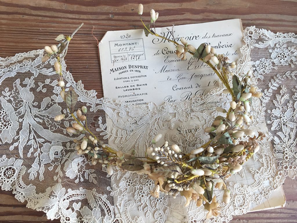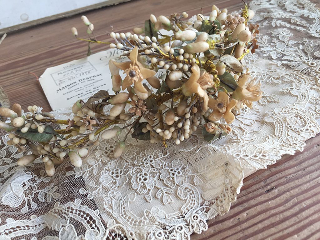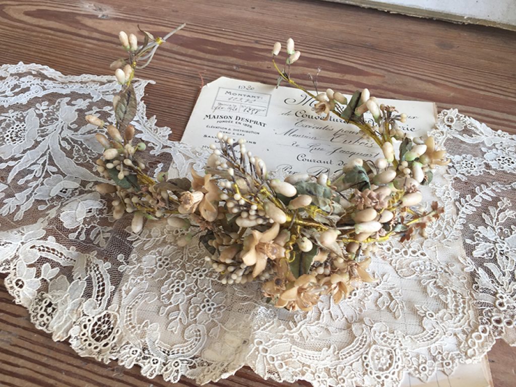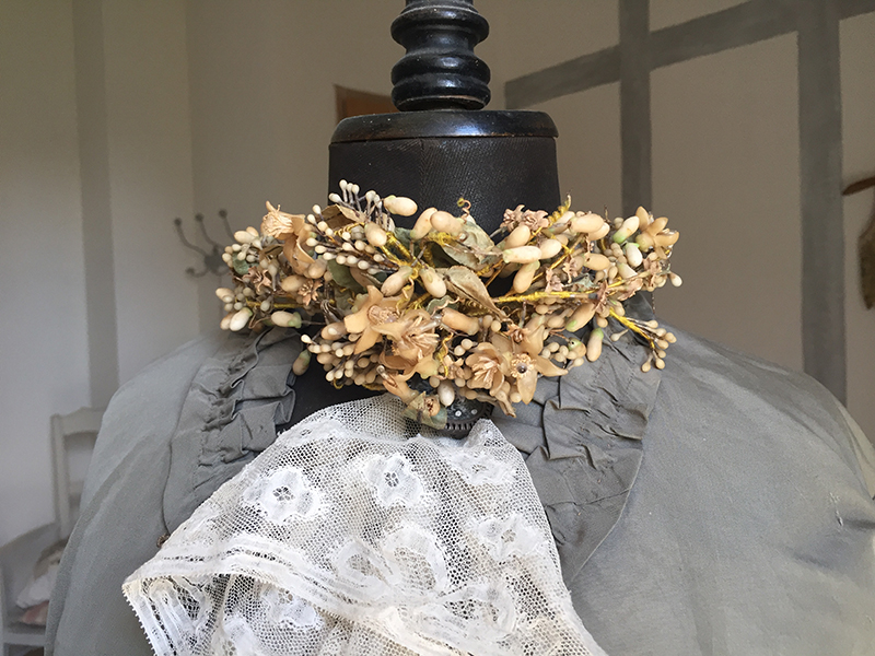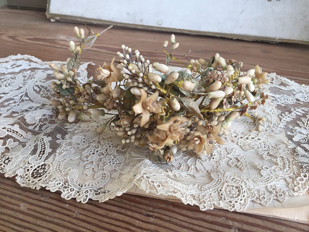 Ancienne couronne de mariée en boutons de cire et fleurs d’oranger, Napoléon III. Très jolie en déco shabby, au cou d’un mannequin.