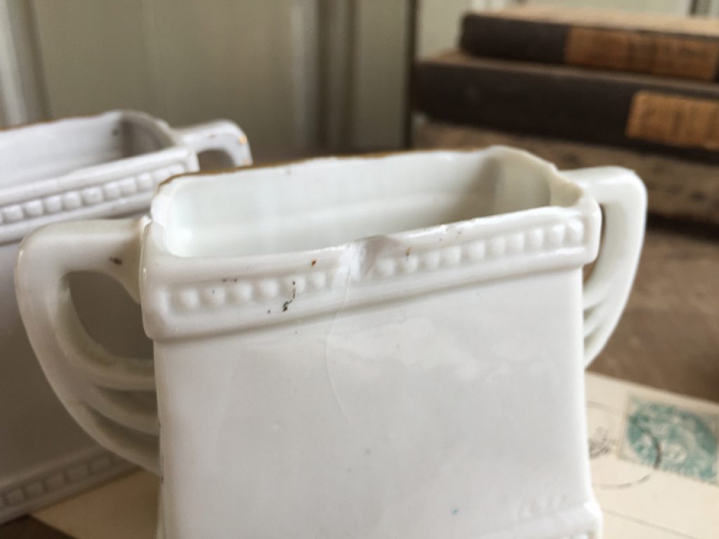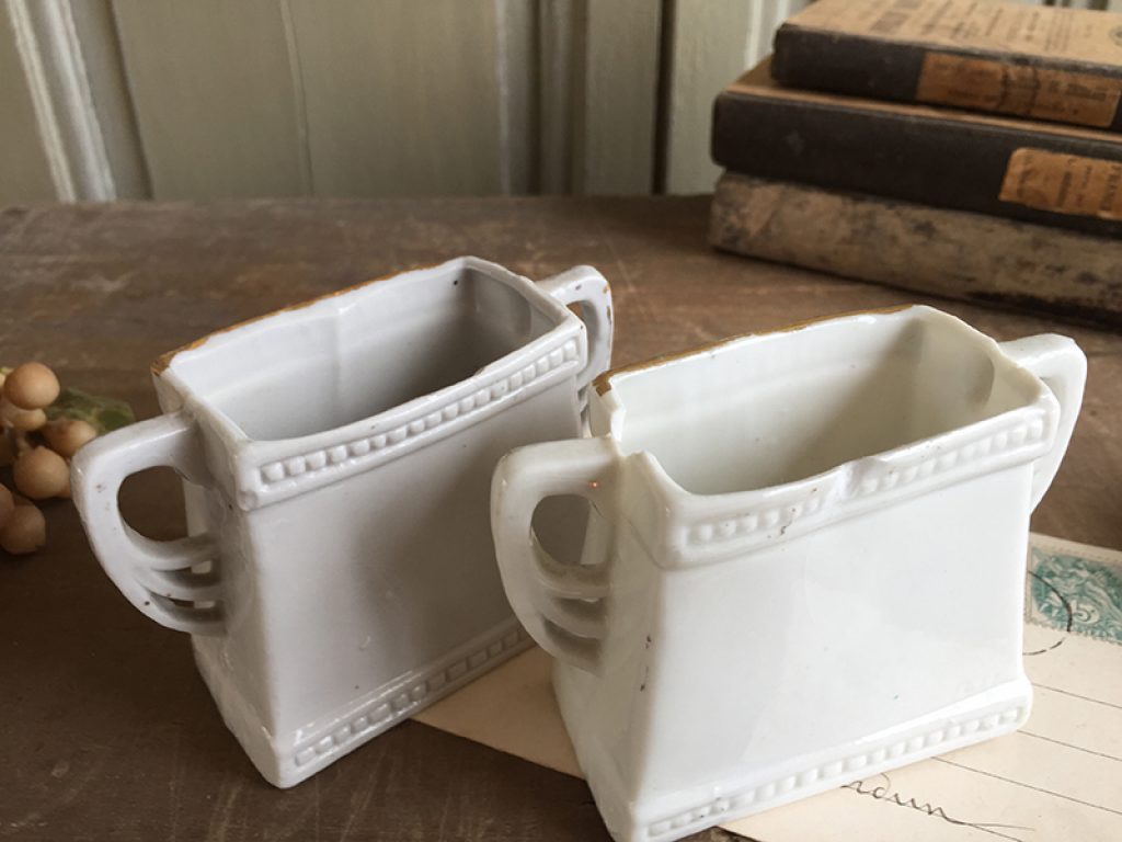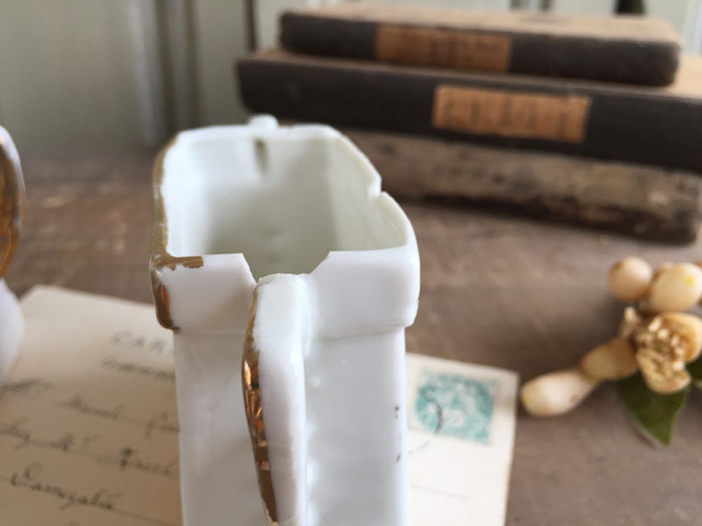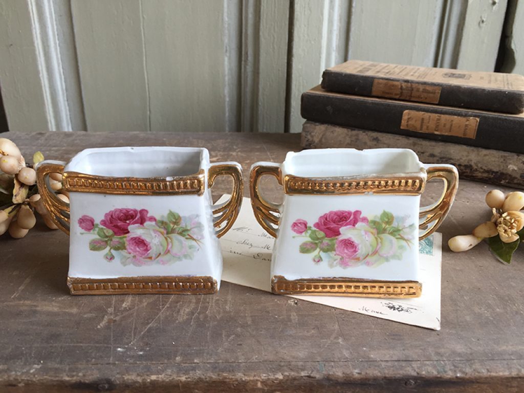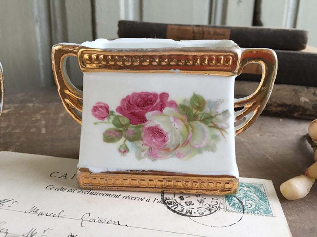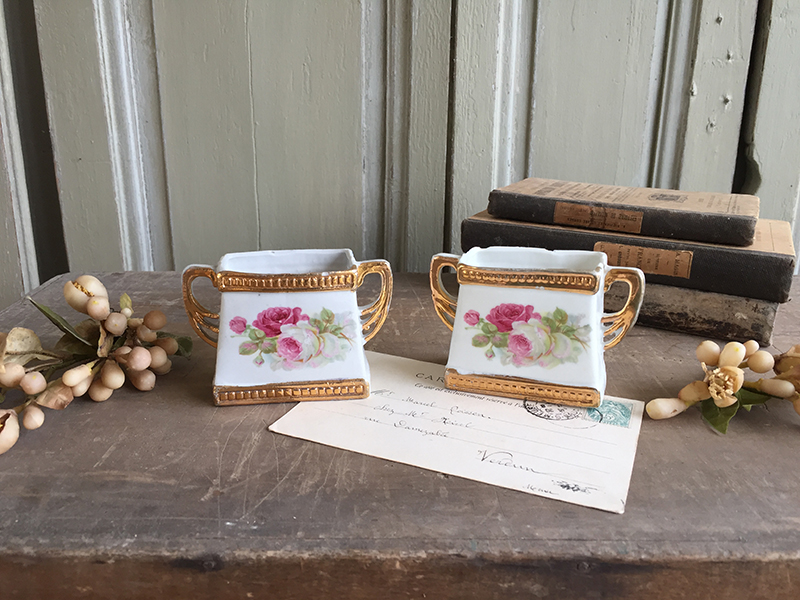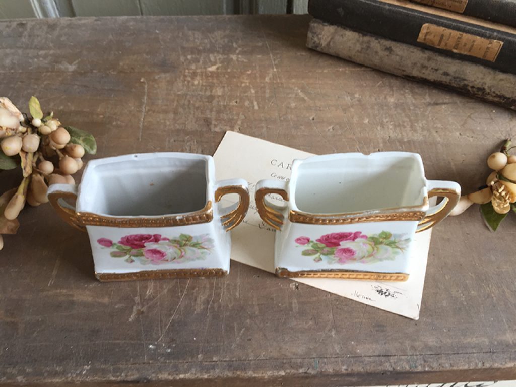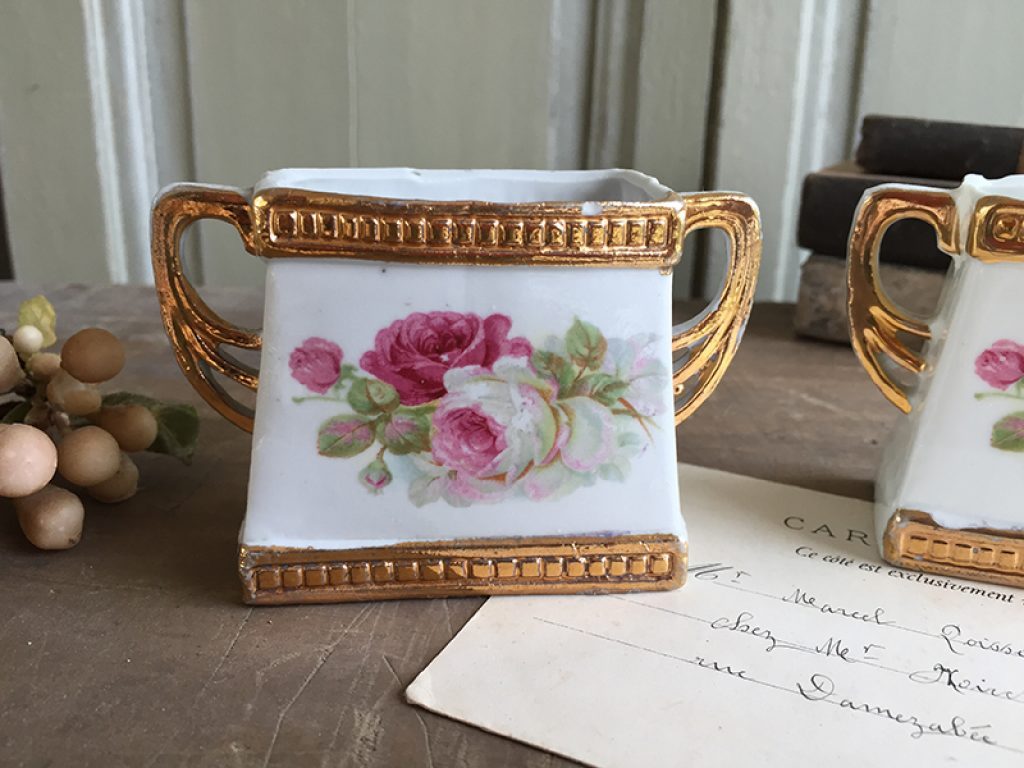 Lot de deux anciens vases taille mini, au joli décor de roses. Petits manques sur les bords supérieurs.