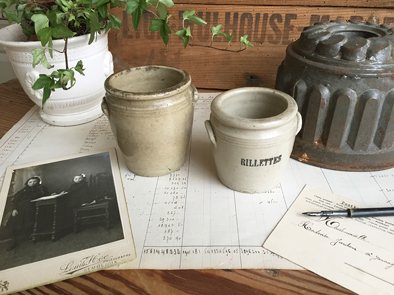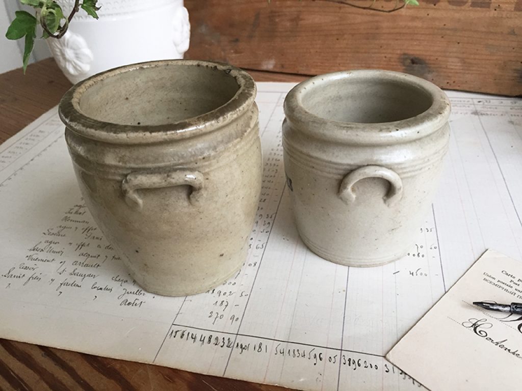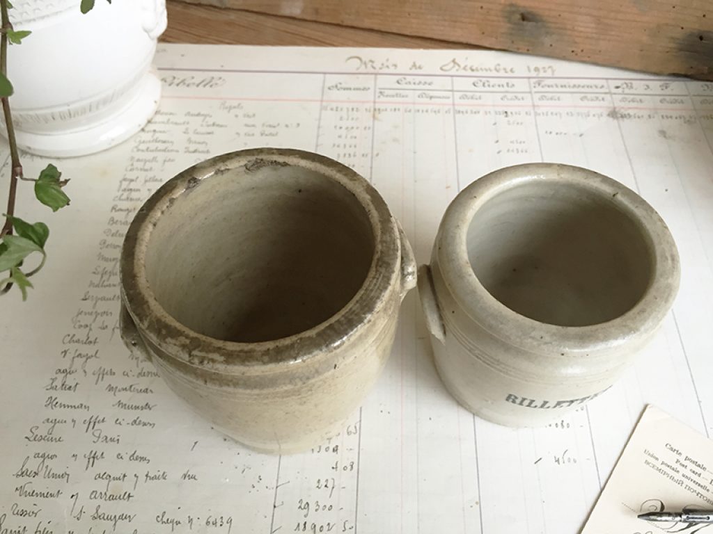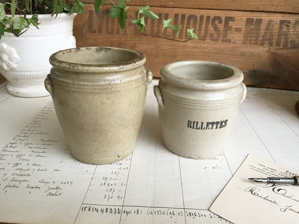 Lot de deux anciens pots en grés, dont un avec inscription « Rillettes  » sur une face. Hauteurs 7.5 et 9 cm