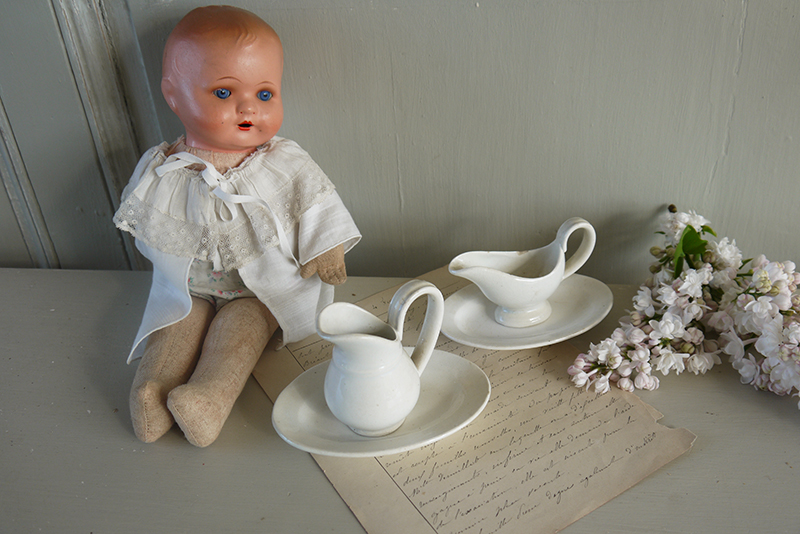 Anciens éléments de dinette en faïence blanche, composés de quatre pièces : 2 plats ovales, 1 pichet et 1 saucière.