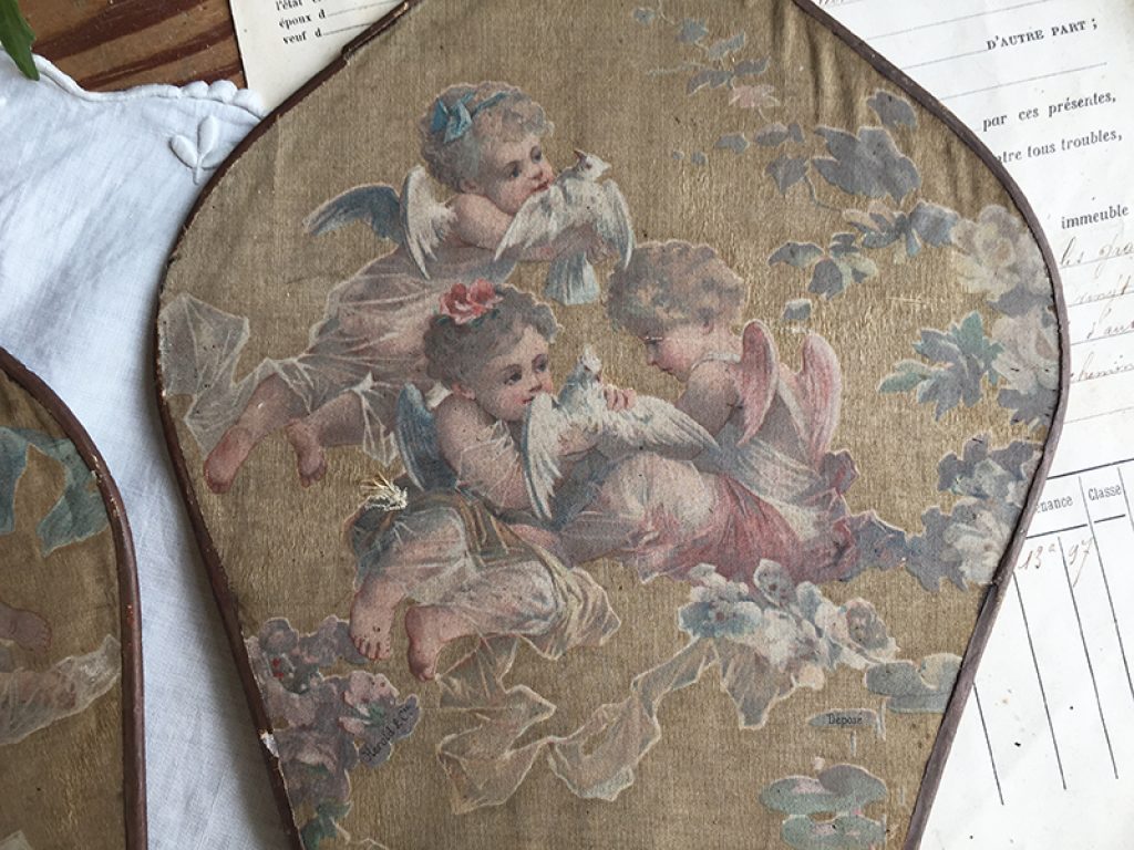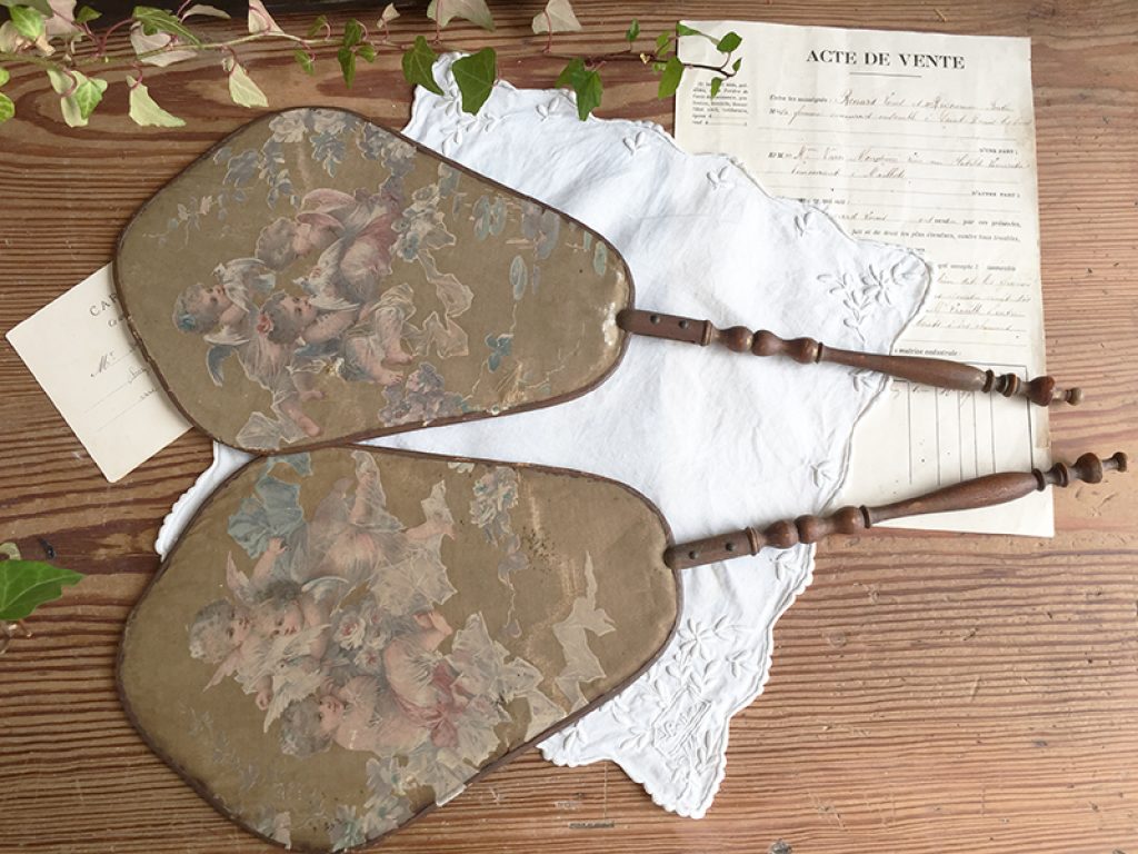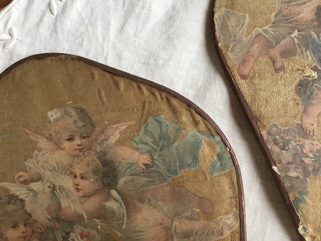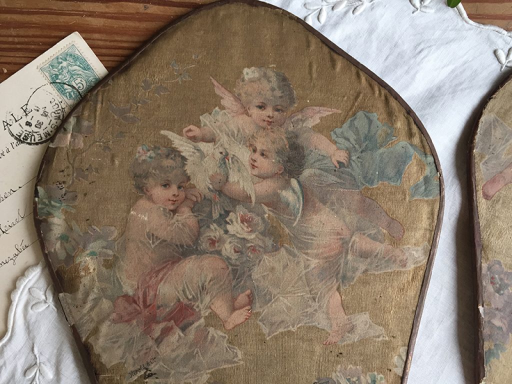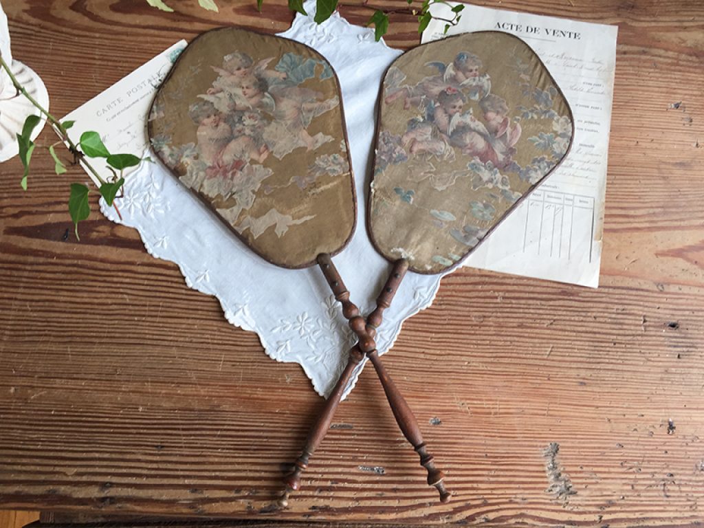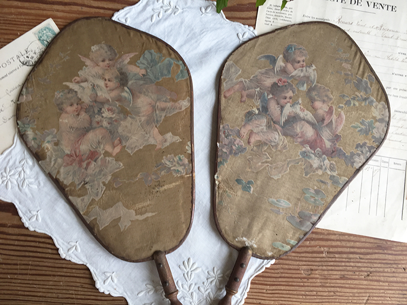Deux anciens écrans à main (éventails ) en soie imprimée collée sur papier aux très charmants décors d’angelots. Traces d’usure, taches, mais tellement jolis ! Manches en bois.