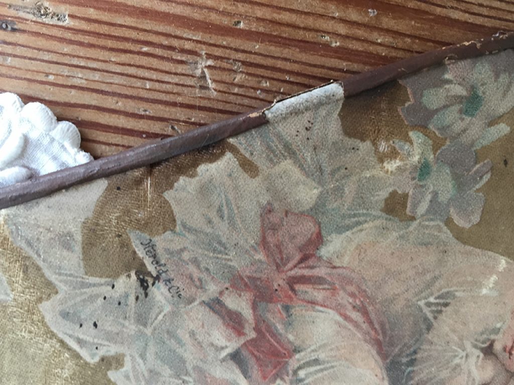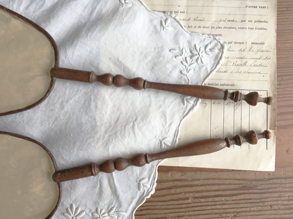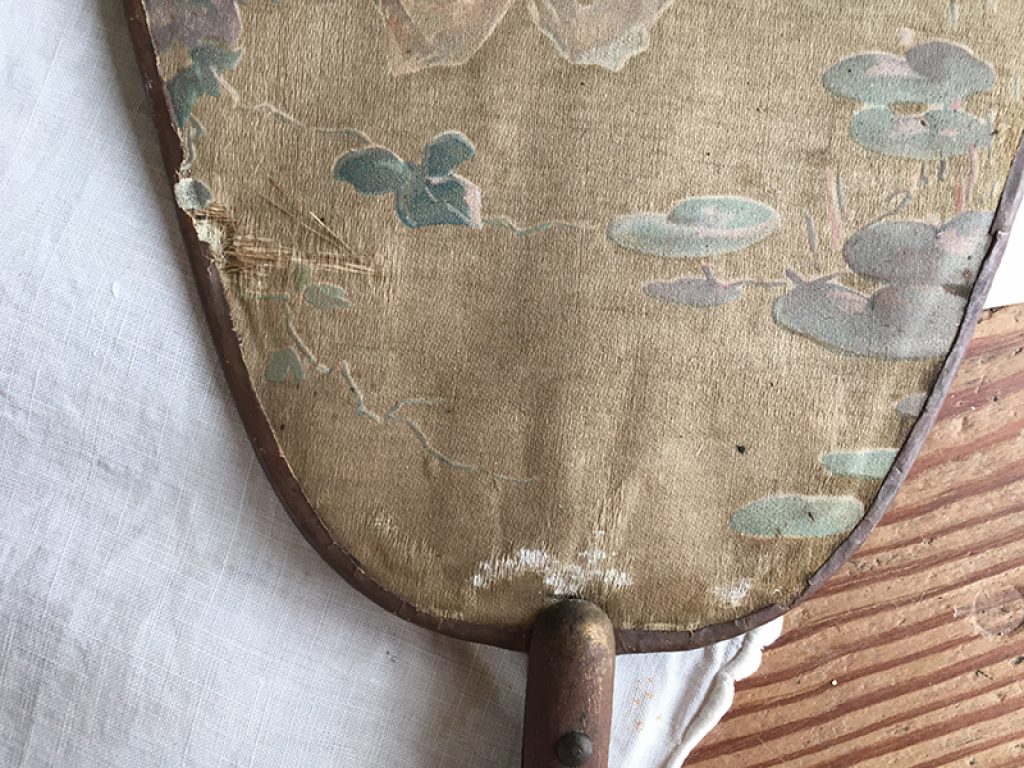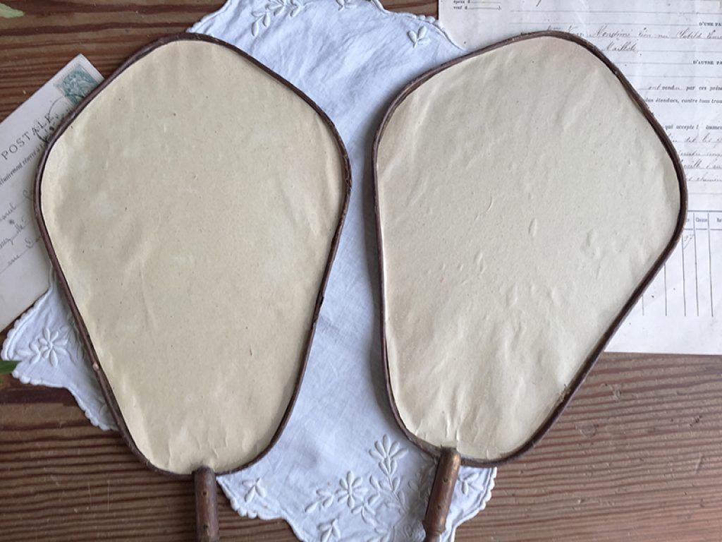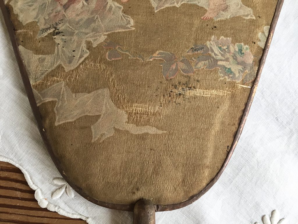Deux anciens écrans à main (éventails ) en soie imprimée collée sur papier aux très charmants décors d’angelots. Traces d’usure, taches, mais tellement jolis ! Manches en bois.