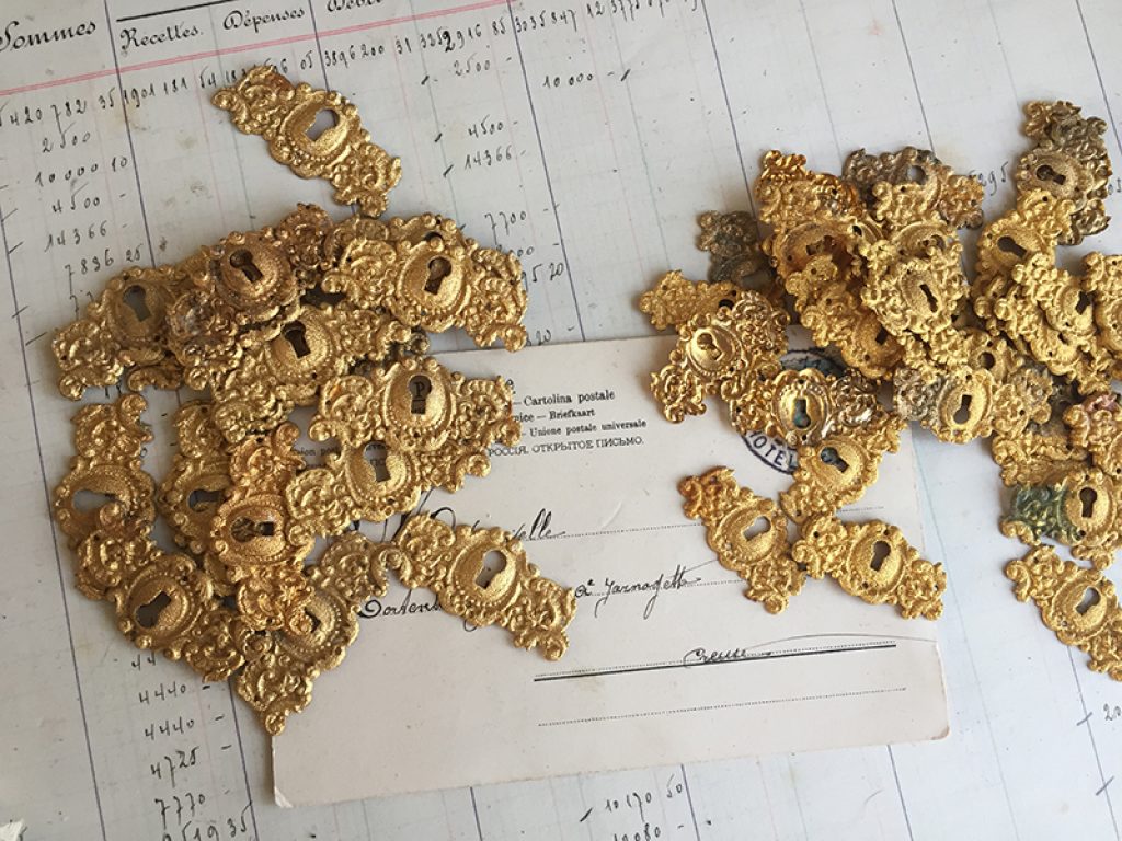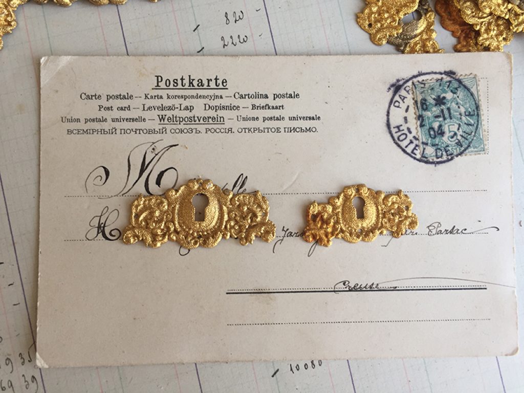Anciennes entrées de serrure pour petites boites de mercerie ou autre, provenant d’un stock de quincaillerie, jamais utilisées. Restées neuves mais certaines ont des traces d’oxydation dues à un long stockage. Vendues à l’unité, à clouer