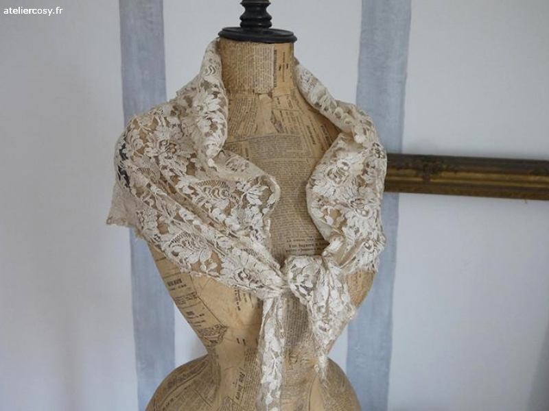 Ancienne étole ou châle en dentelle, très élégante sur mannequin en déco de charme ! Plusieurs taches de rouille, petits trous discrets possible