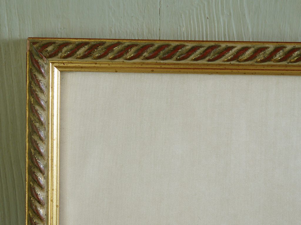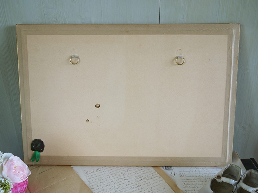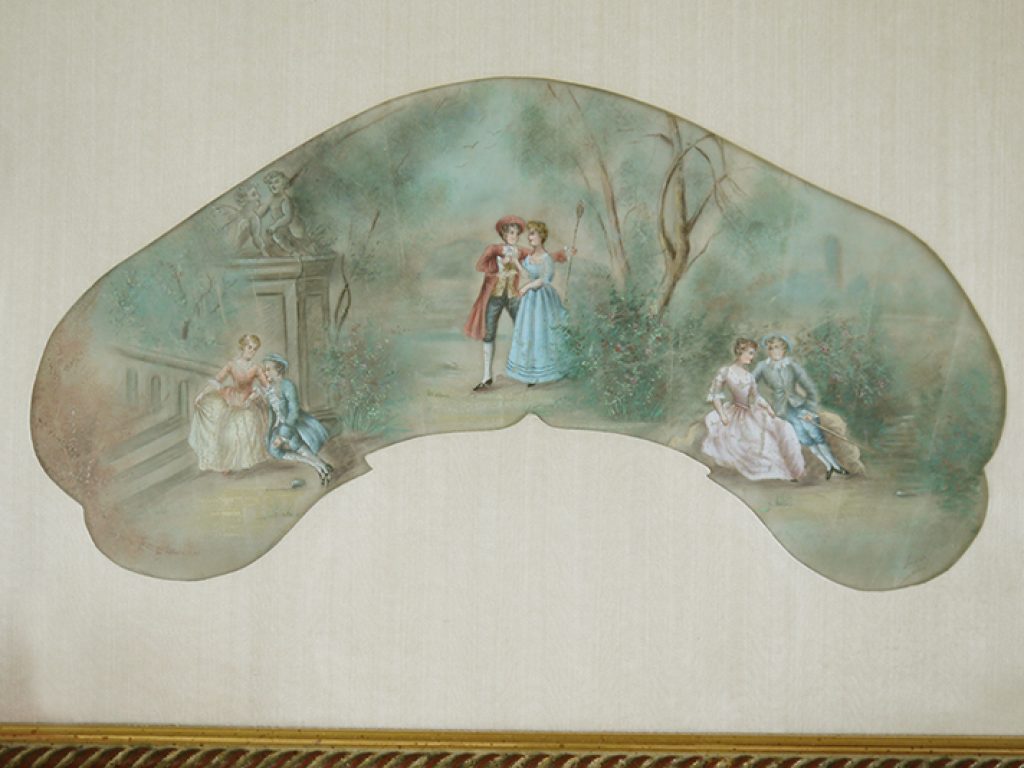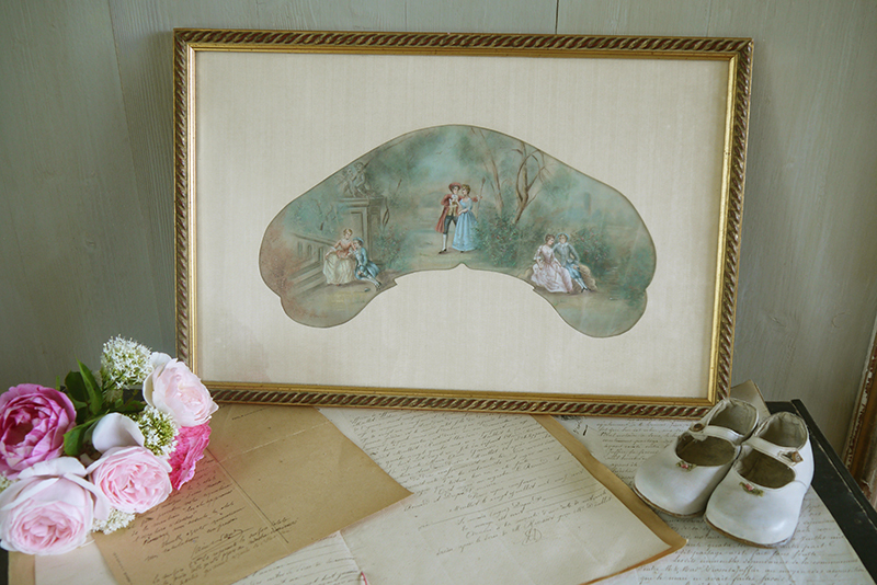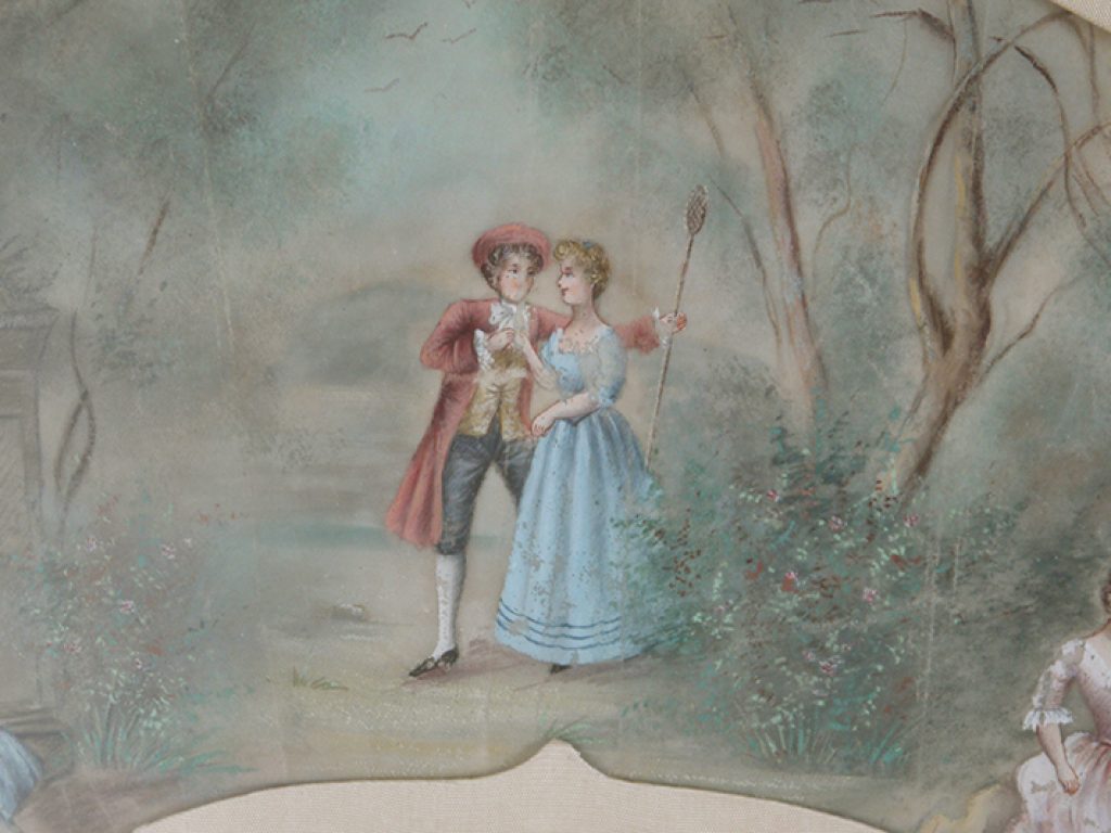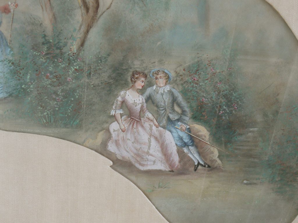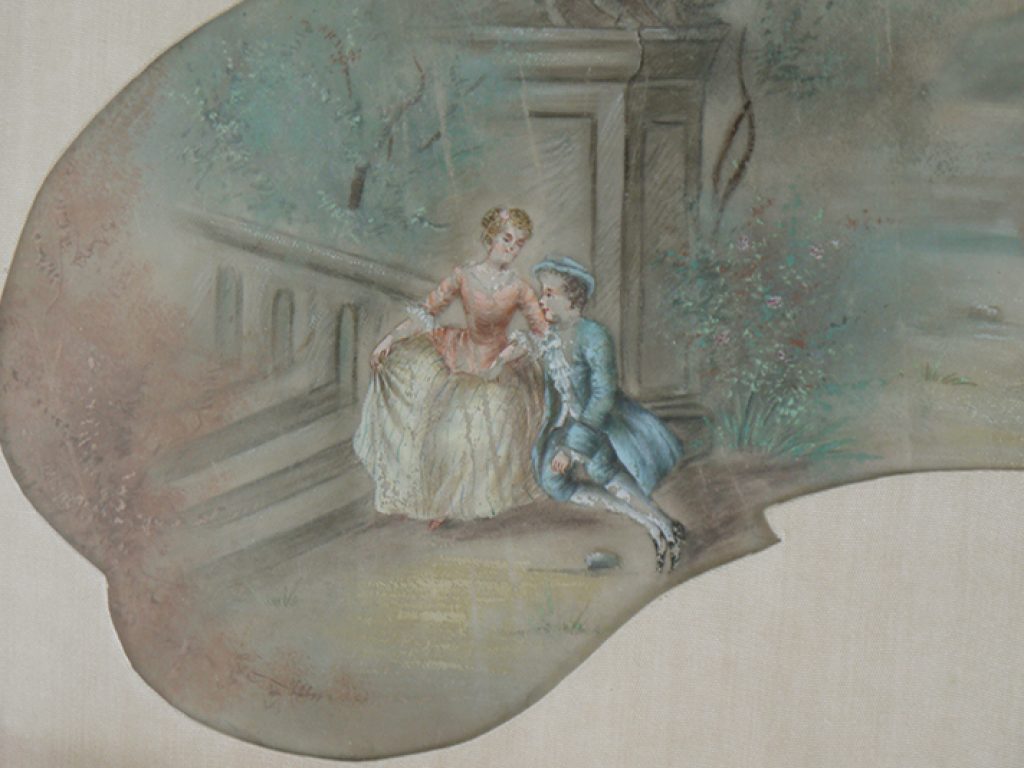 Ancien éventail ou projet d’éventail dans un cadre avec passe partout en tissu moiré. Joli décor de personnages peint à la main.
