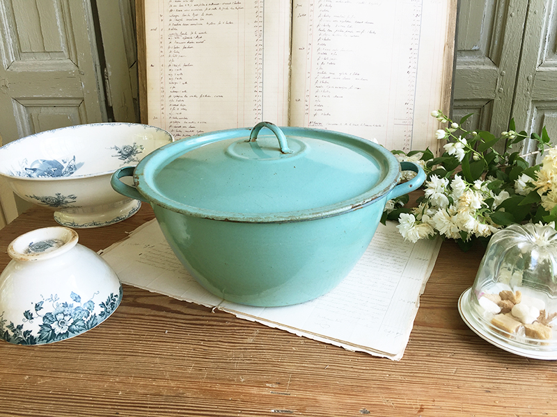 Ancien faitout émaillé d’une jolie couleur bleu turquoise, comportant des petits manques dûs à son âge.
