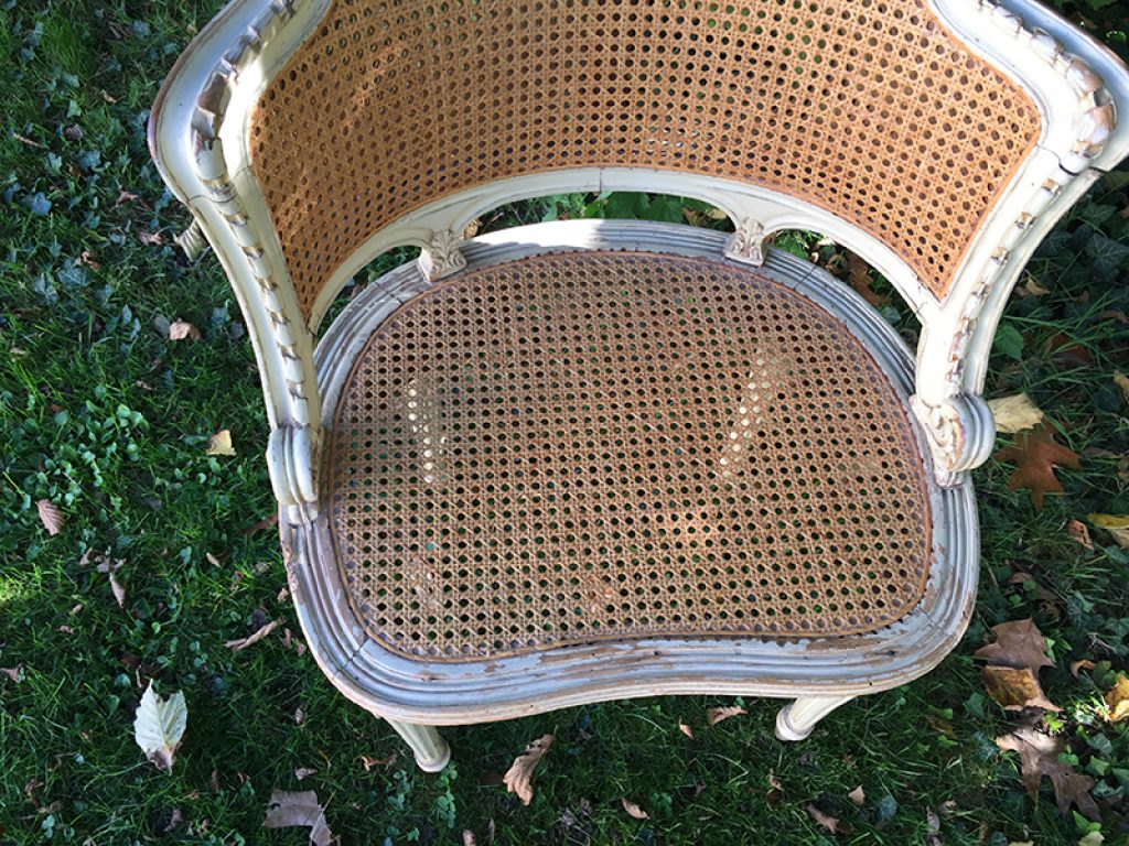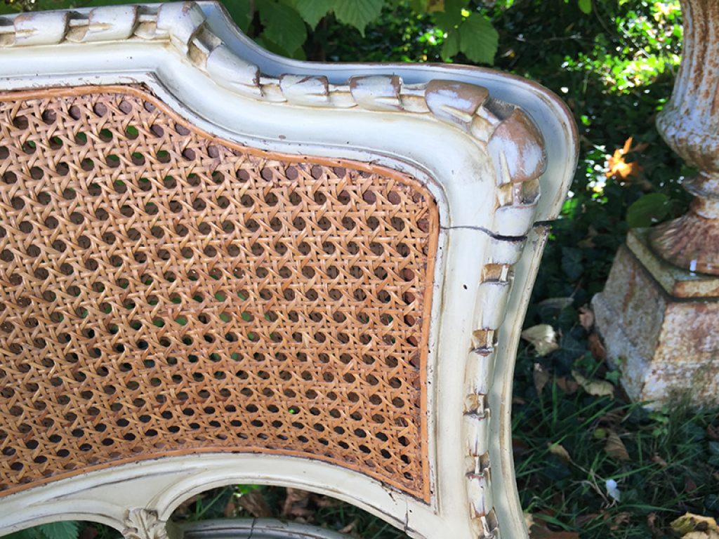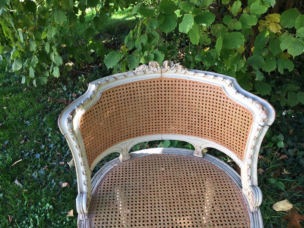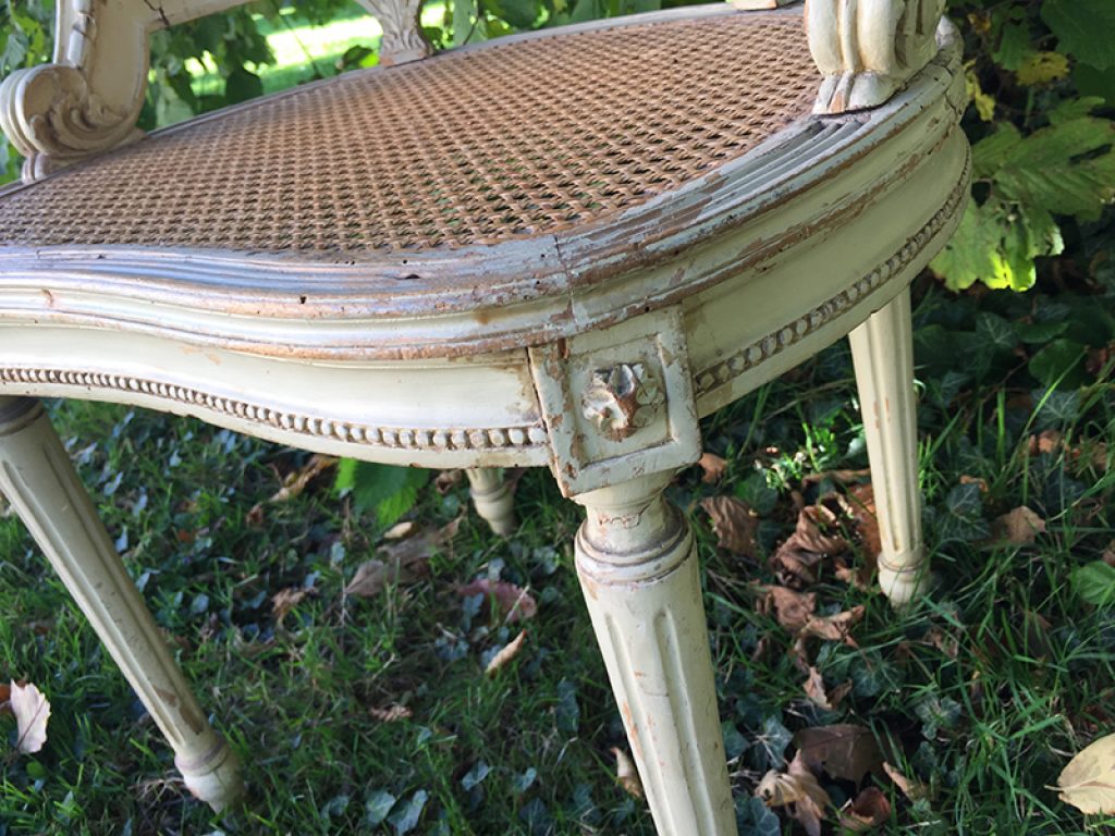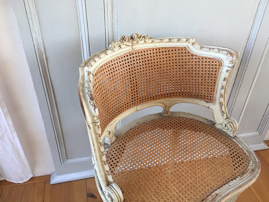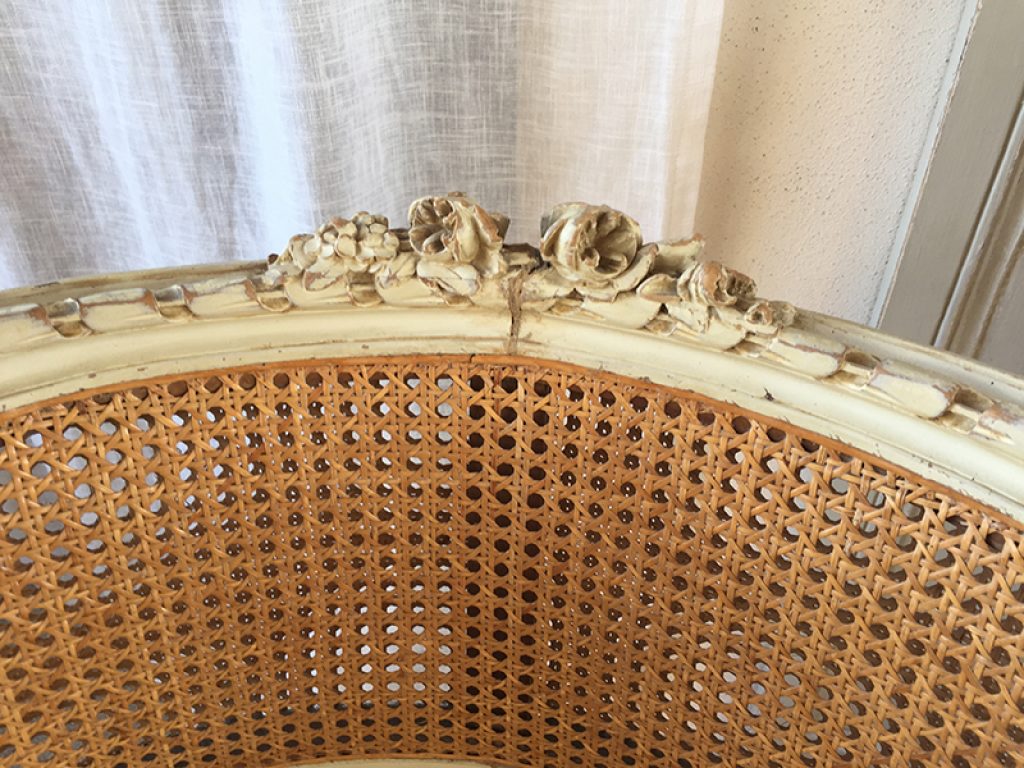 Elégant fauteuil ancien dans sa patine d’origine couleur ivoire, en bon état général. Jolis décor de roses en bois sculpté. Cannage en bon état.
