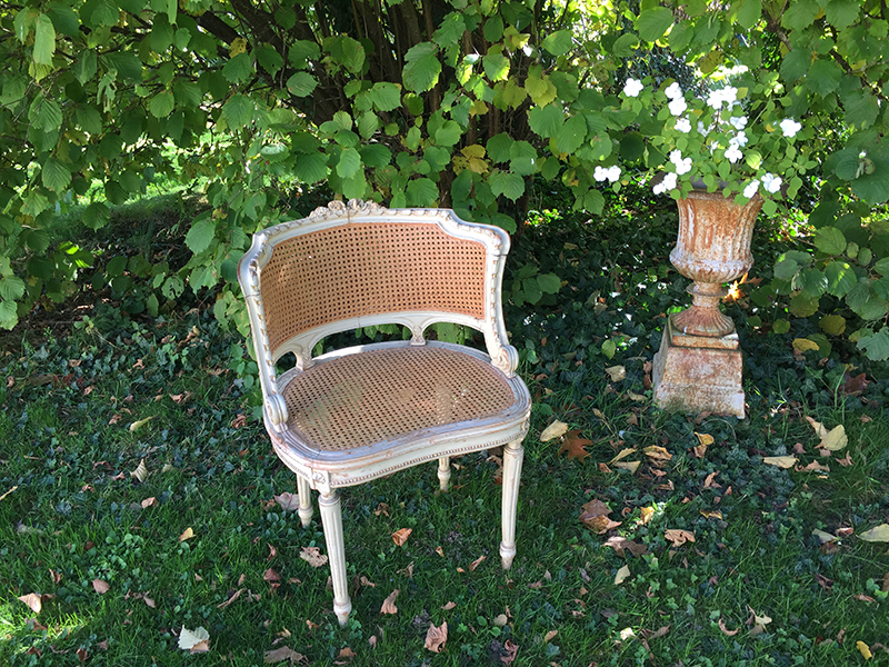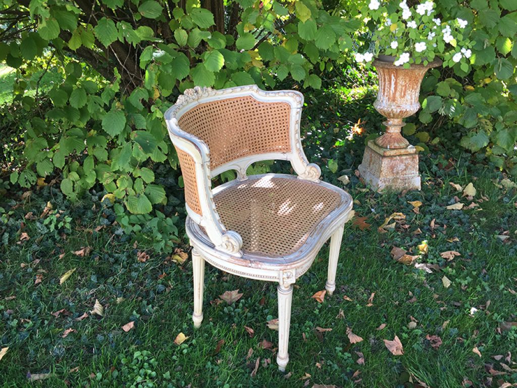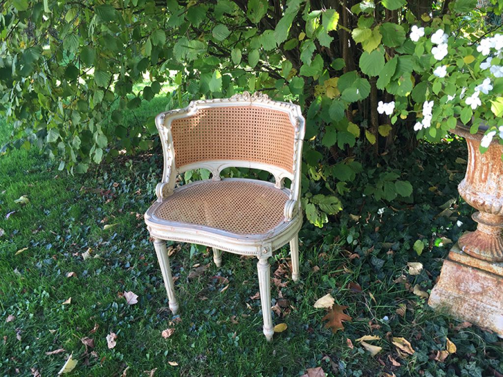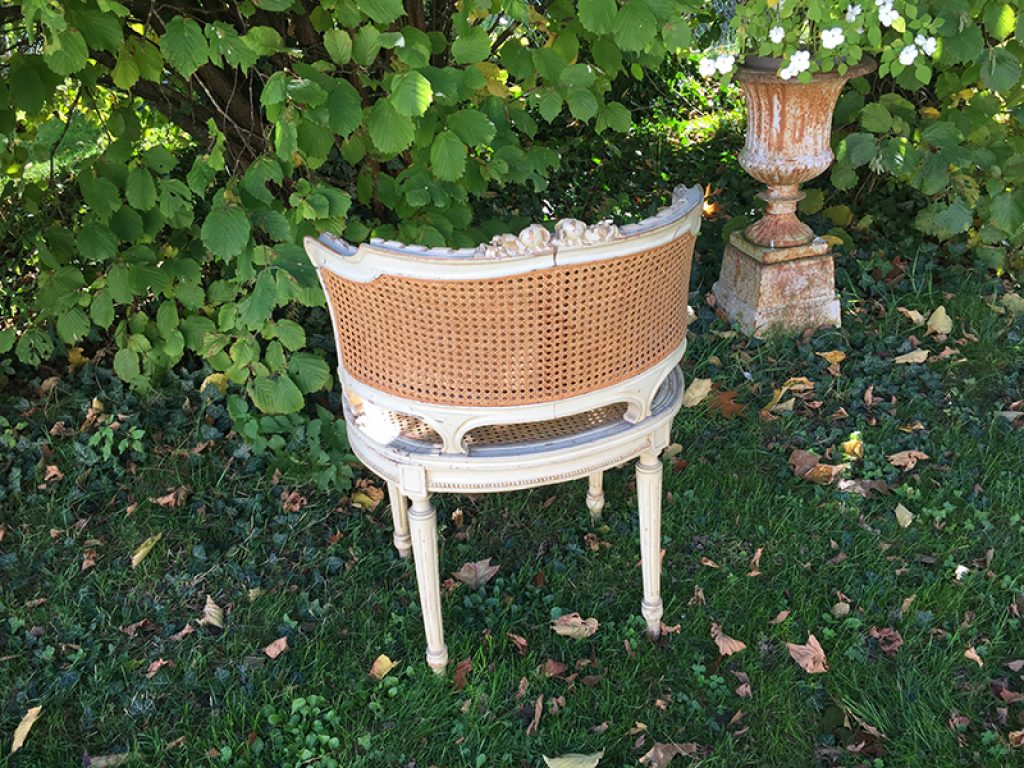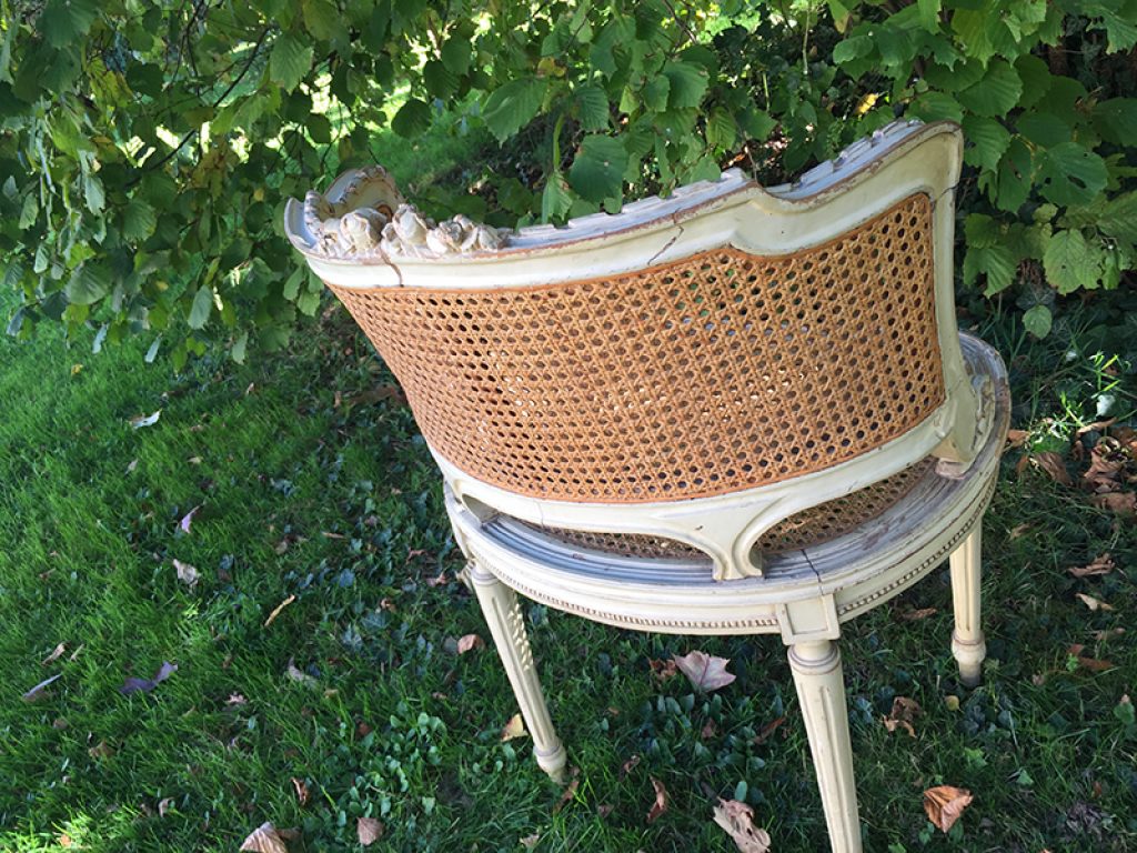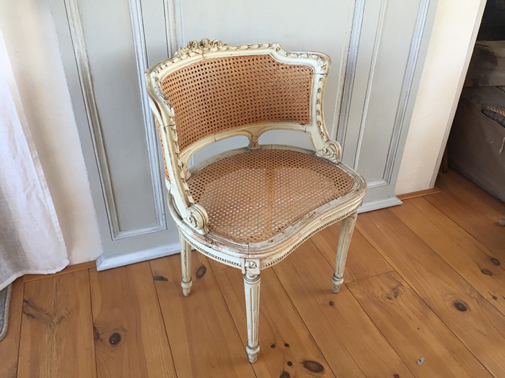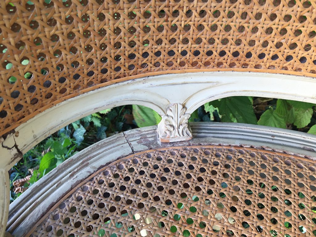 Elégant fauteuil ancien dans sa patine d’origine couleur ivoire, en bon état général. Jolis décor de roses en bois sculpté. Cannage en bon état.
