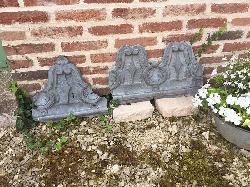 Deux anciens fragments de frise en zinc, vendu séparément. Traces d’usage, fissures. Pour déco d’intérieur ou de jardin