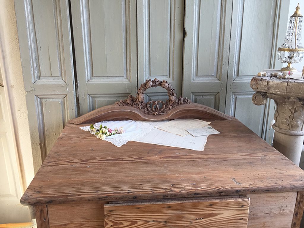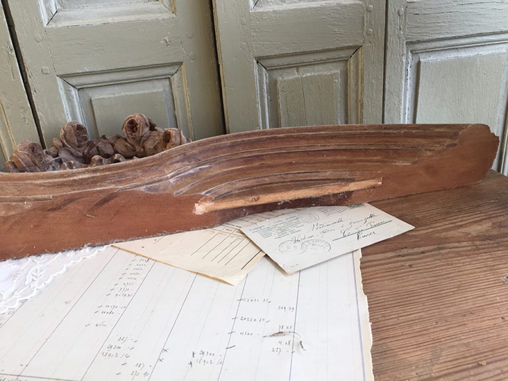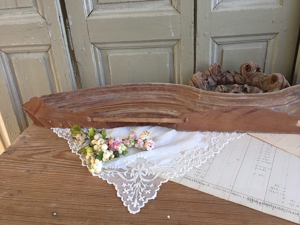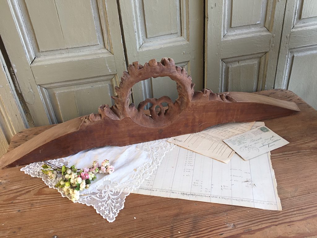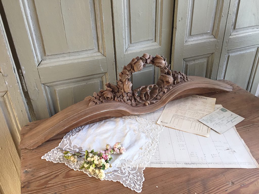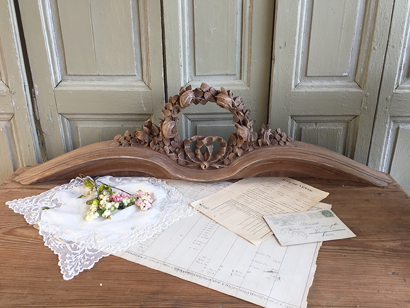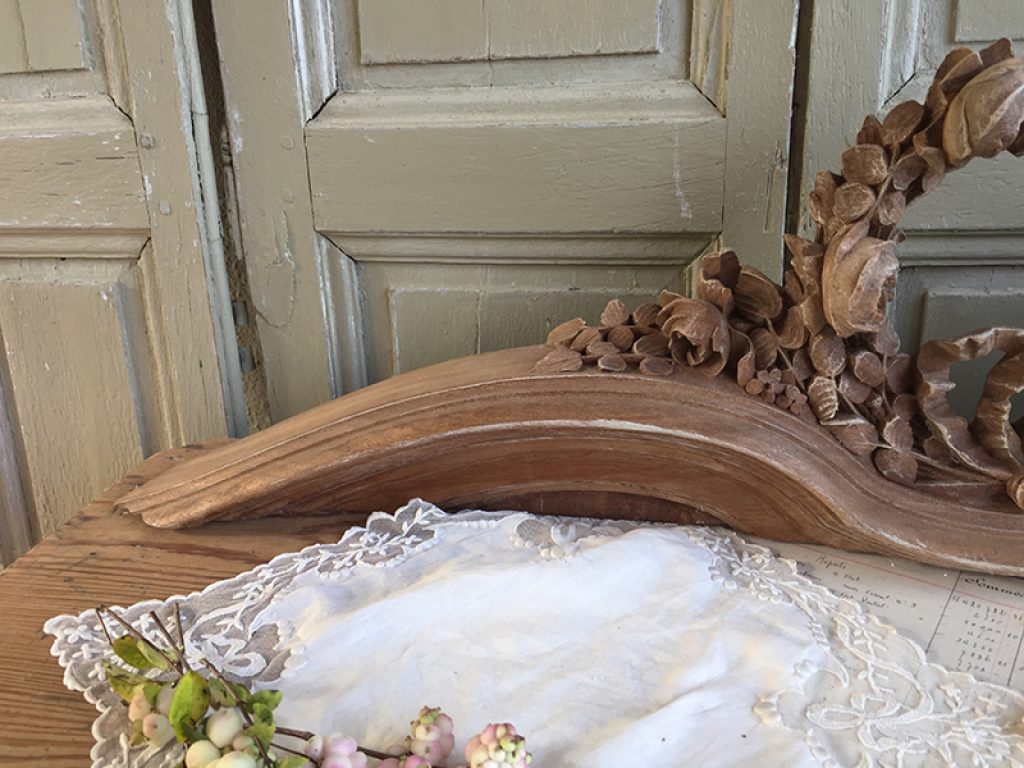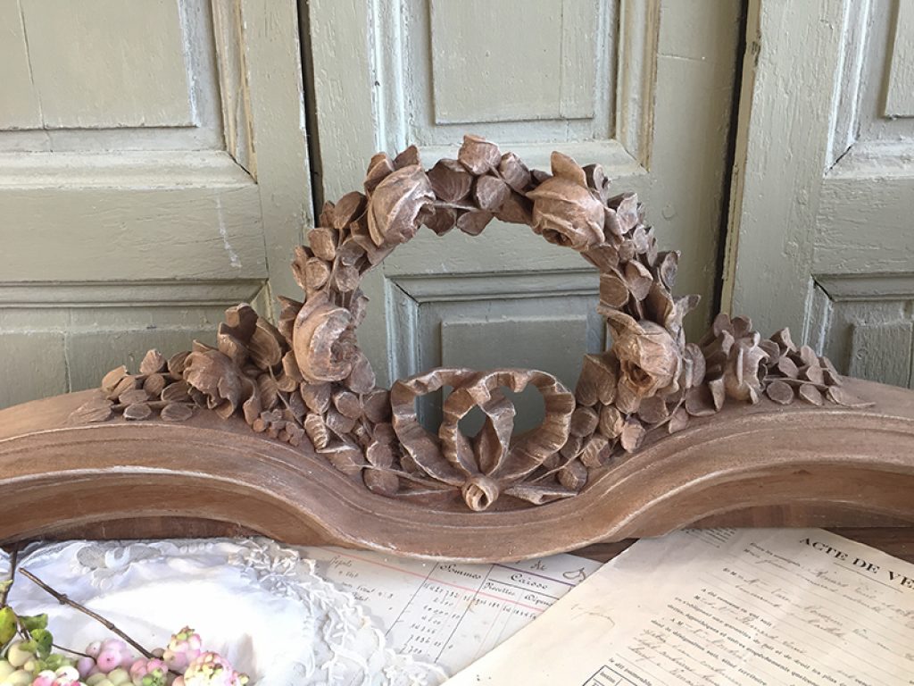 Ancienne boiserie laissée bois naturel légèrement blanchie, à poser sur un meuble. Joli décor de guirlande de roses et noeud, style Louis XVI.
