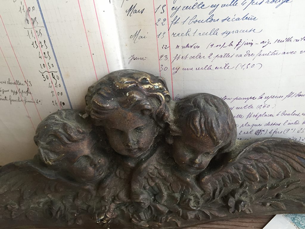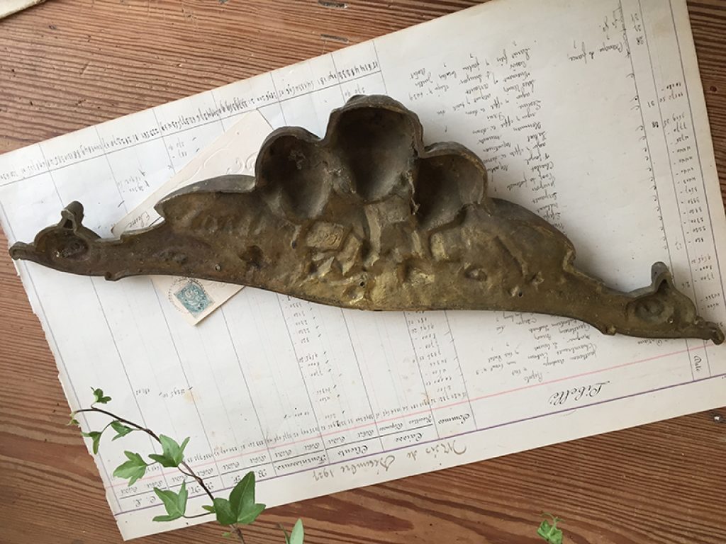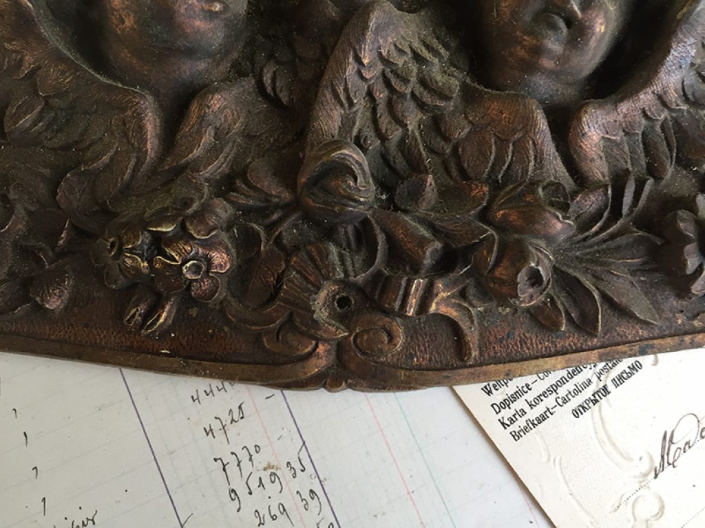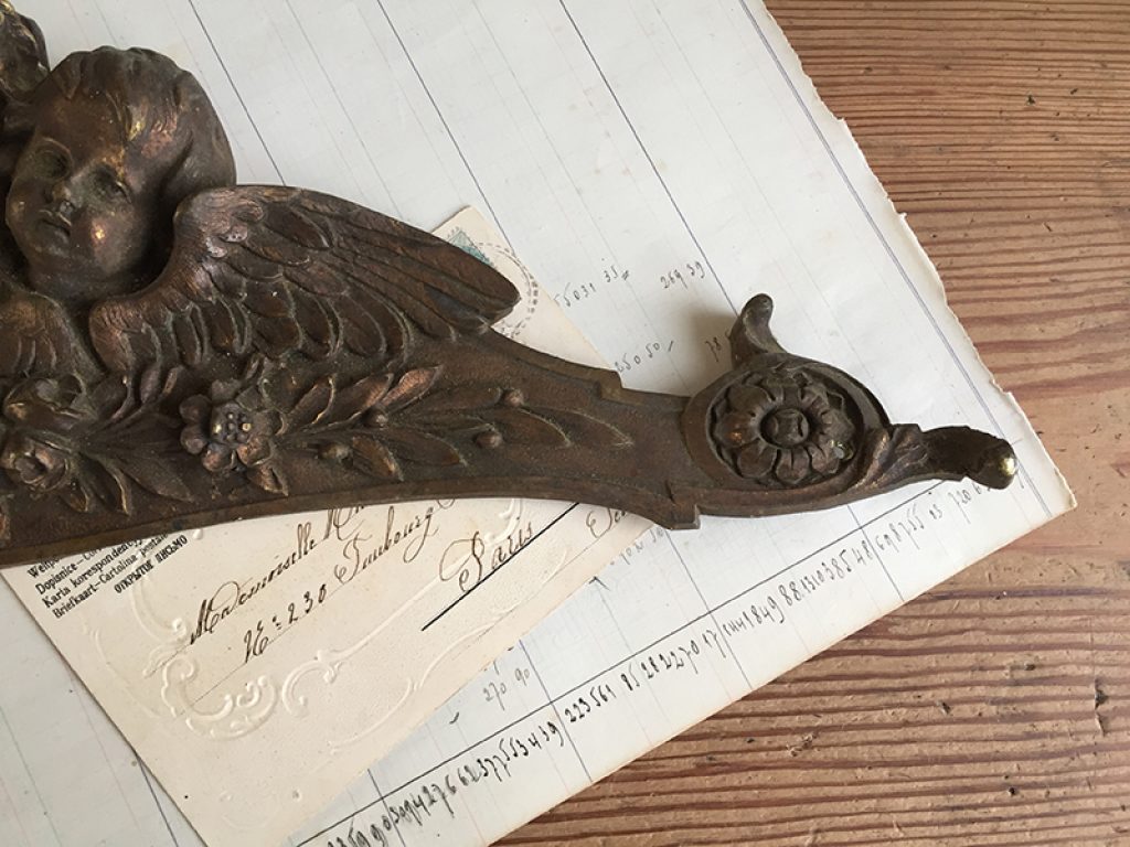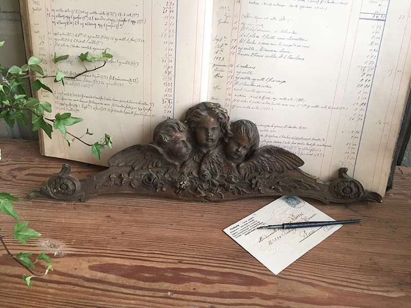 Elégant fronton ancien en métal patiné par le temps, au joli décor peu courant d’anges et de fleurs, parfait en déco shabby !