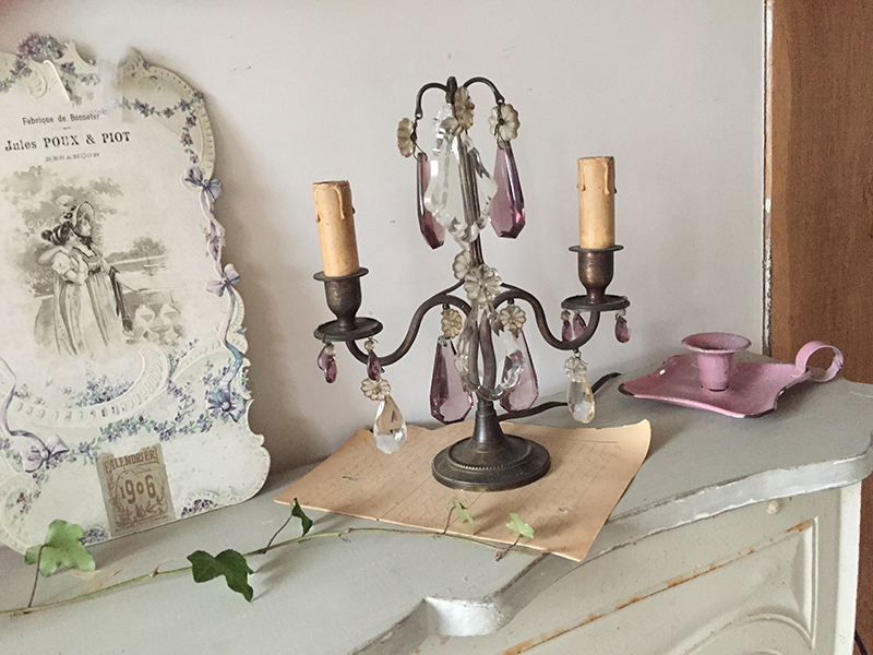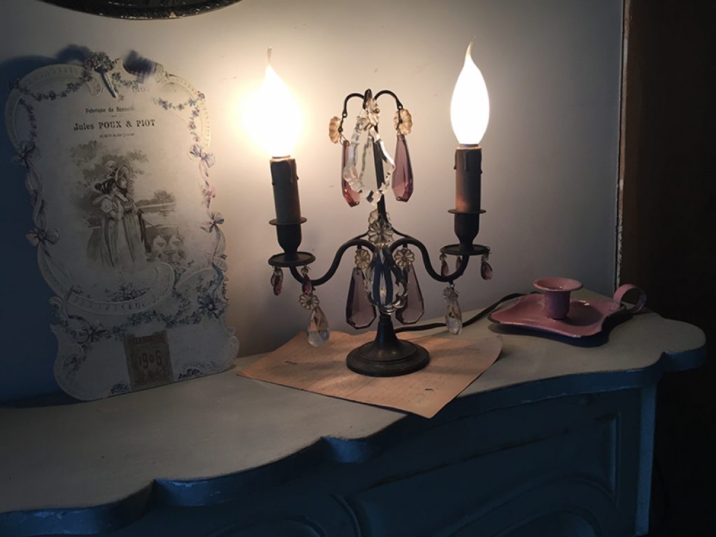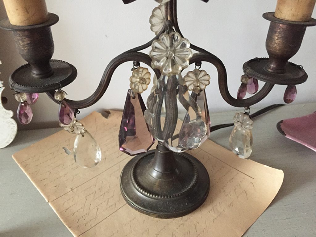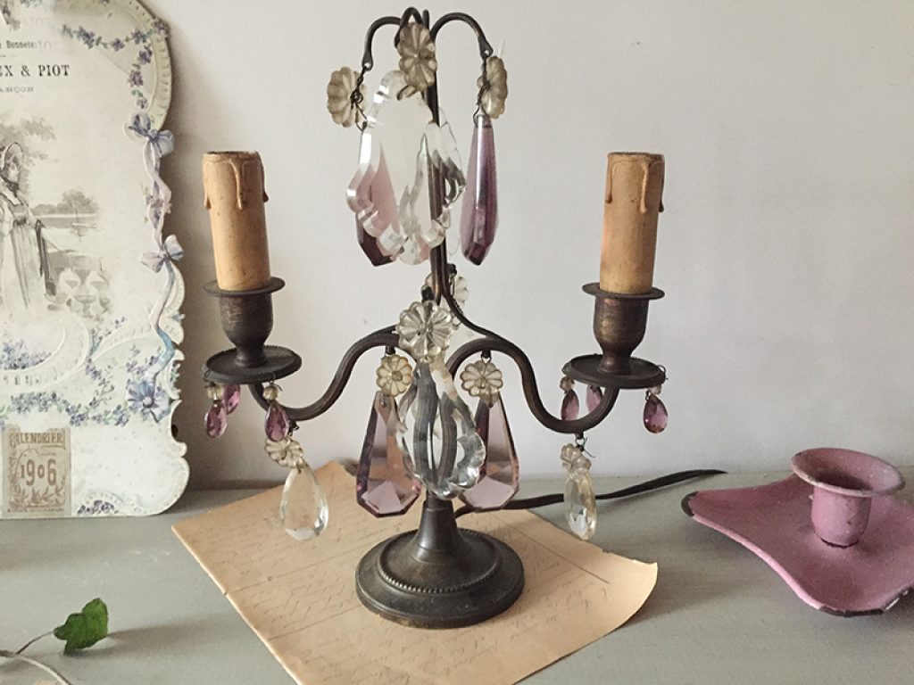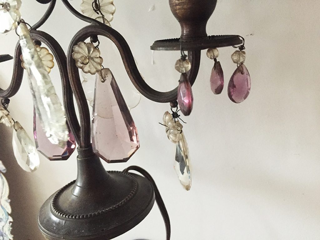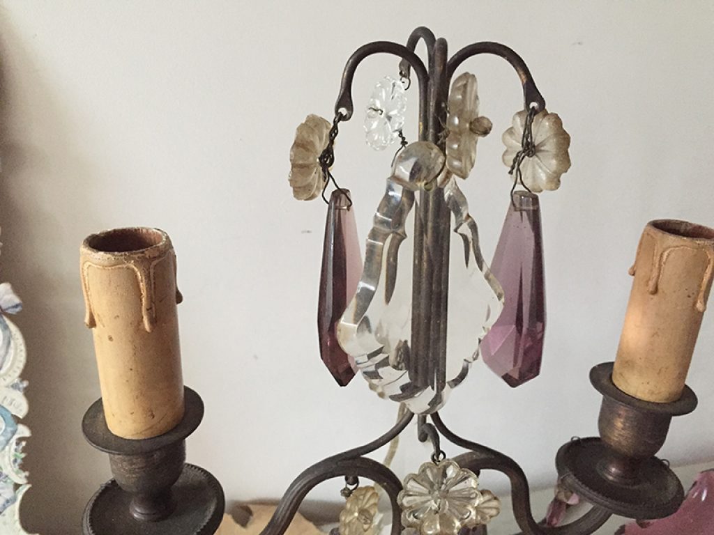 Ancienne lampe girandole avec toutes ses pampilles dont certaines sont mauves, en bon état général. Prise remplacée