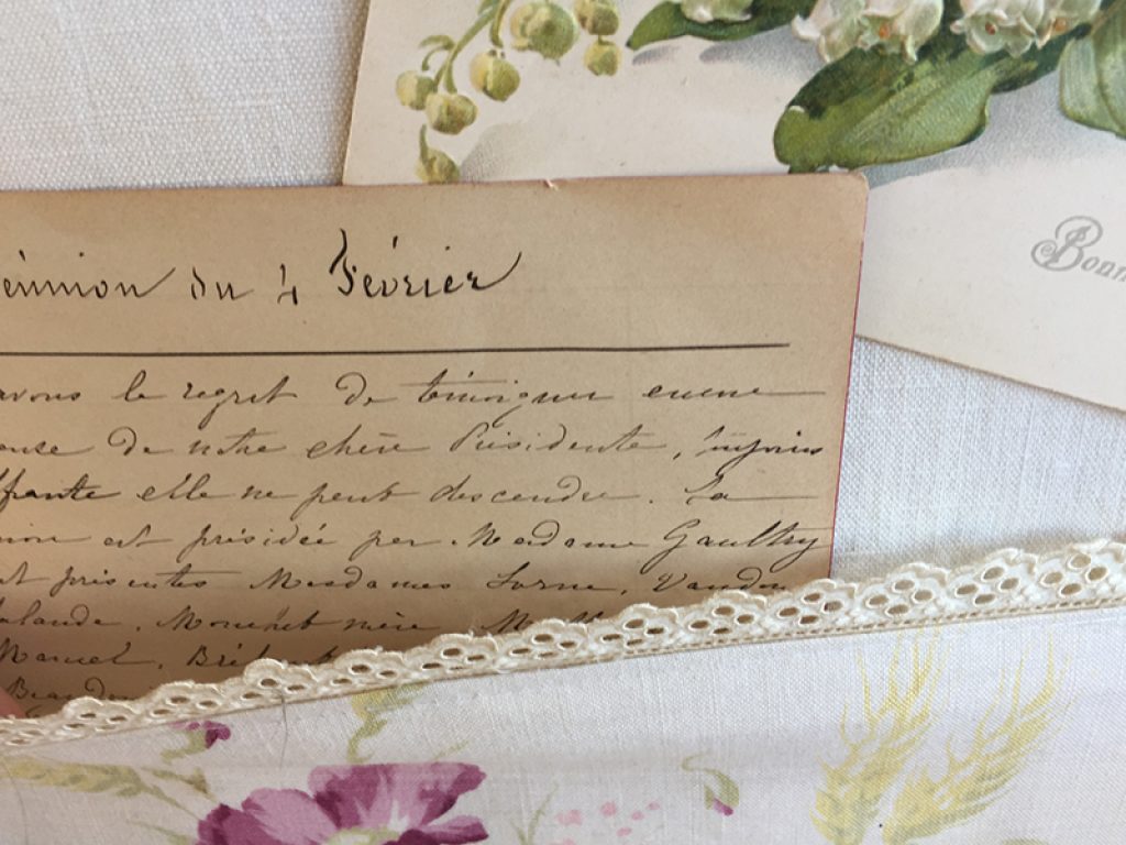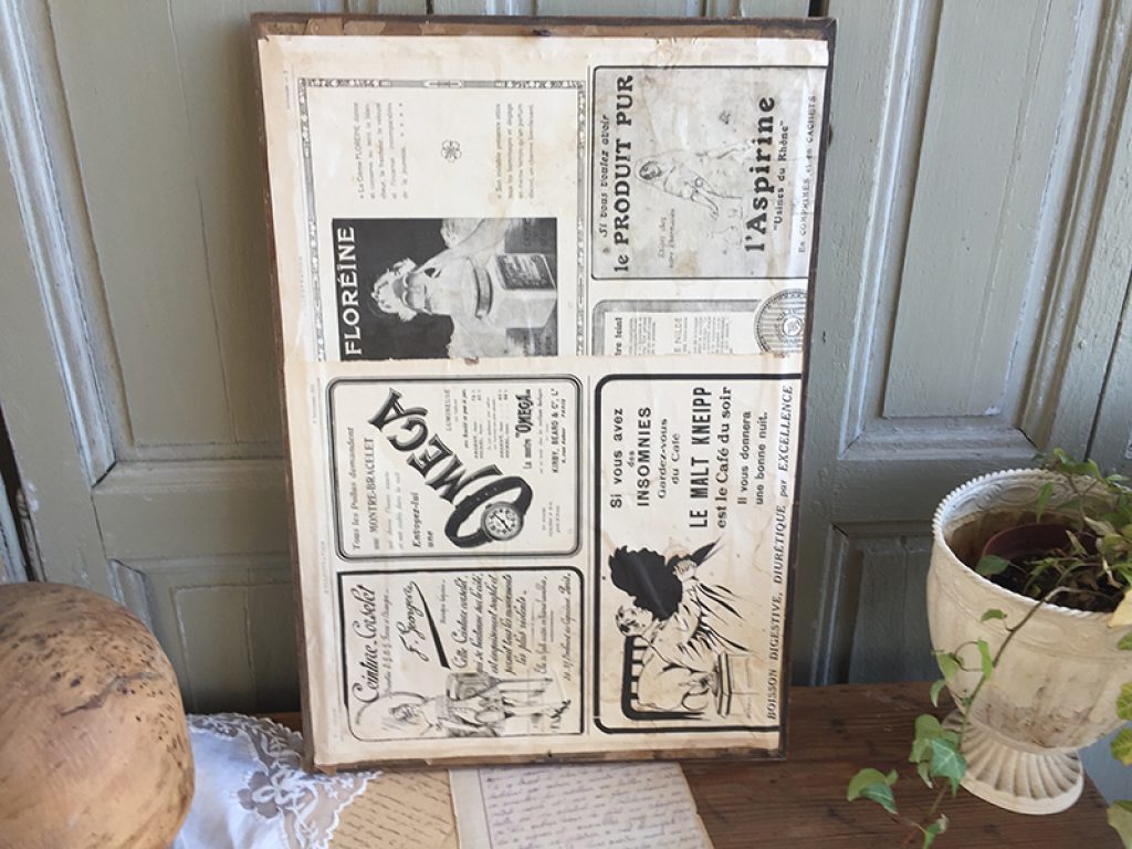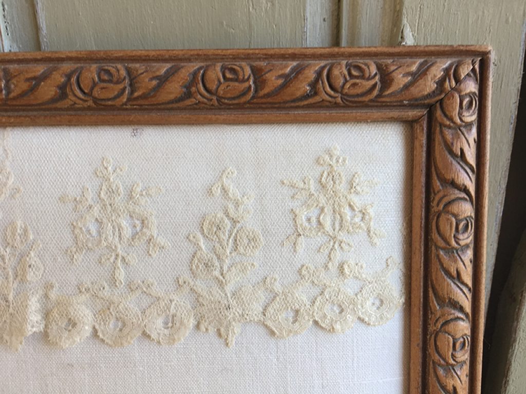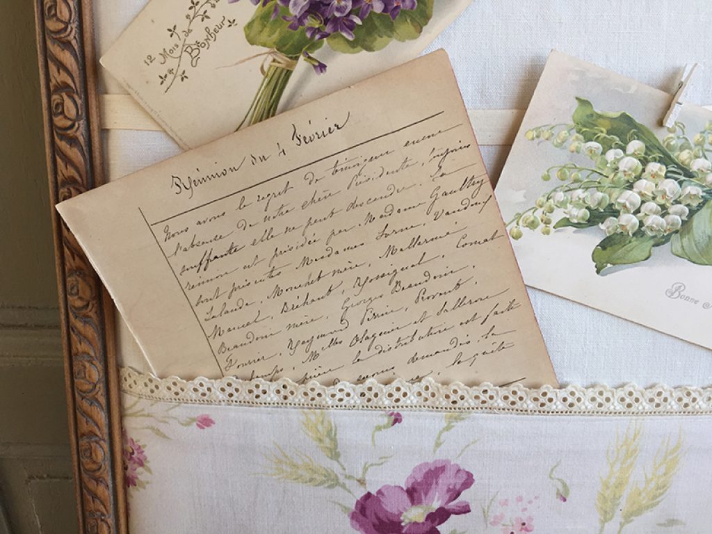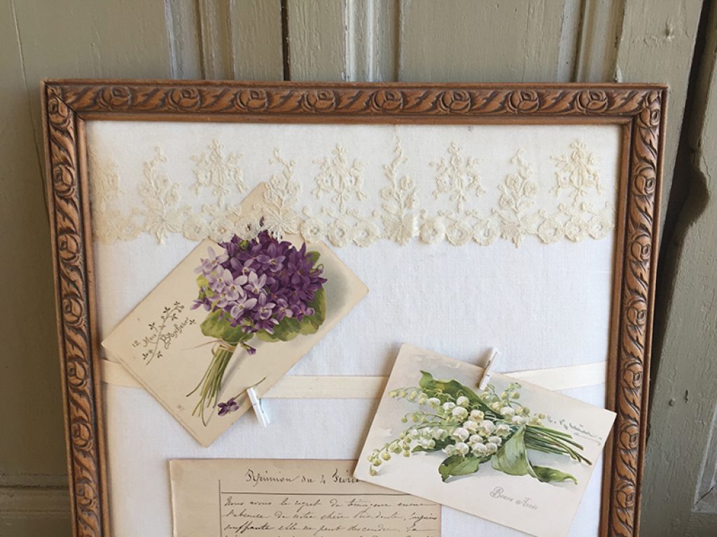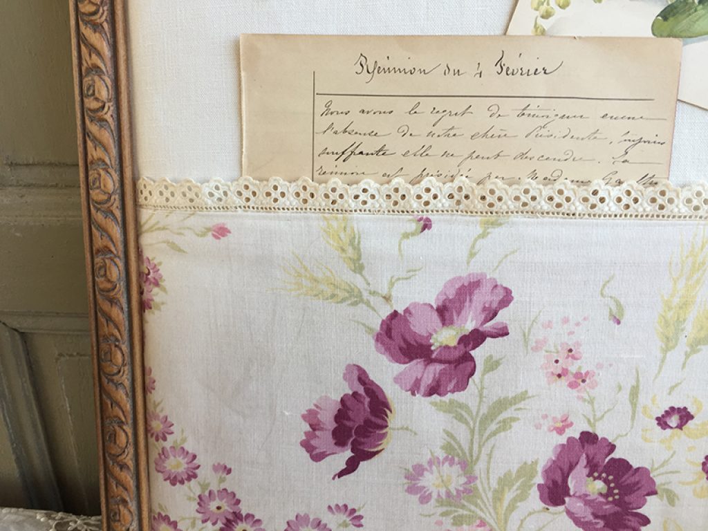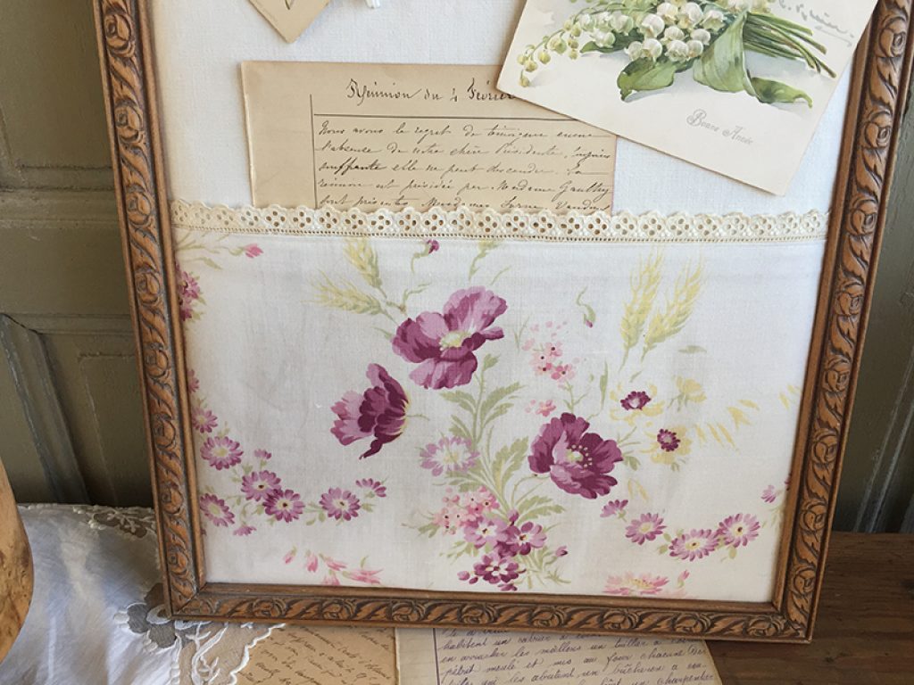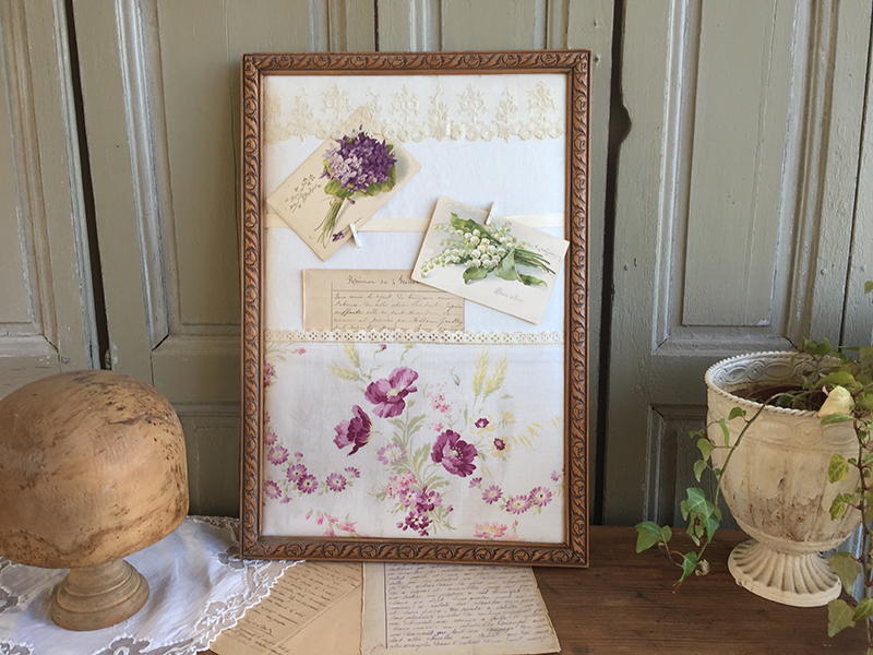 Vide poche / pèle mêle mural réalisé avec des matériaux anciens : Cadre , drap, tissu fleuri, dentelle, garni de deux cartes postales et une page manuscrite d’époque. On peut glisser du courrier ou des papiers sous le tissu imprimé. Les cartes peuvent être remplacées par des photos. Création maison